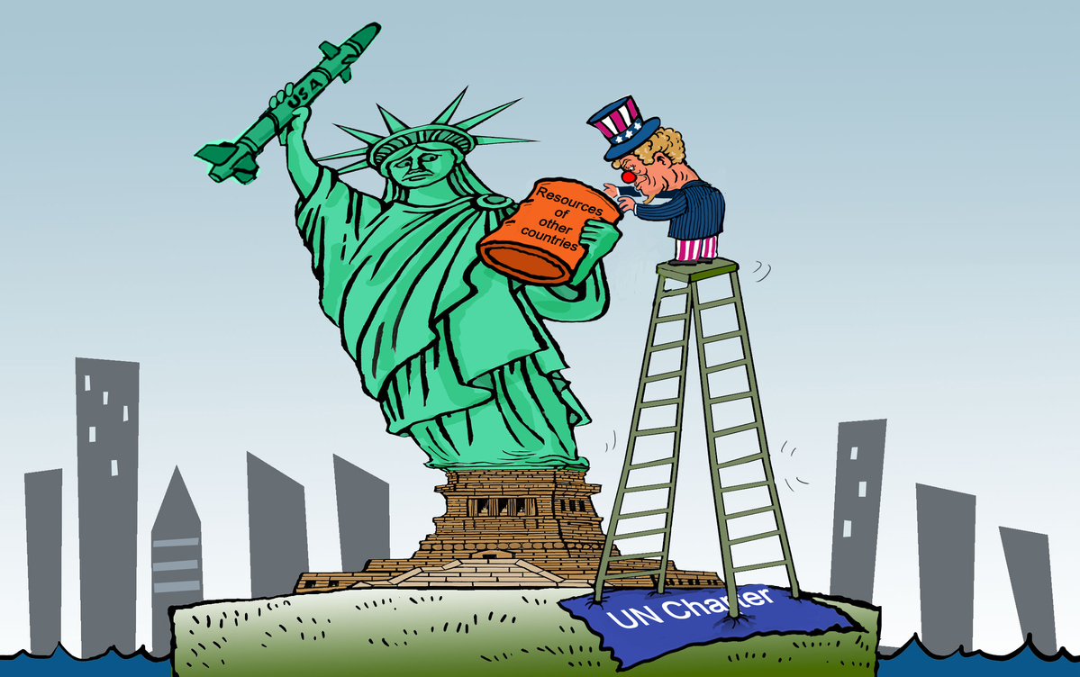 美国践踏联合国宪章,肆意掠夺他国资源,其自由民主形象尽毁