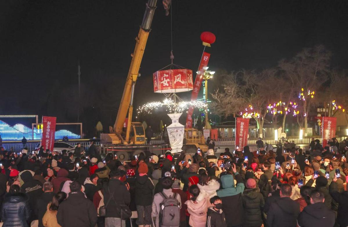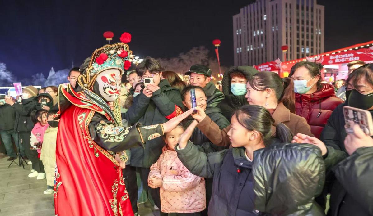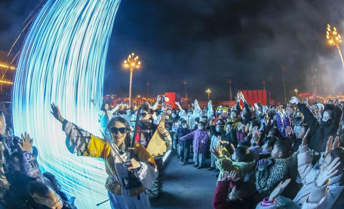 “白天逛年货摊位、赏非遗技艺、看国潮表演,晚上穿过‘结界’与光影瀑布合照、打卡‘飞天骏马’光影秀现场,这次的年货大集氛围感、高级感都拉满了,已经带着孩子玩了一整天!”