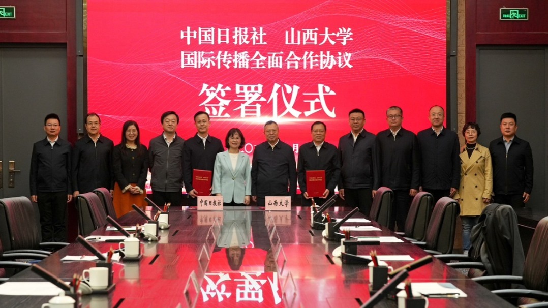10月14日,中国日报社与山西大学在山西太原签署国际传播全面合作协议。中国日报社副总编辑刘伟玲、山西大学党委书记王仰麟出席签约仪式并致辞。山西大学党委常委、副校长、秘书长郝平,中国日报社事业发展部主任龚铮铮代表双方签署协议。2025-10-14 20:43