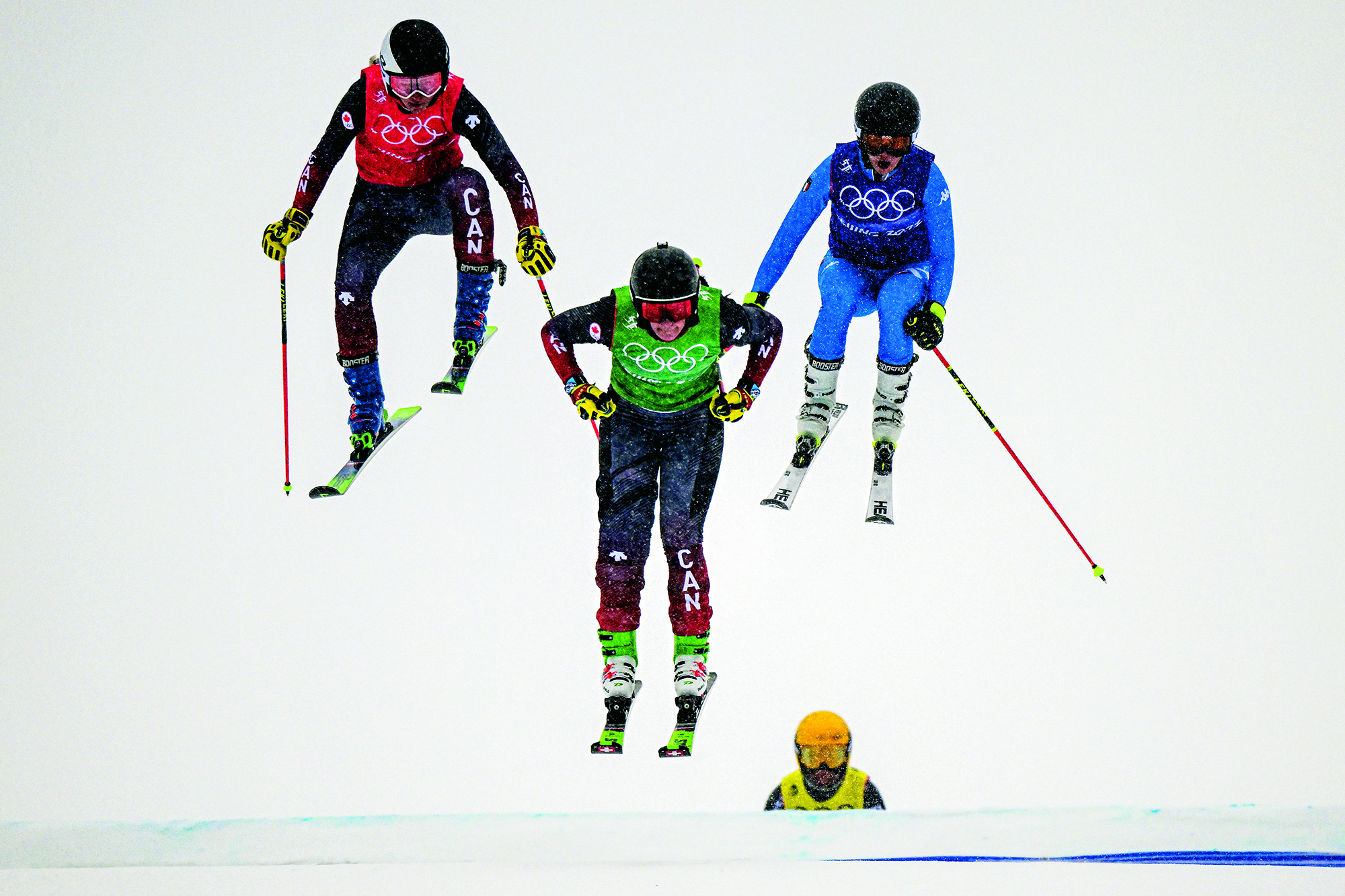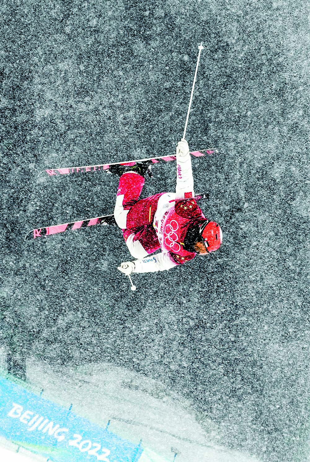 2022年1月30日,河北省张家口市,中国选手赵洋在云顶滑雪公园冒着大雪训练,备战即将开幕的北京2022年冬奥会
