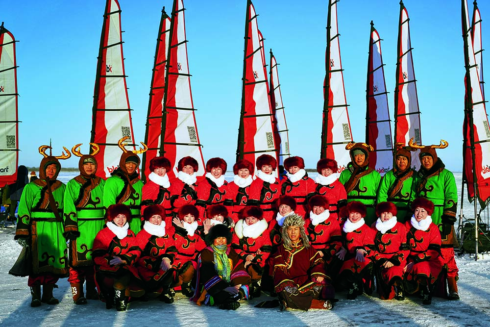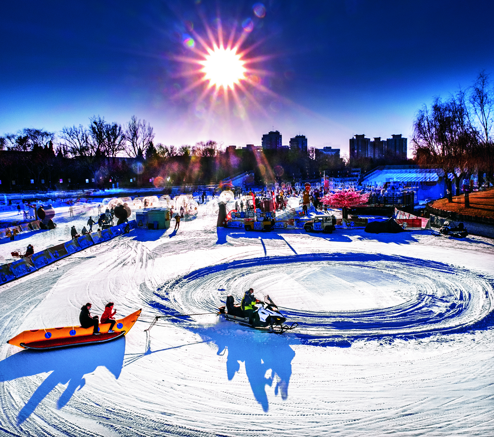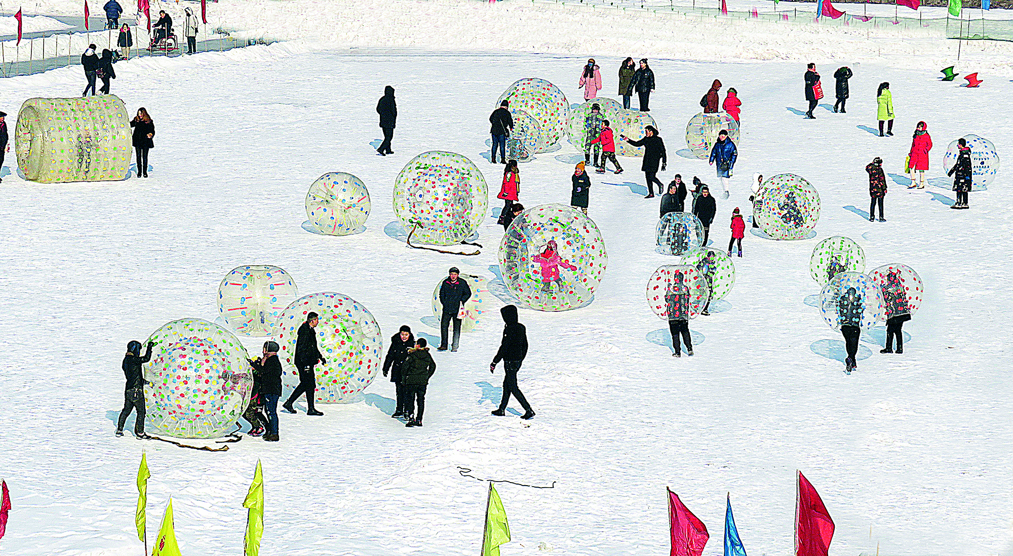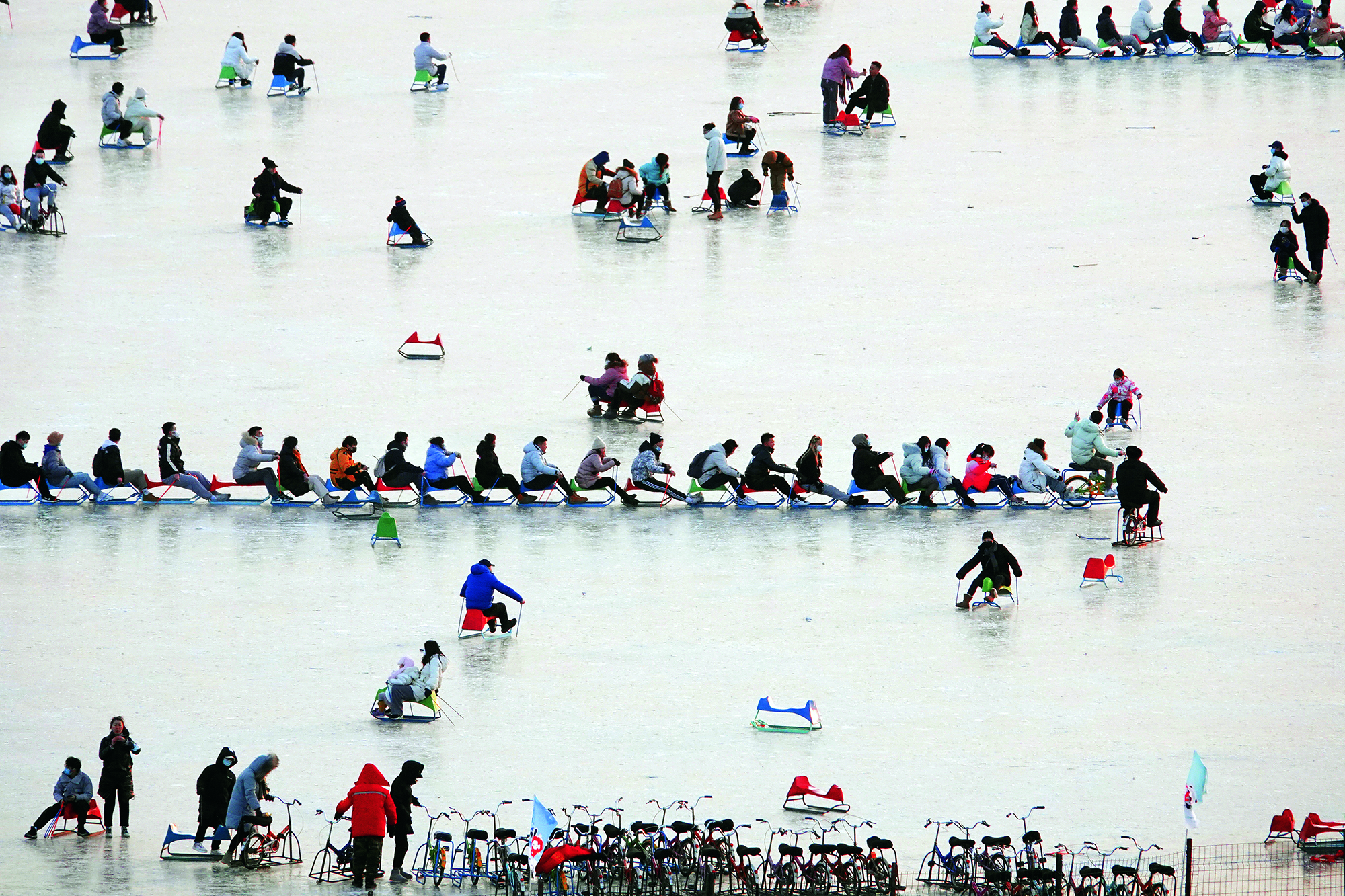 Tourists enjoy games on the snow-covered Hongfeng Lake in Liaoyuan, Jilin Province, on January 17, 2020.