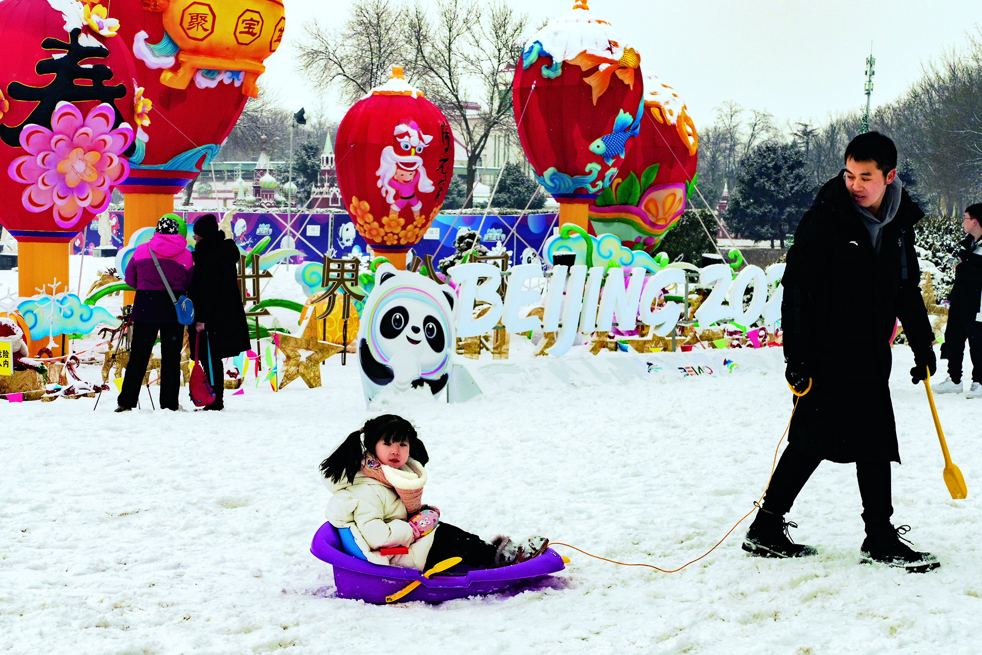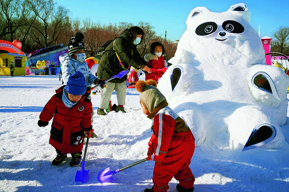 2021年12月31日,北京,家长和小朋友们在陶然亭公园 “ 冰雪嘉年华 ” 用冰雪制作 “ 冰墩墩 ” , 用赤诚的童心描绘冬奥梦想,祝福冬奥健儿