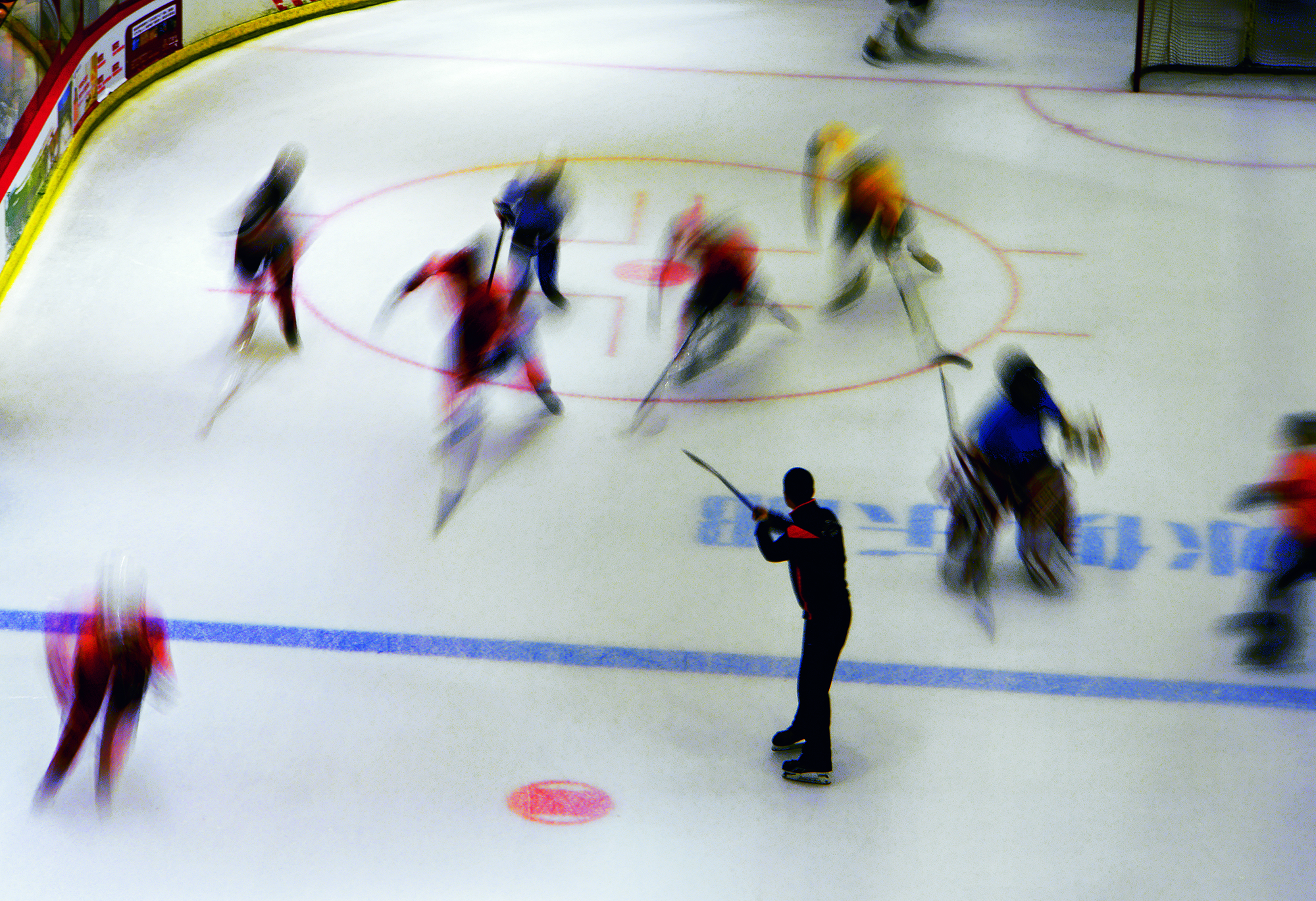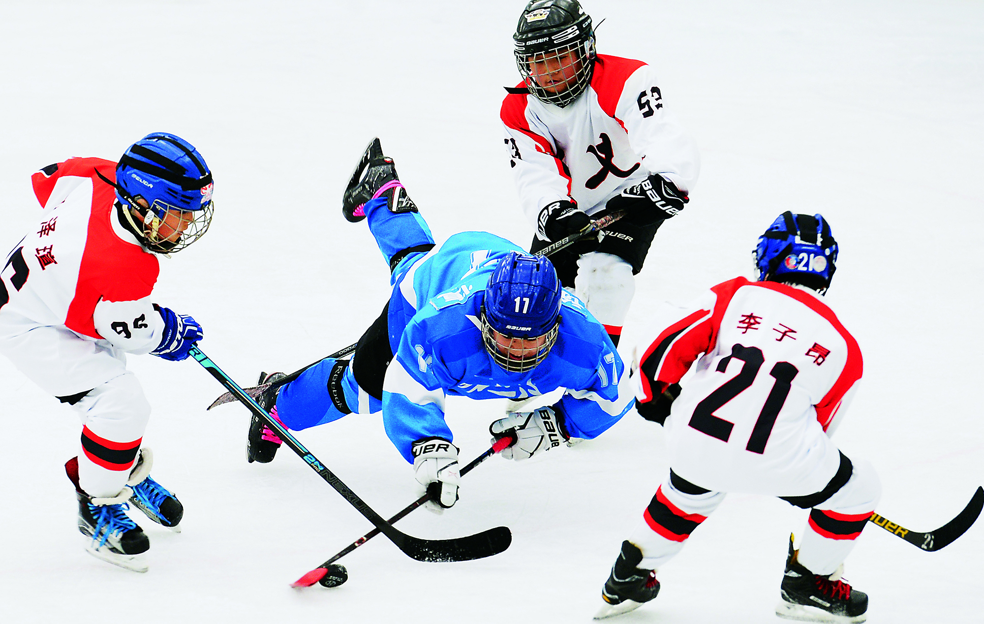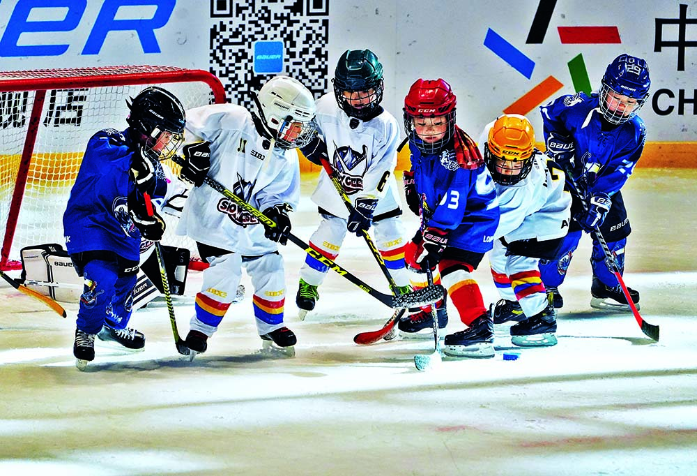 Young players compete in the irst Haidian Ice Hockey Games for primary and secondary school students at an ice rink in Haidian District of Beijing on April 16, 2016.