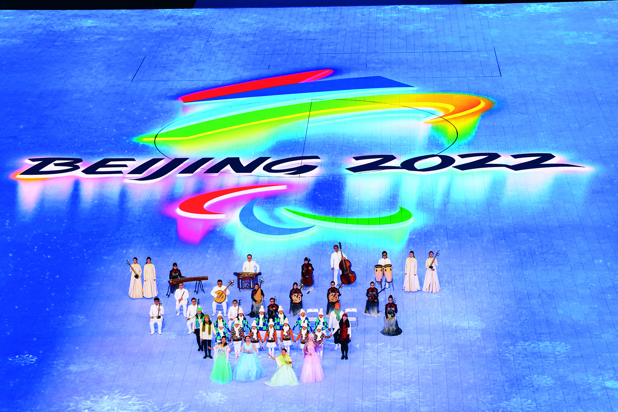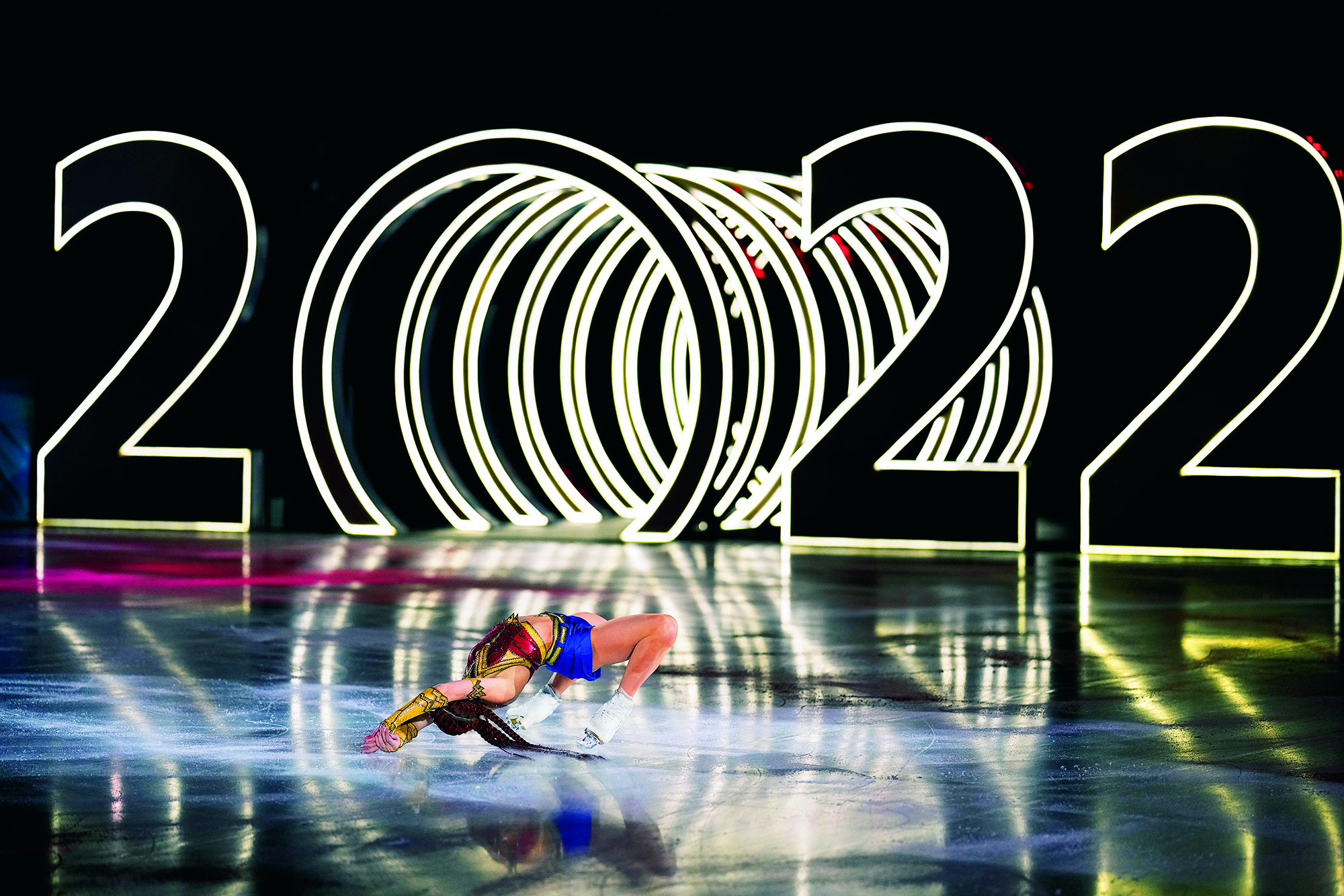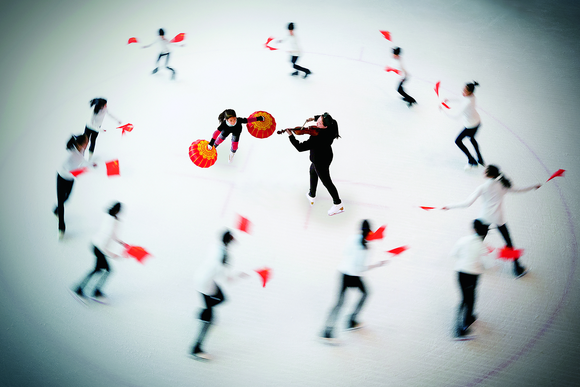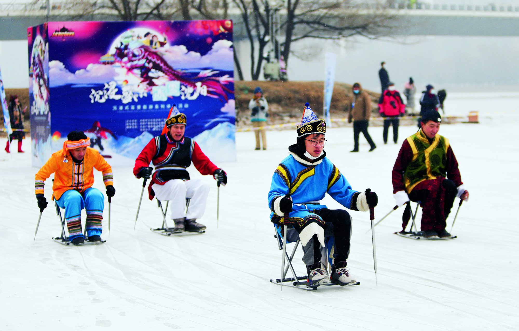 People in Tibetan costumes enjoy ice sports in Songshan Town of Tianzhu Tibetan Autonomous County in Gansu Province on December 18, 2021. By diverting water from the river to the city’s idle land, the local government created a venue for the public to experience winter sports.
