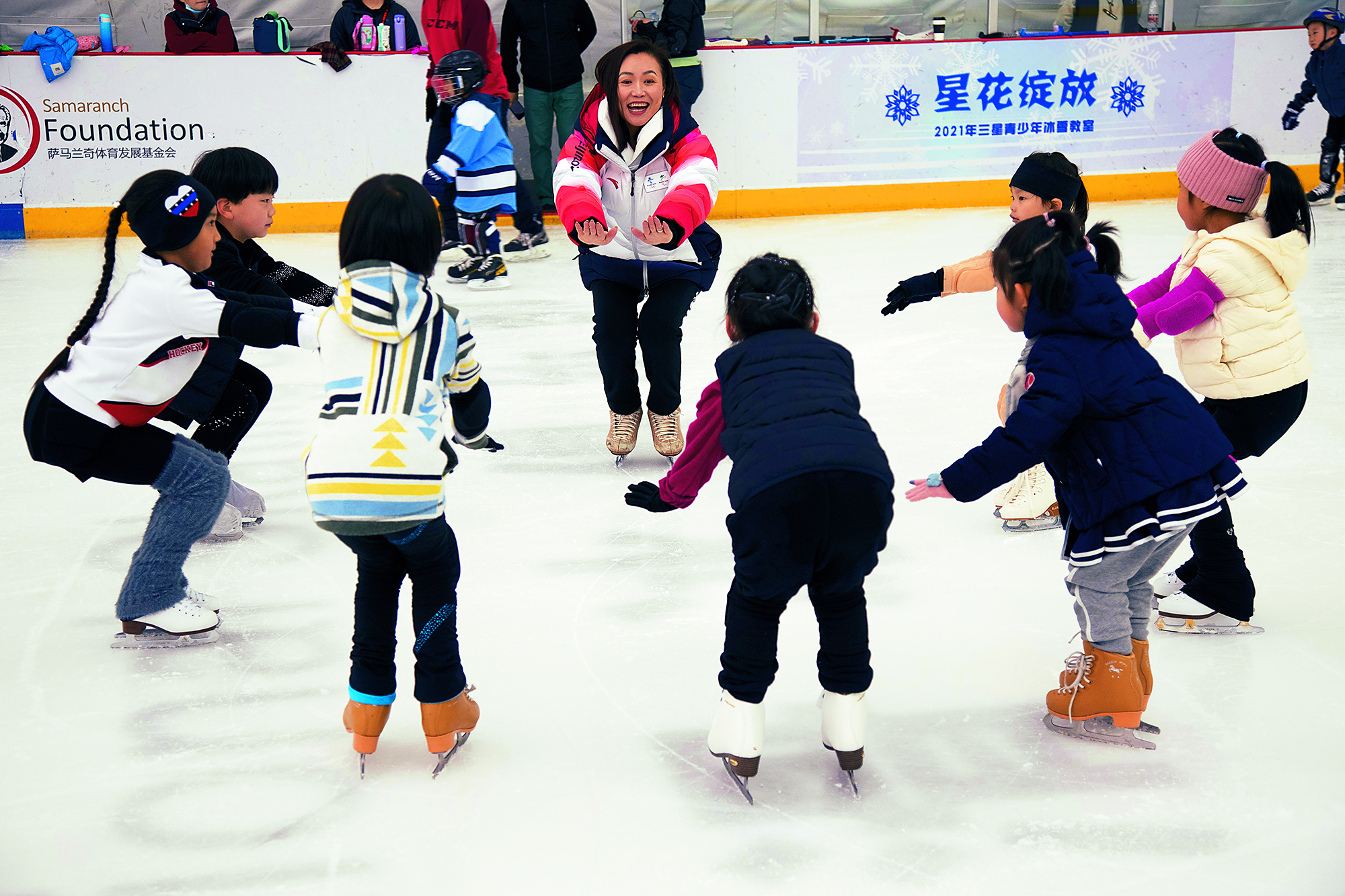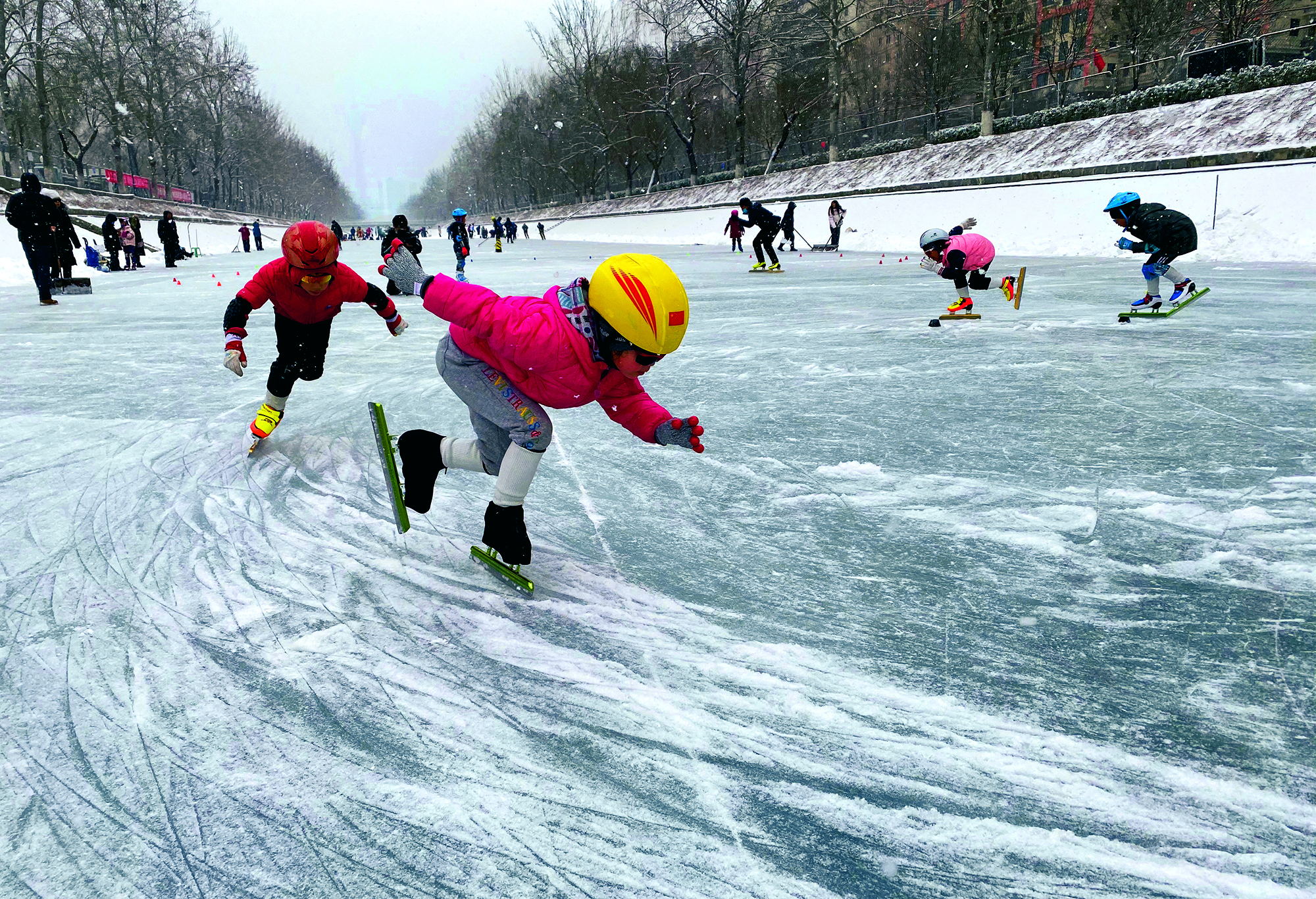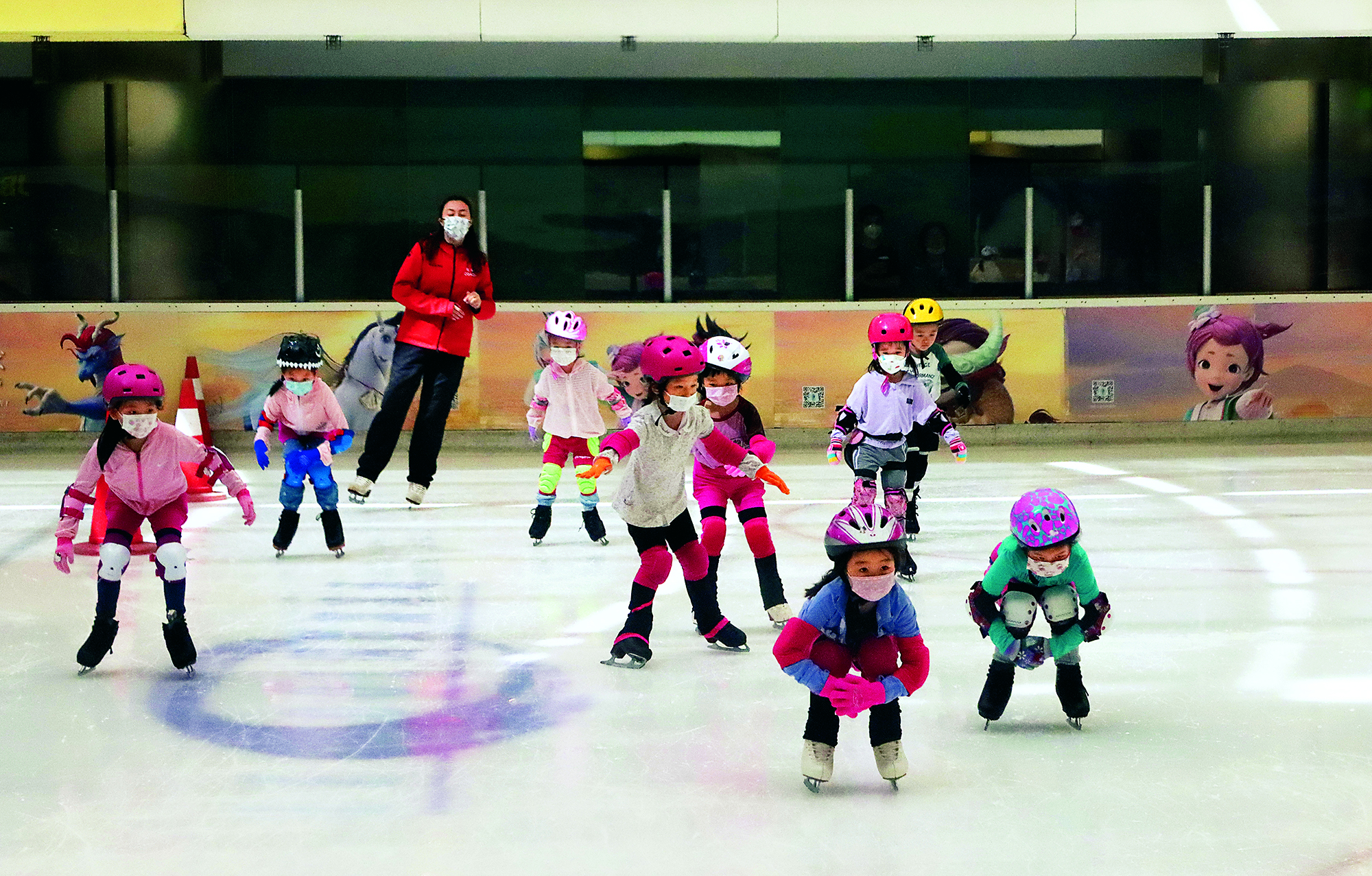2022年2月13日,北京,小朋友们在雪中练习滑冰