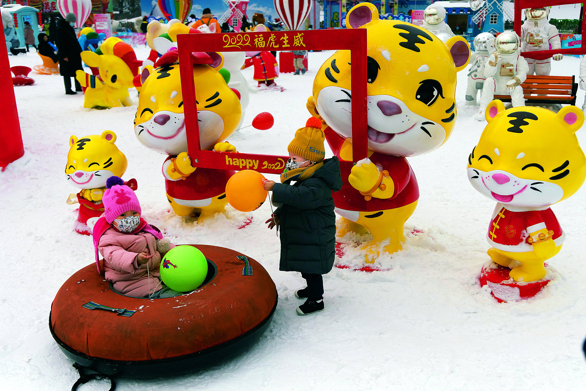 Children frolic in the snow at Himalayas Ice and Snow World, an indoor theme park in Shanghai, on January 8, 2022.