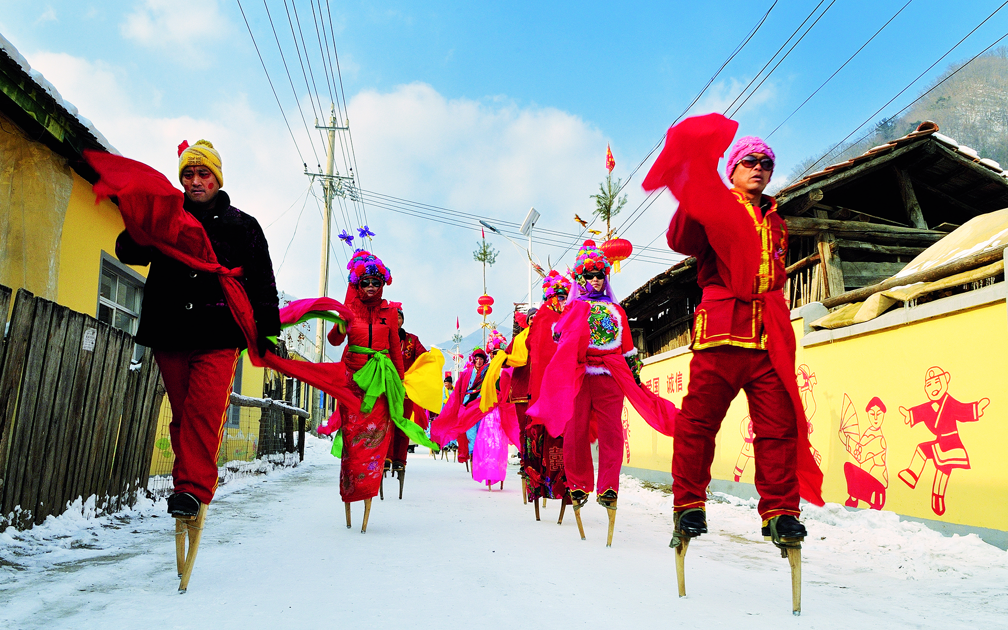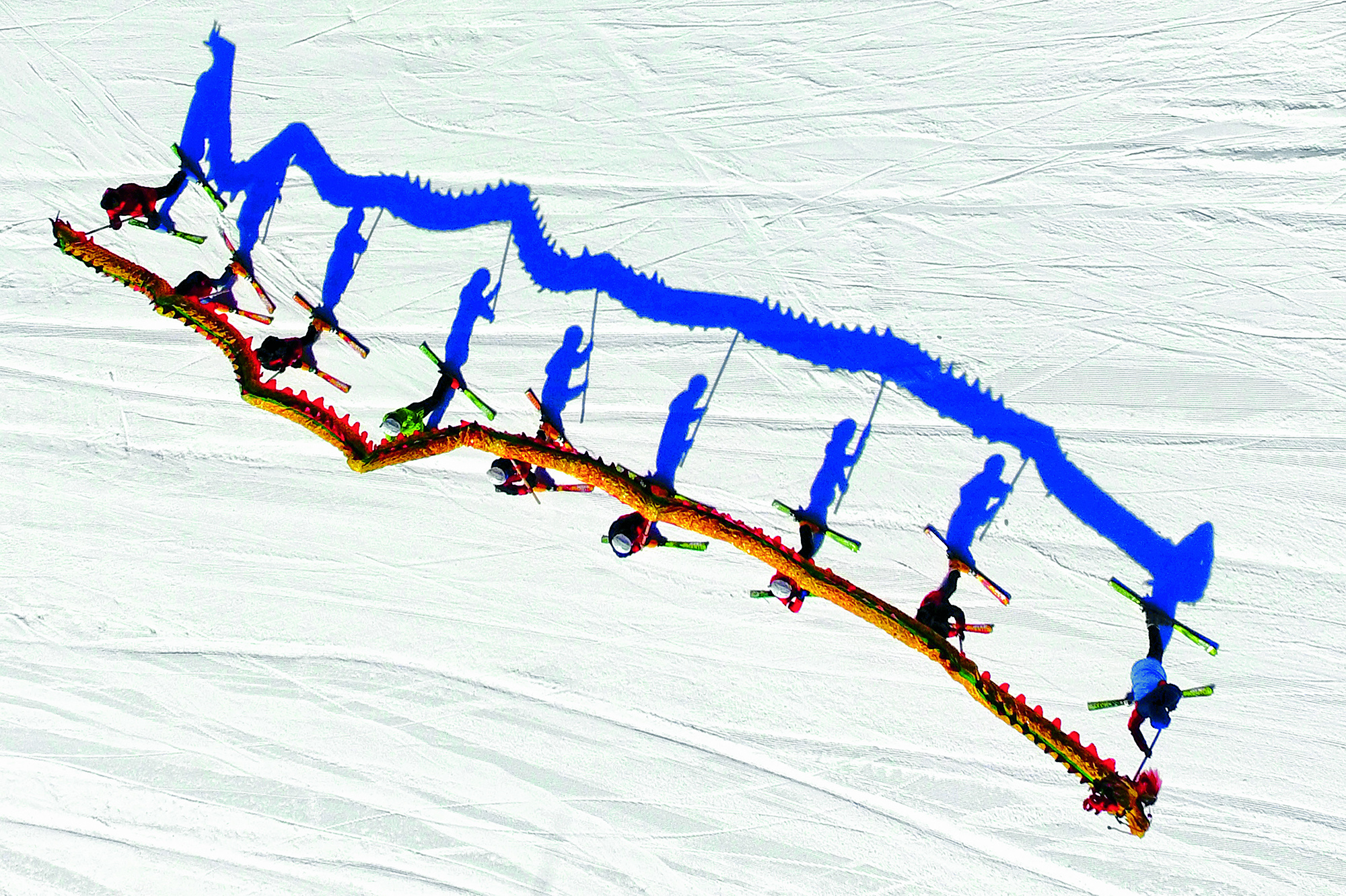 People perform a dragon dance at Qixingling Ski Resort in the city of Yichun, Jiangxi Province, on February 13,