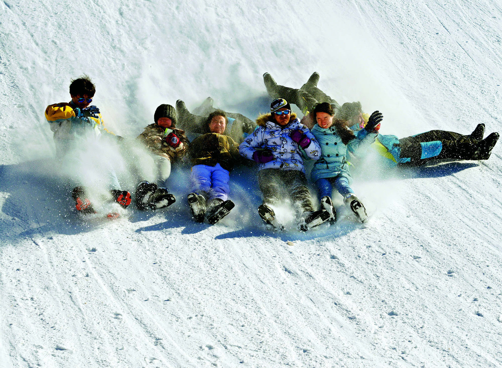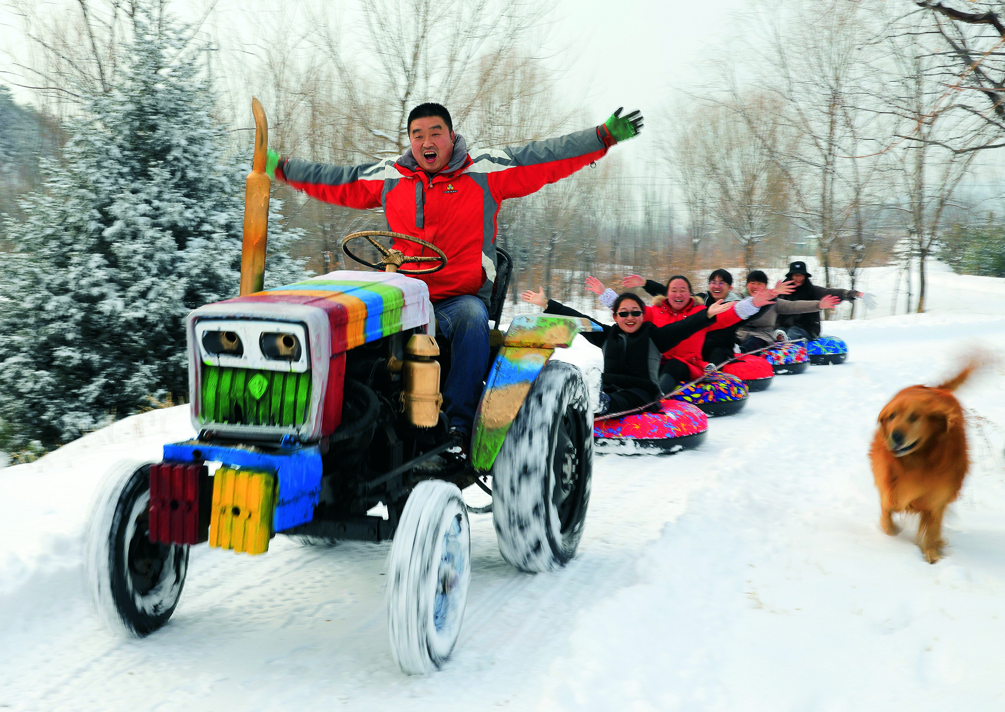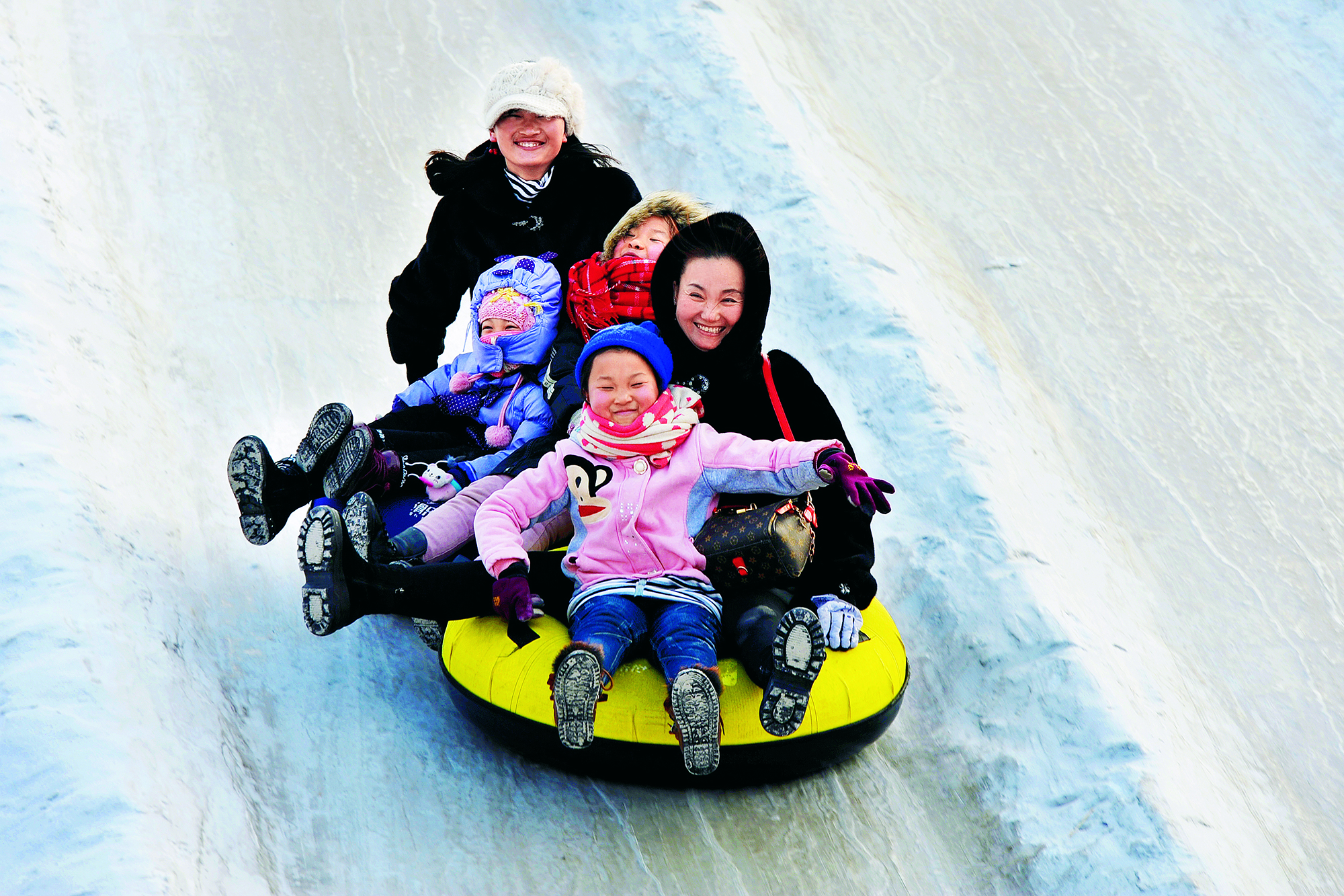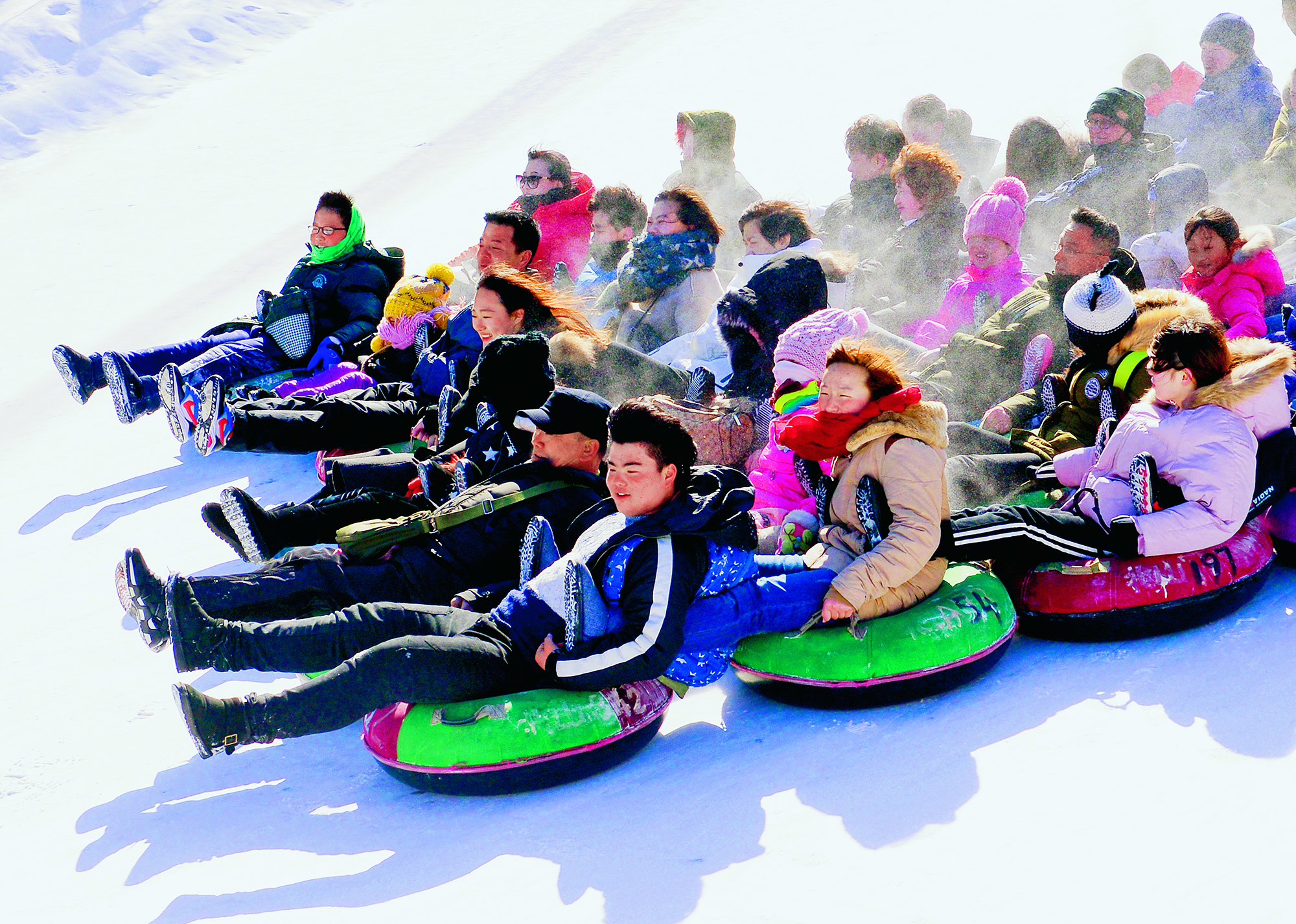 2017年2月6日,吉林省吉林市,人们在北山高台露天滑雪场将雪圈连在一起, 形成巨大冲击力,让雪圈滑得更远,带来更大的欢乐