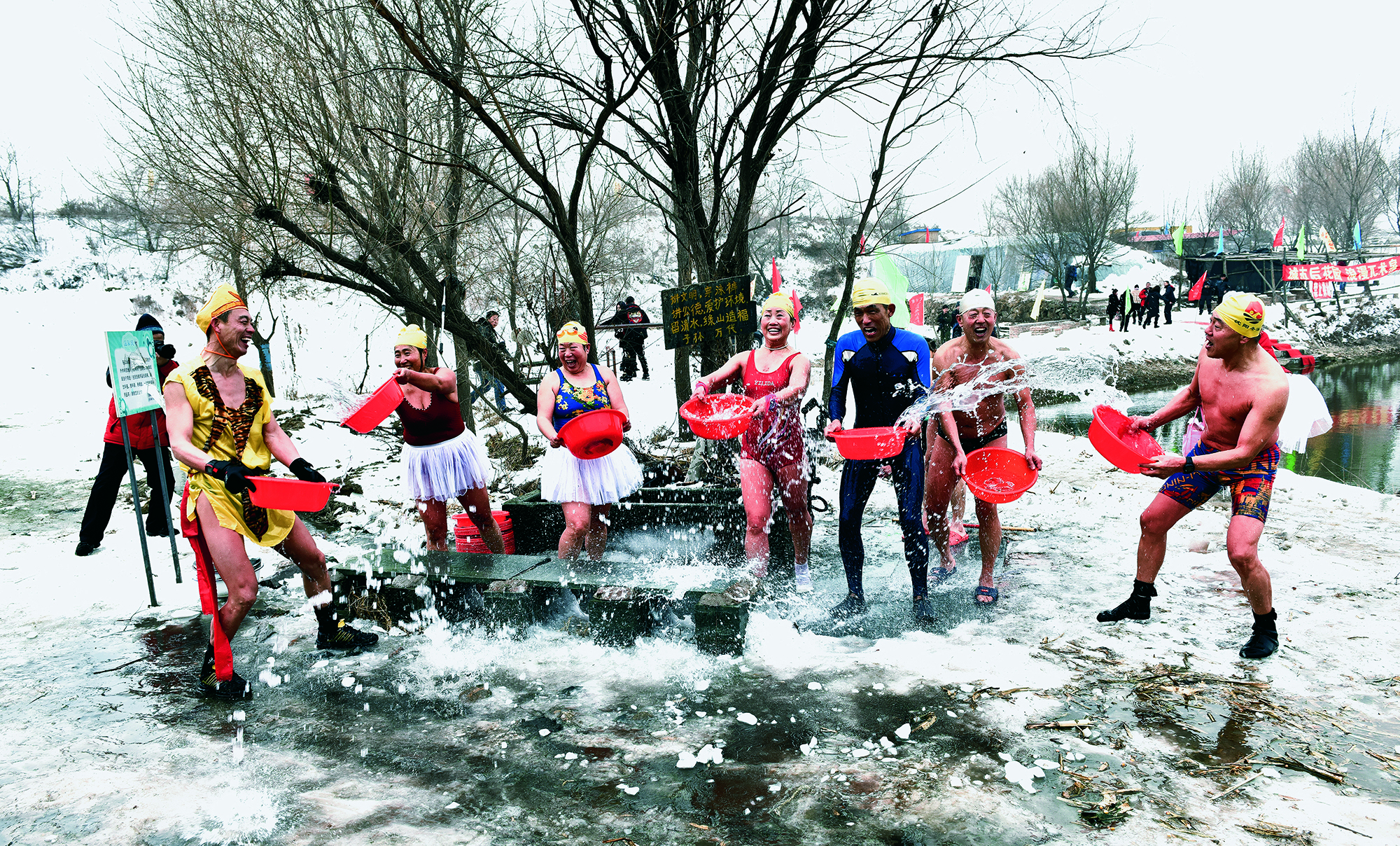 2021年1月30日,辽宁省沈阳市,在零下20多摄氏度的严寒里,中老年冬泳爱好者在北陵公园冬泳基地表演 “ 花式跳水 ” ,迎接新春佳节