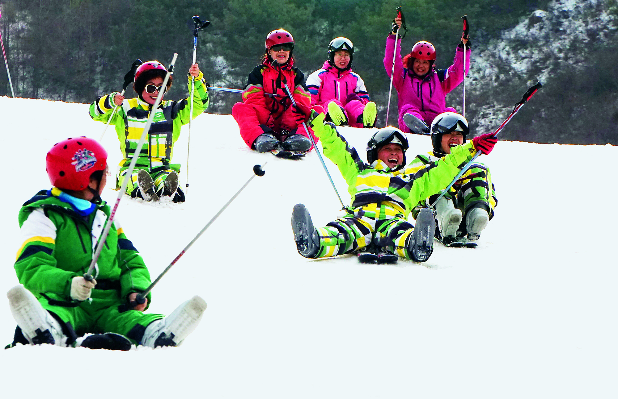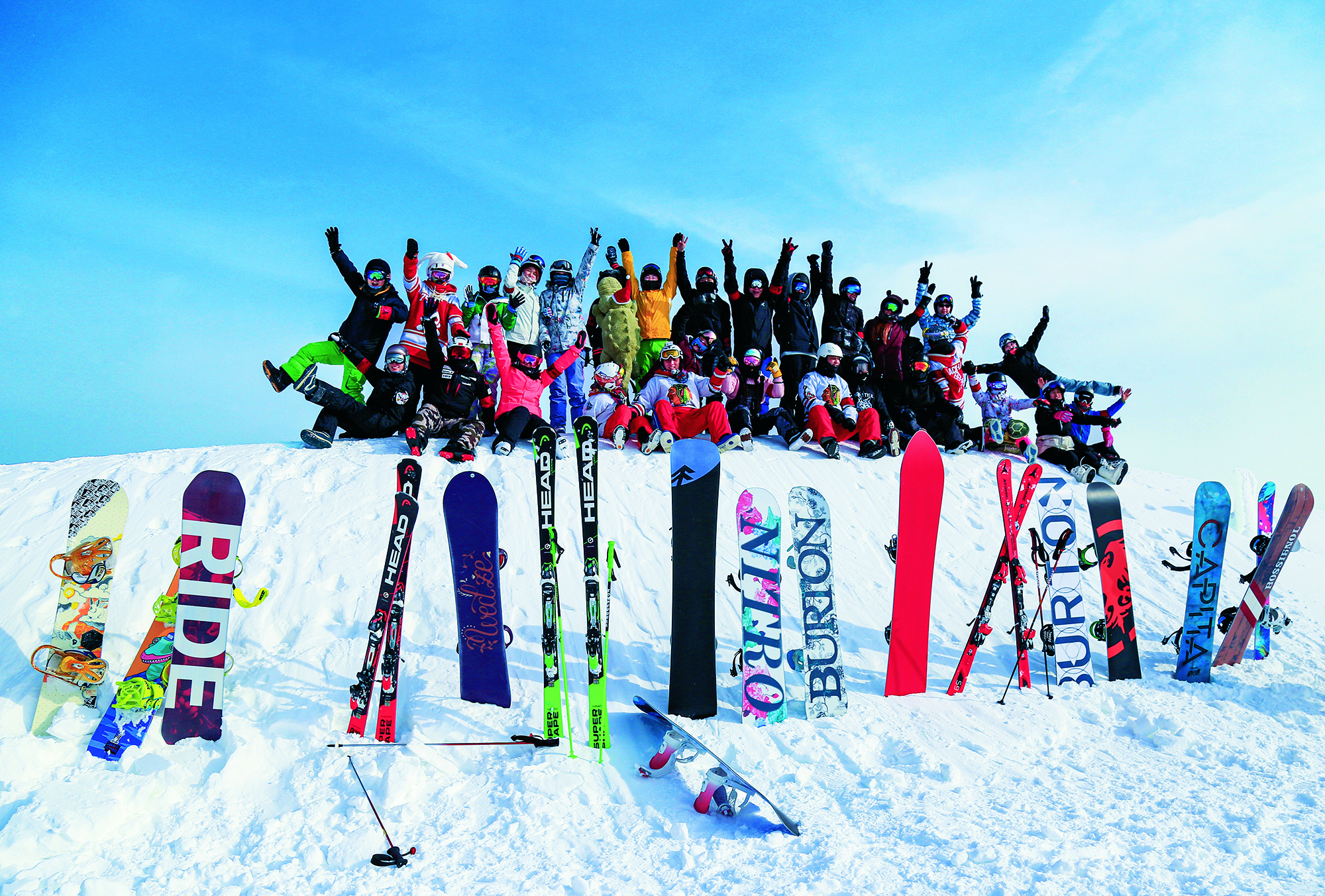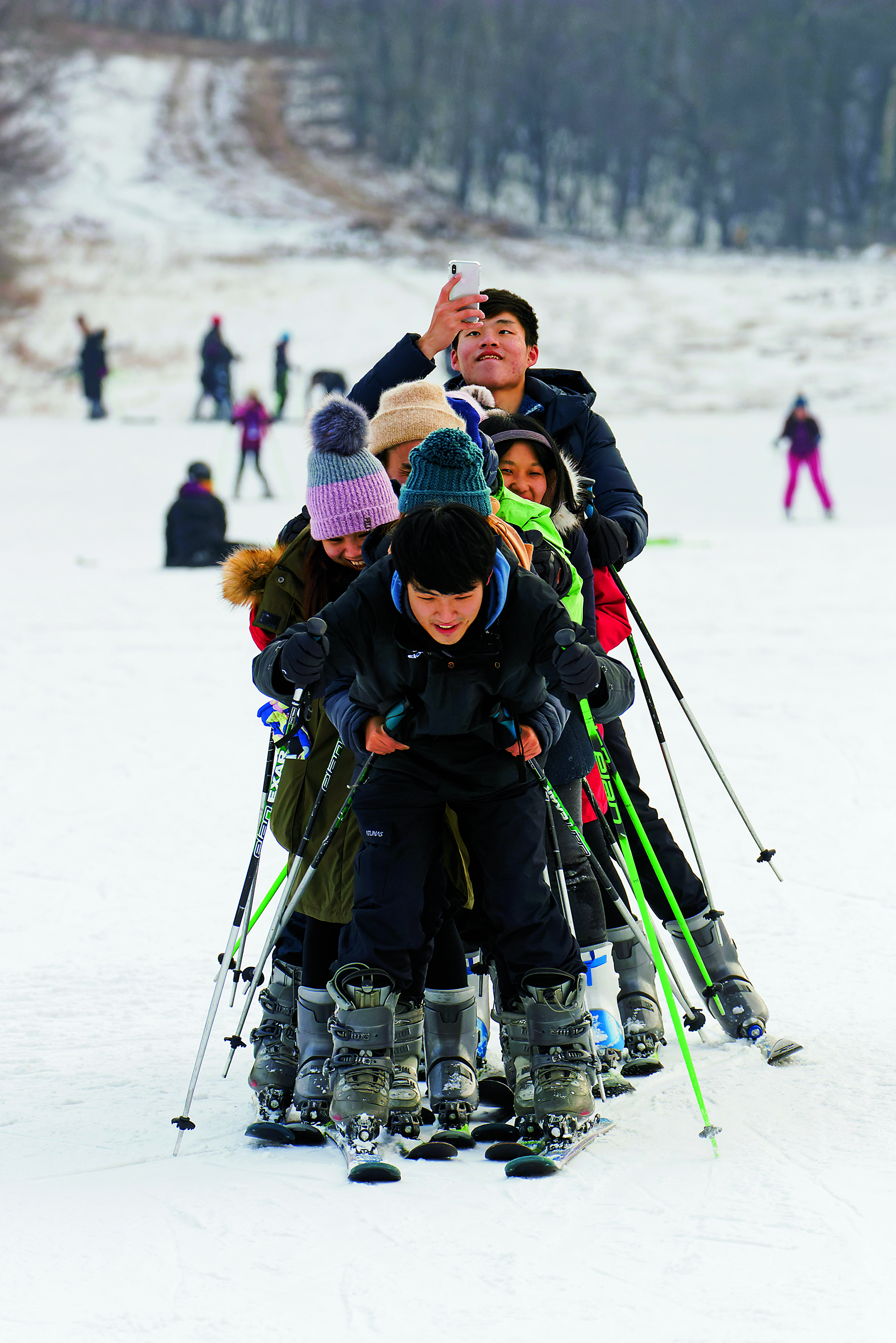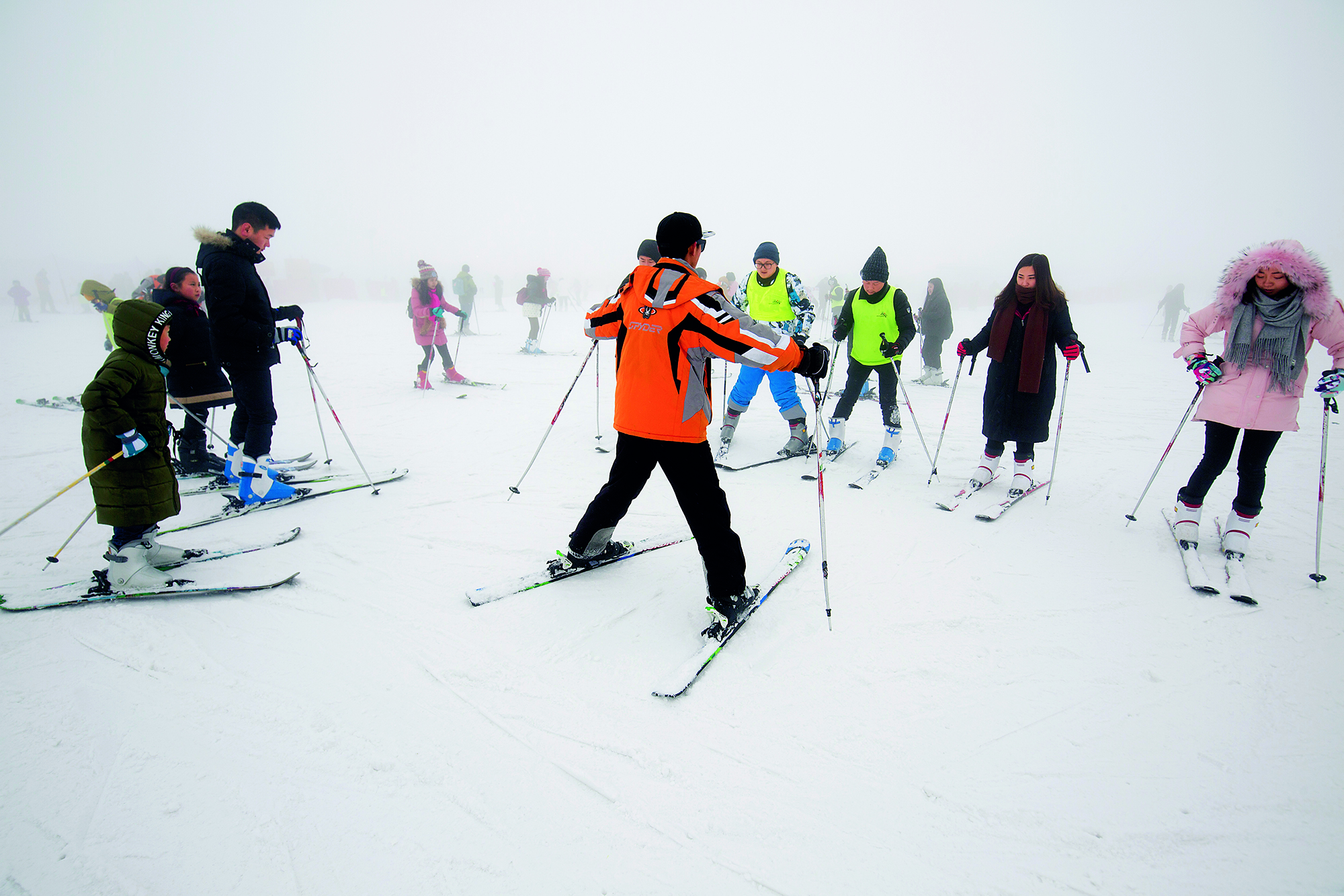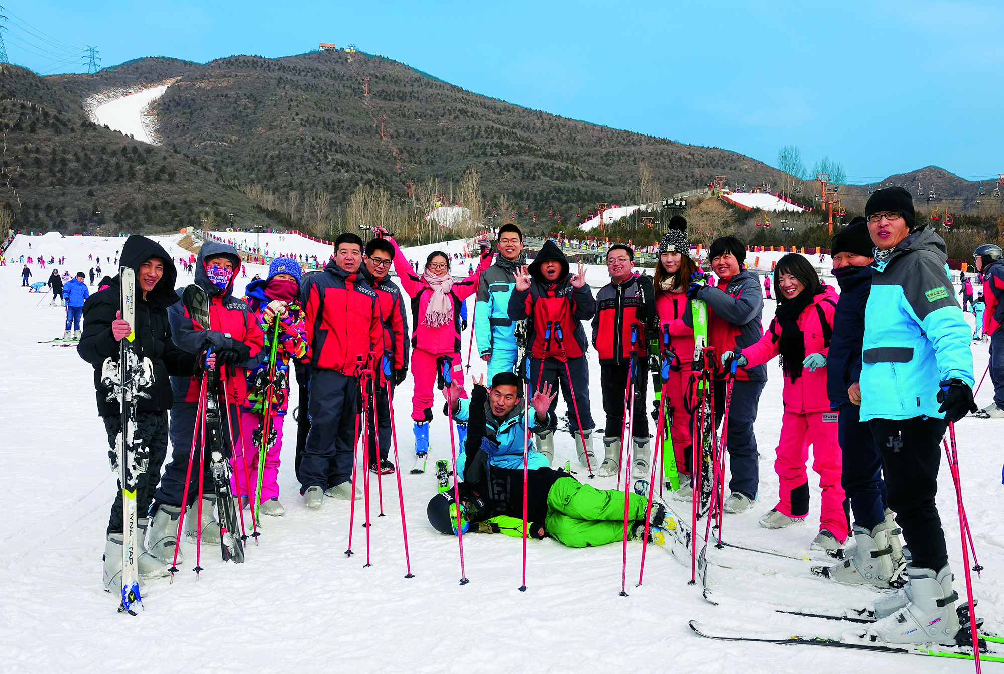 2018年1月7日,北京,某企业员工到滑雪场组织团建活动后合影留念