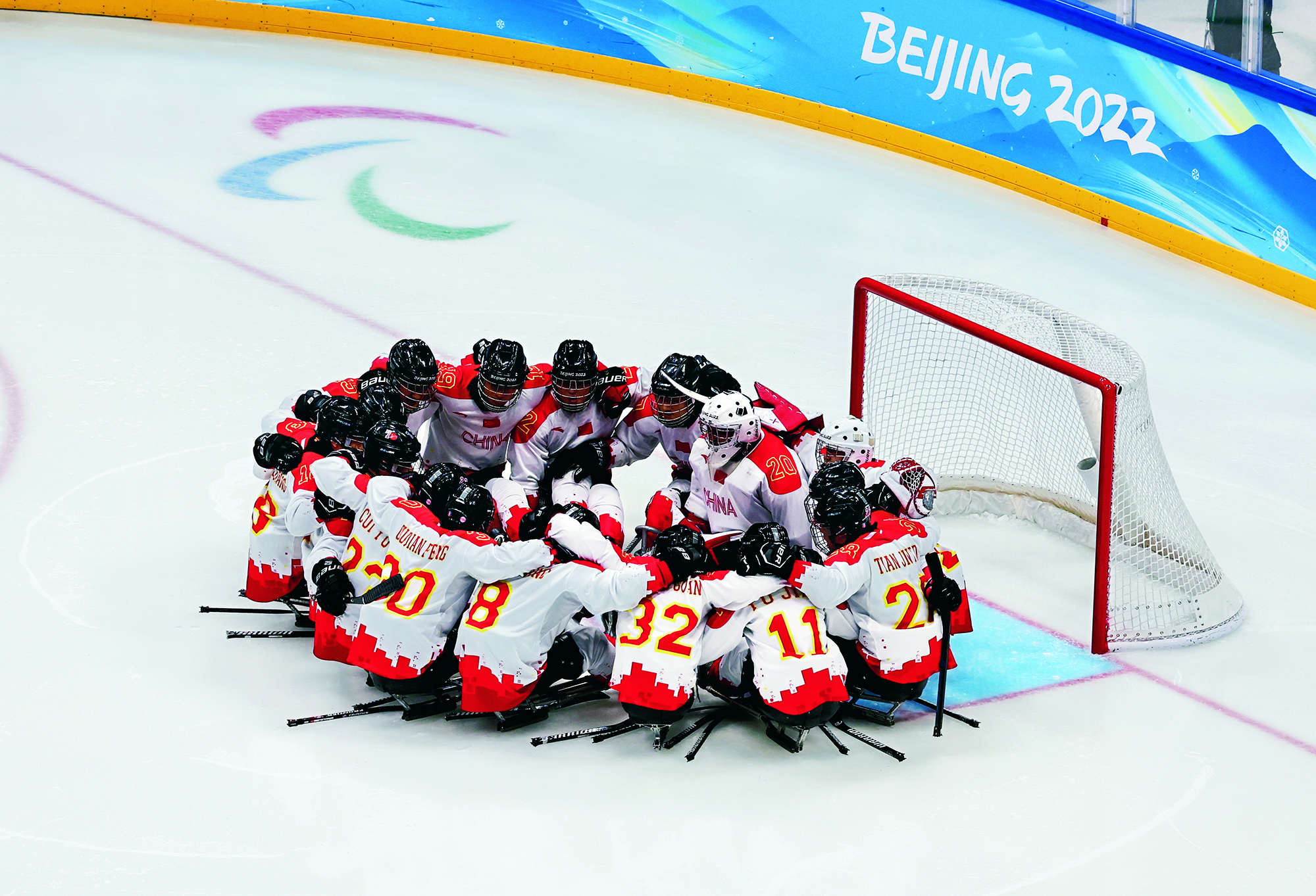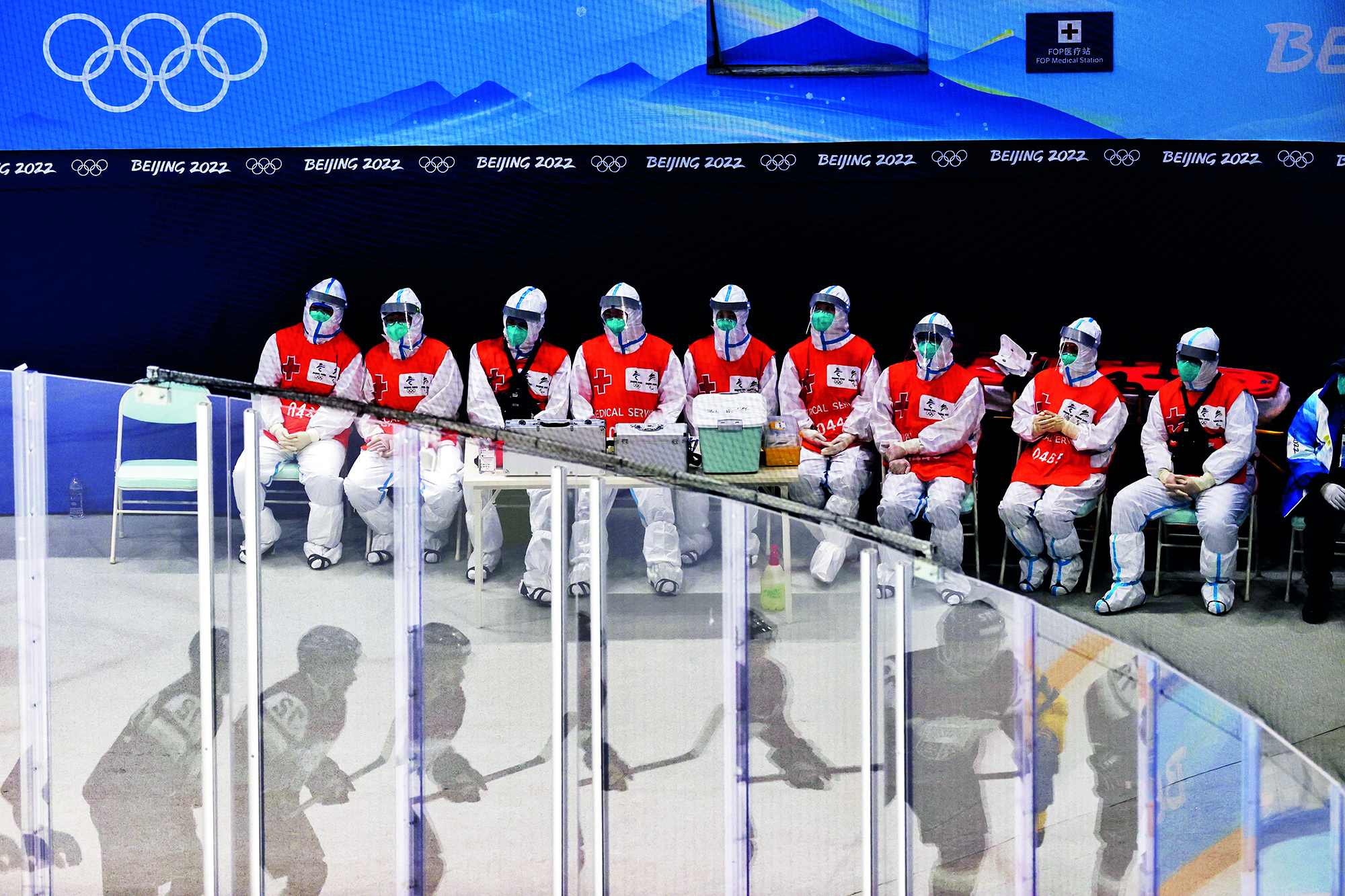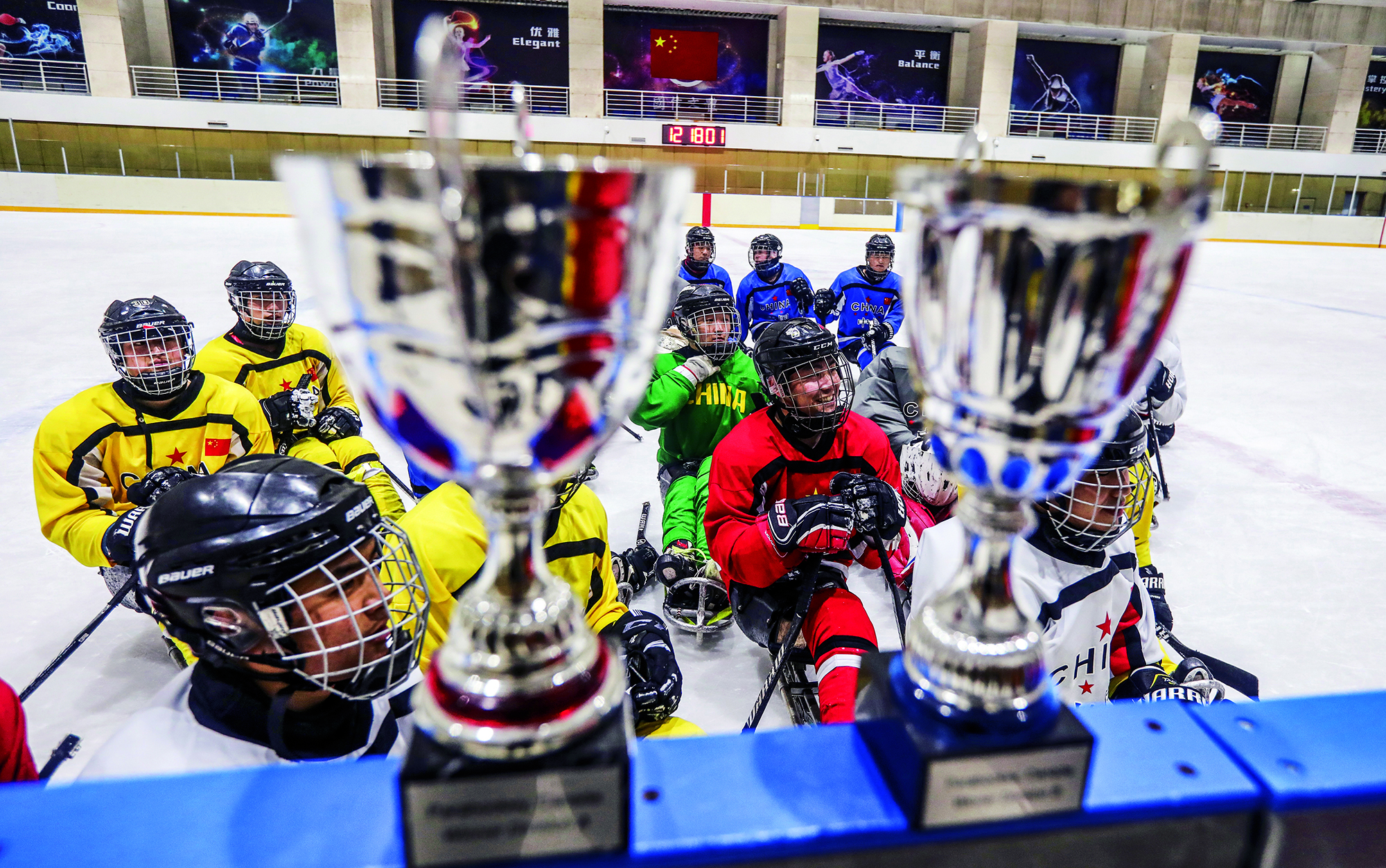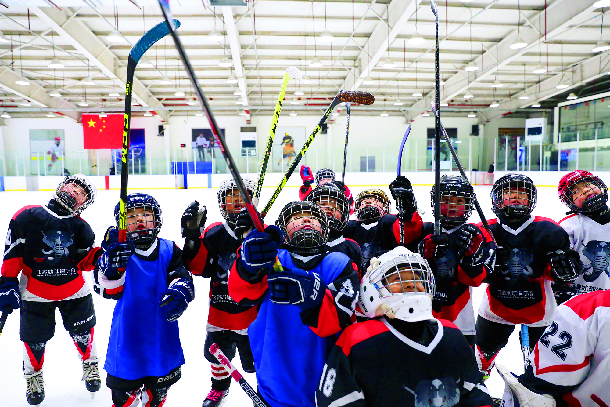 Teenagers from Flying Elephant Ice Hockey Club at the Nangong International Ice Sports Center in Fengtai District, Beijing, on February 20, 2022.