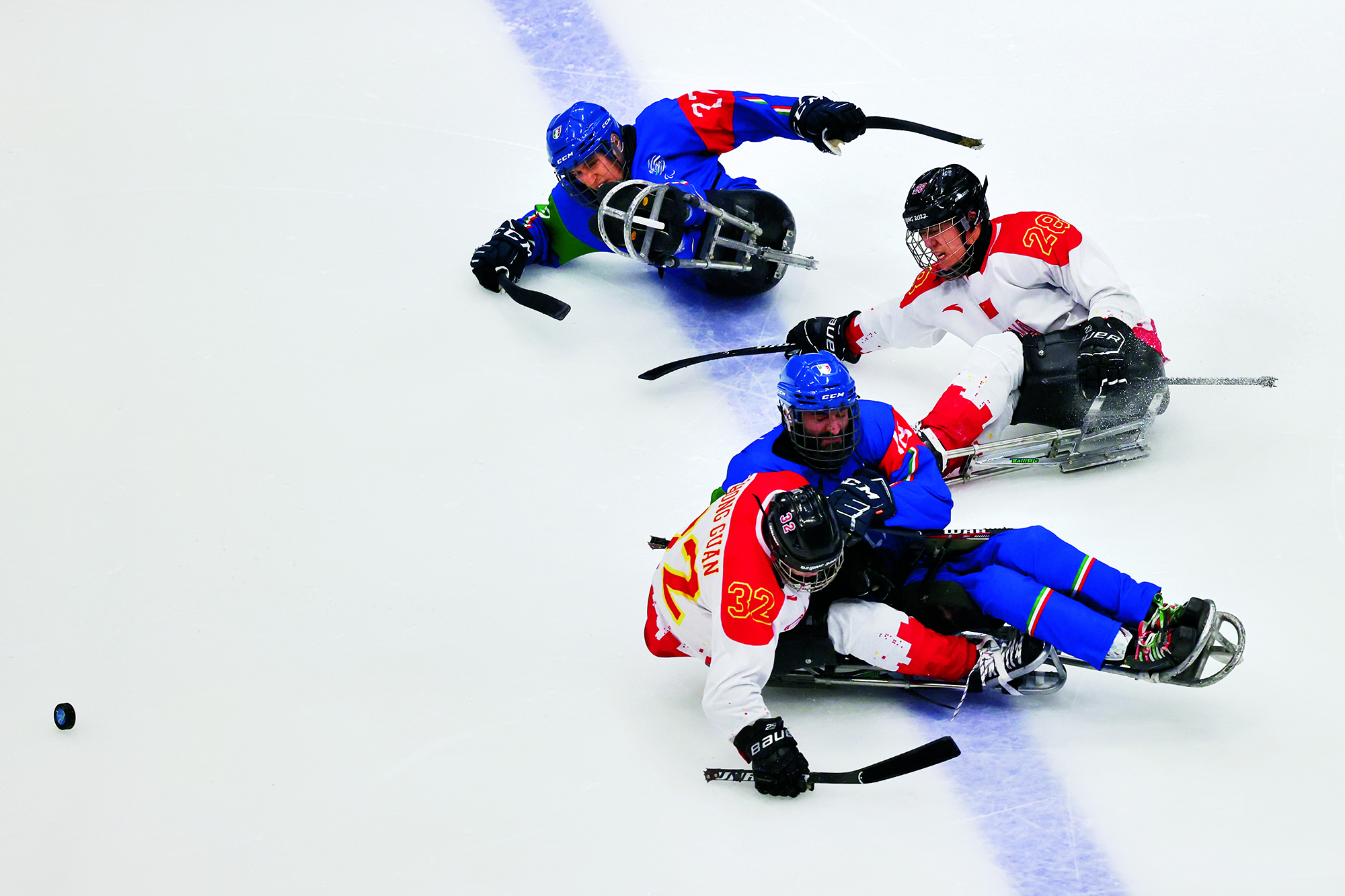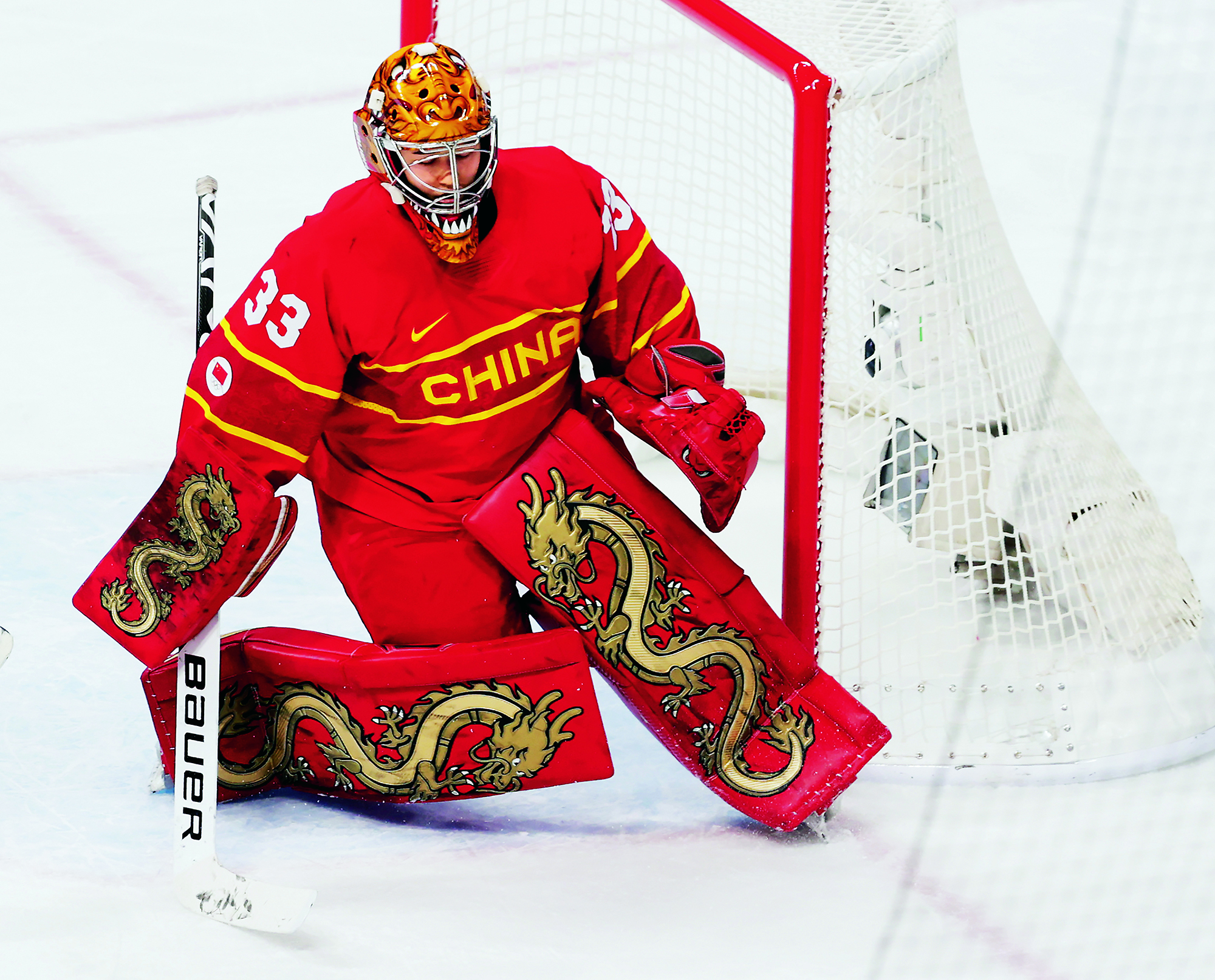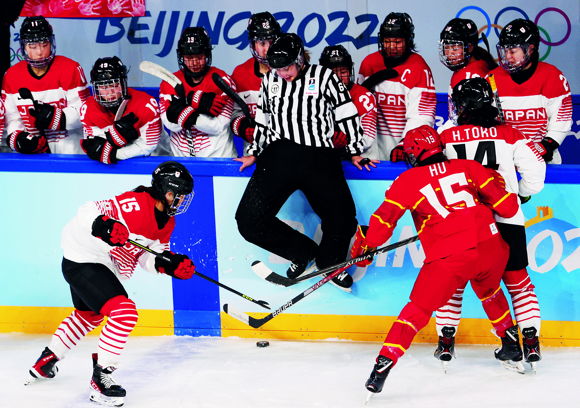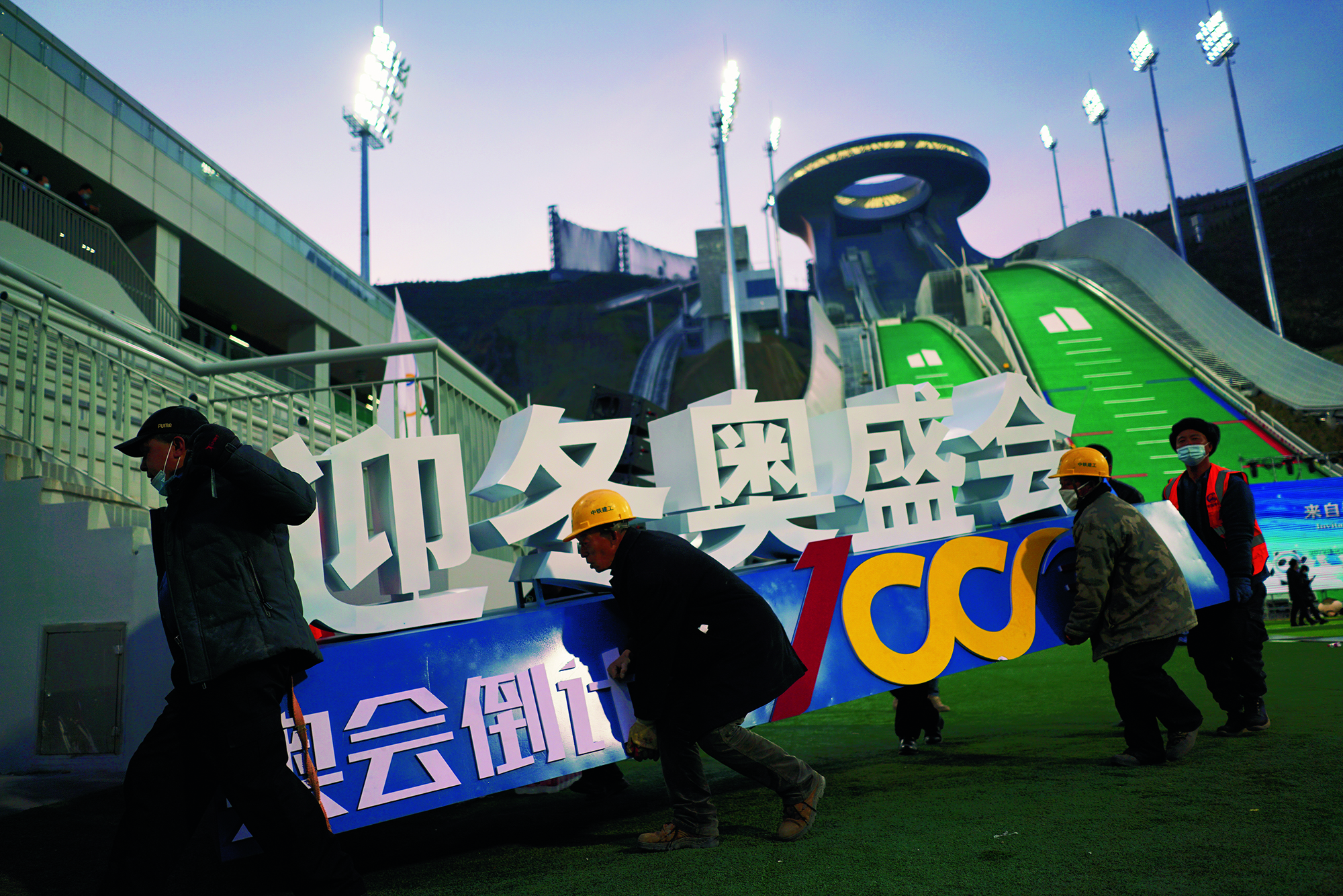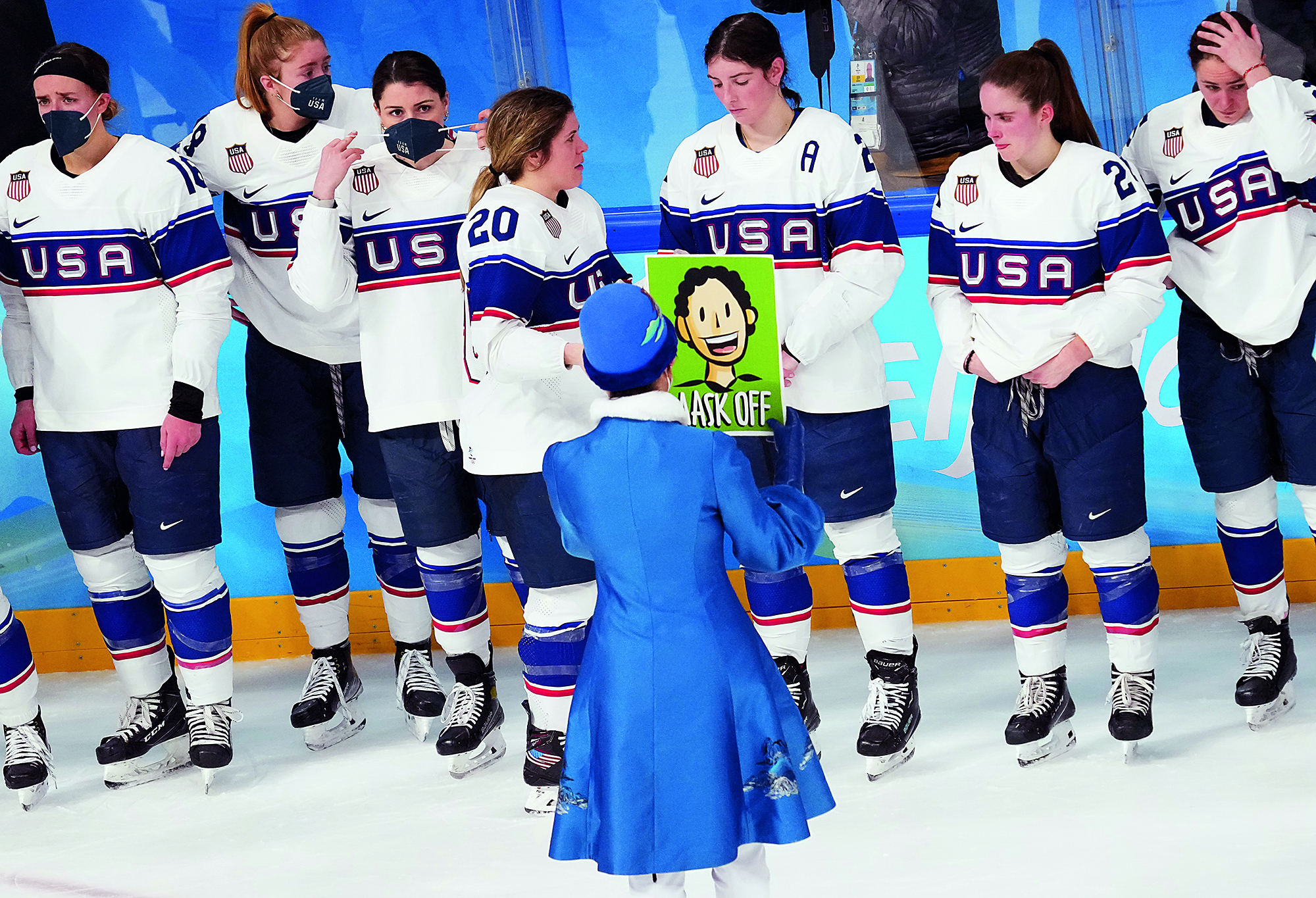 Teenagers from Flying Elephant Ice Hockey Club at the Nangong International Ice Sports Center in Fengtai District, Beijing, on February 20, 2022.