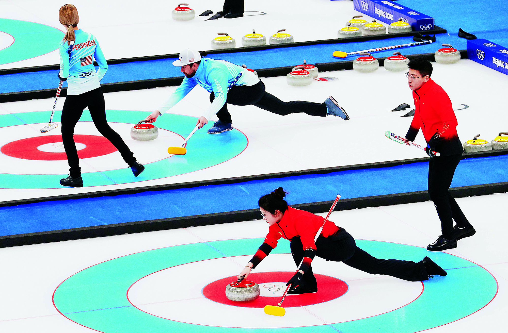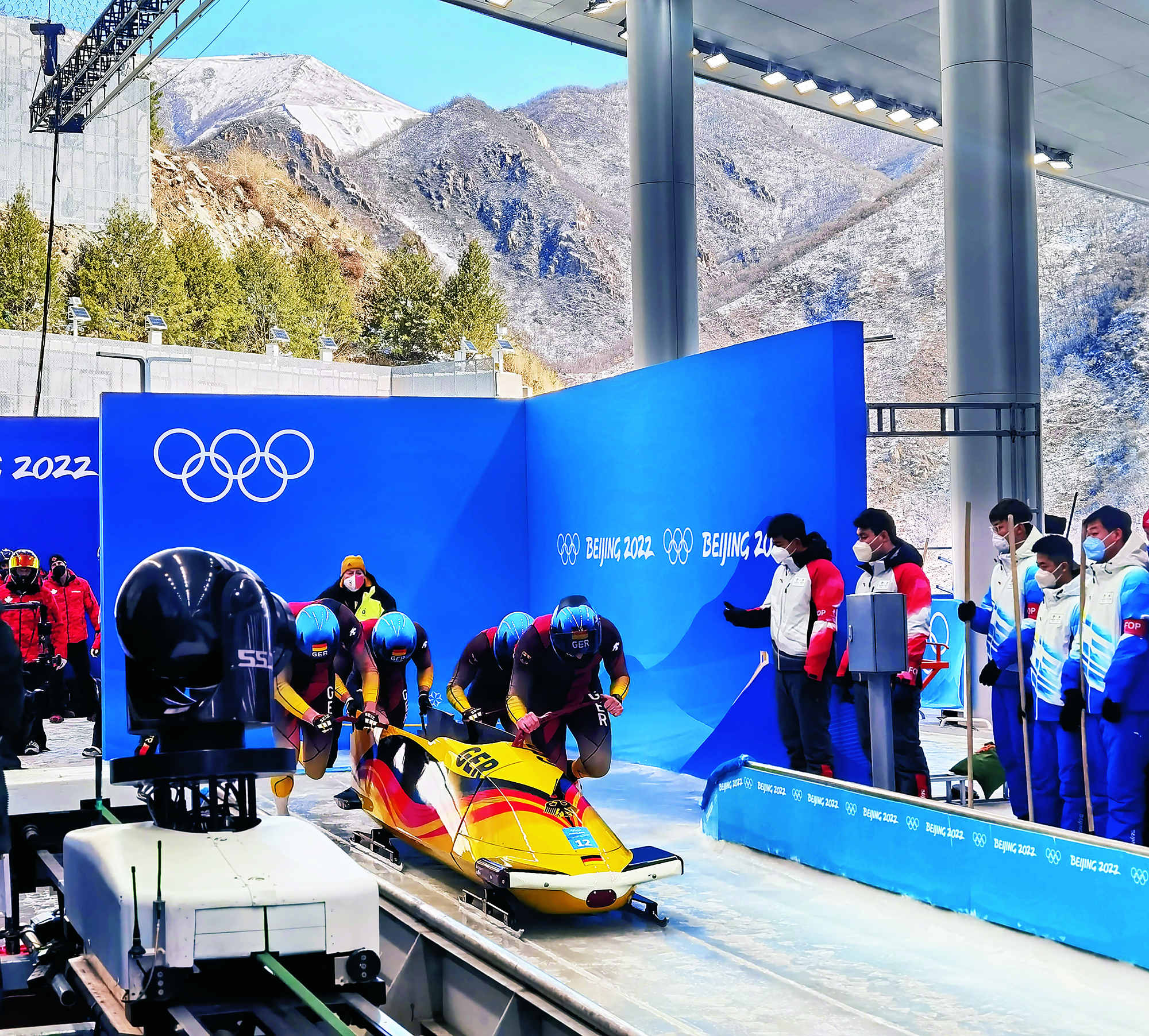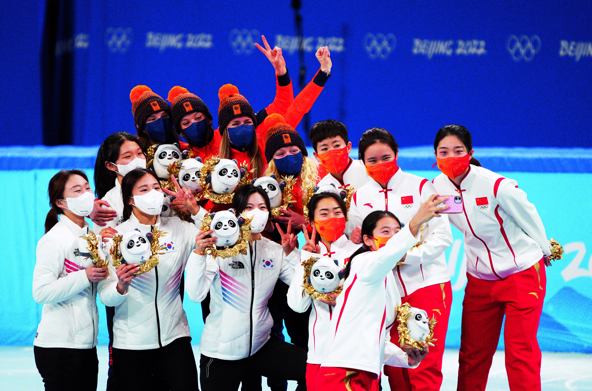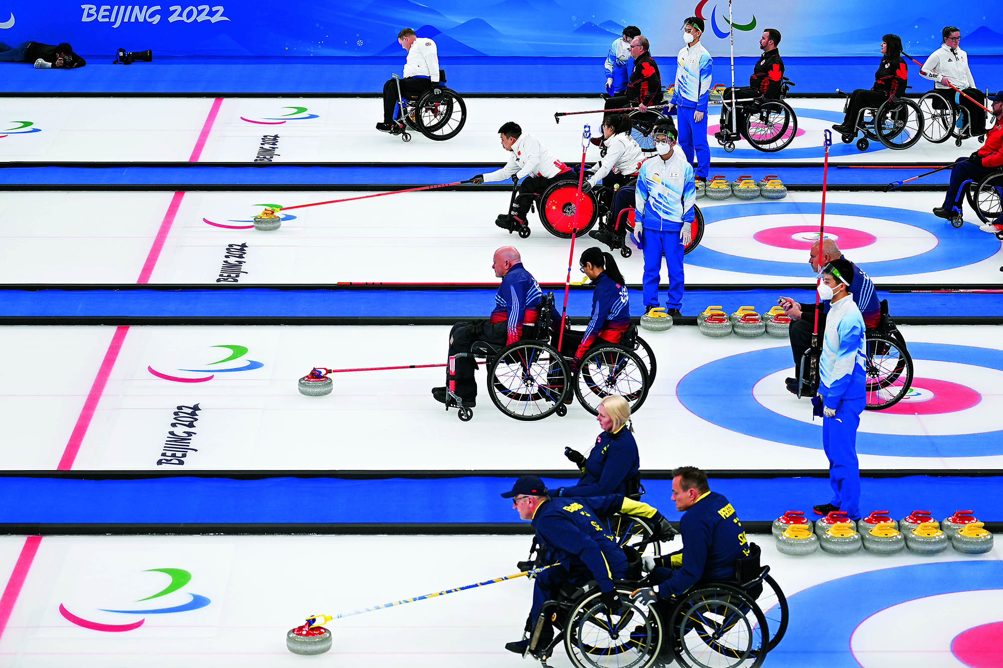 Teenagers from Flying Elephant Ice Hockey Club at the Nangong International Ice Sports Center in Fengtai District, Beijing, on February 20, 2022.