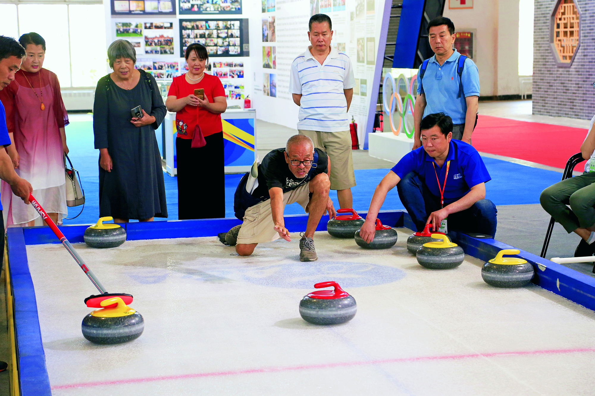 2019年5月31日,北京,市民们在中国国际展览中心举办的中国国际文化创意博览会体育文化展区内体验冰壶运动
