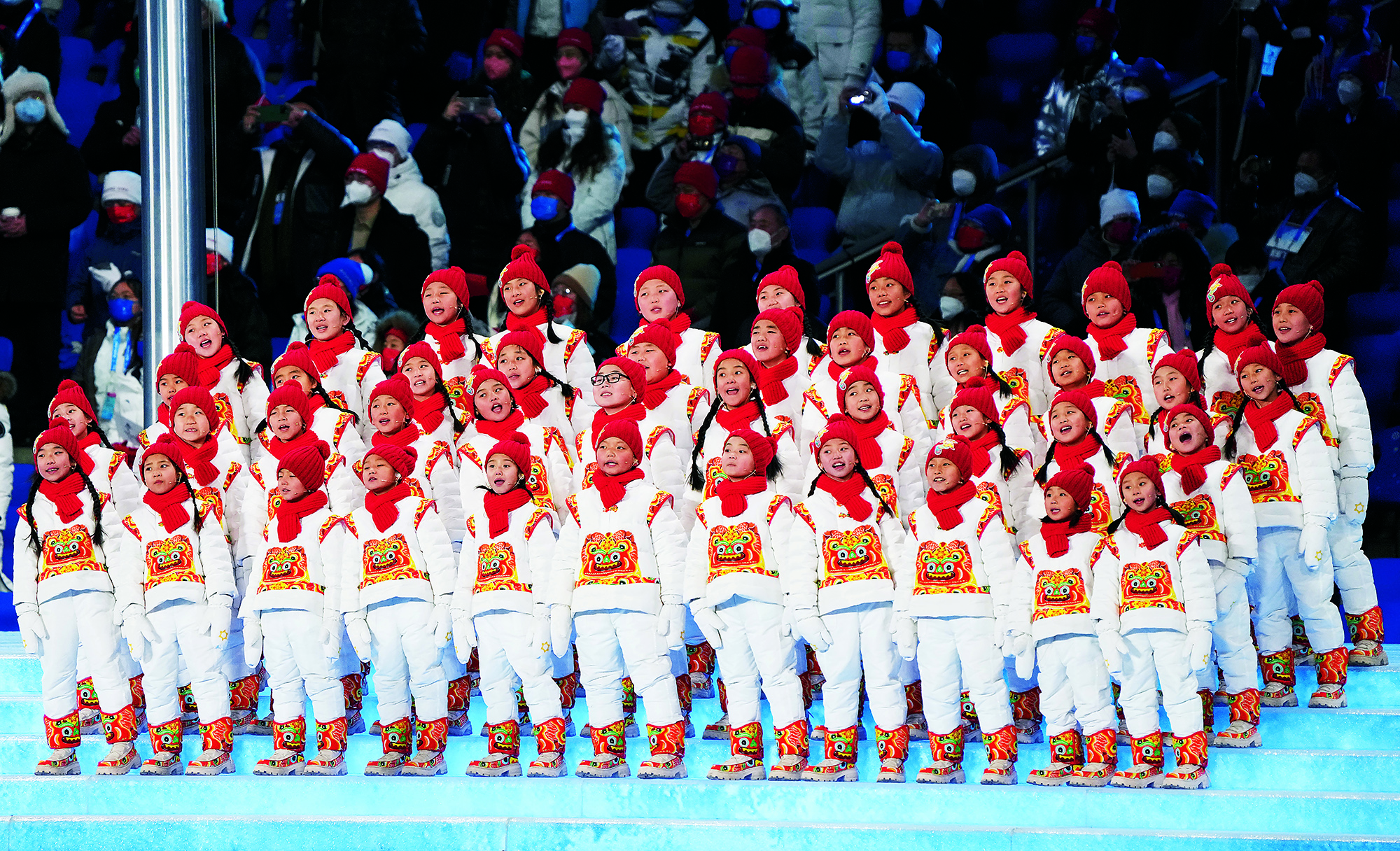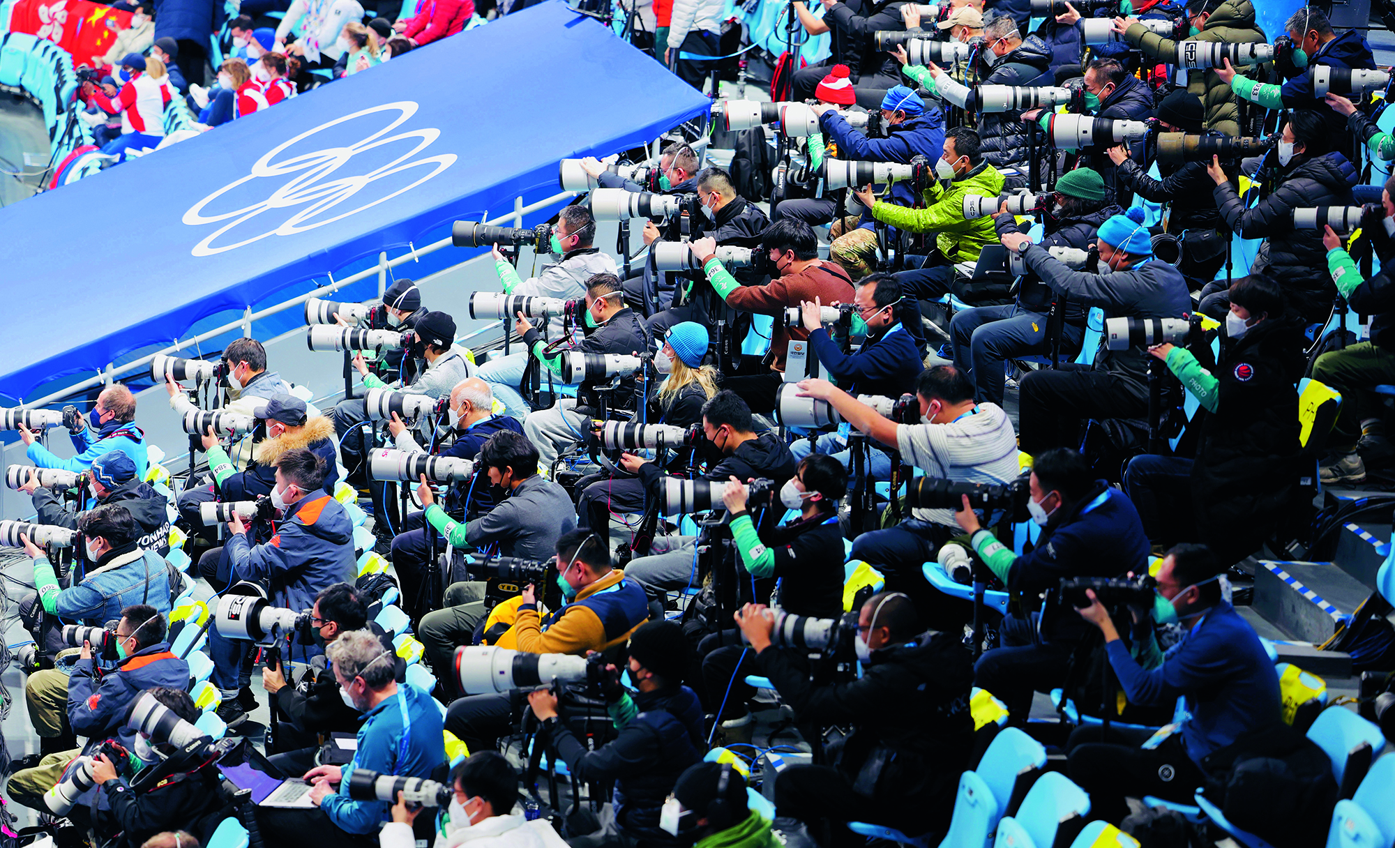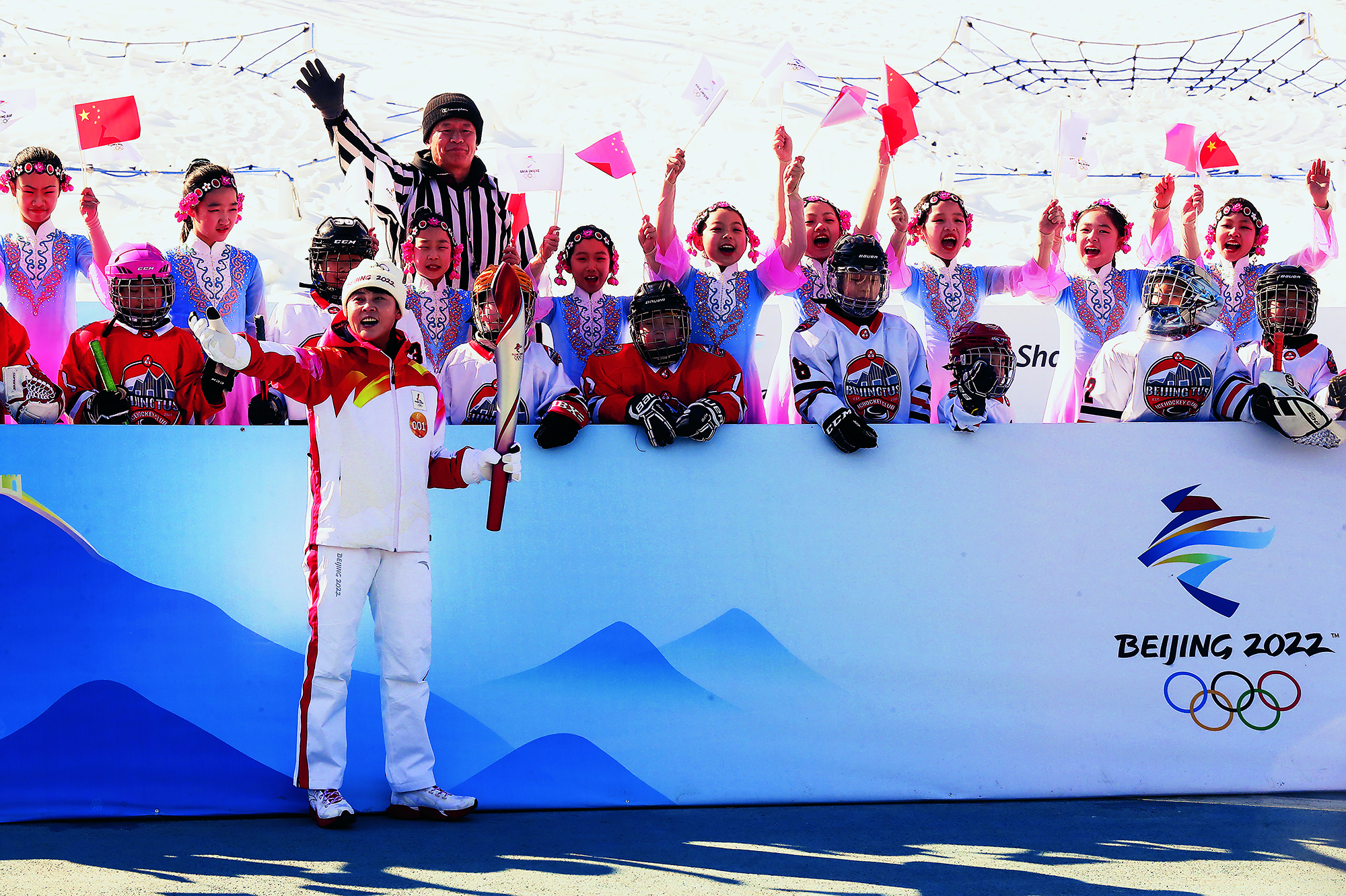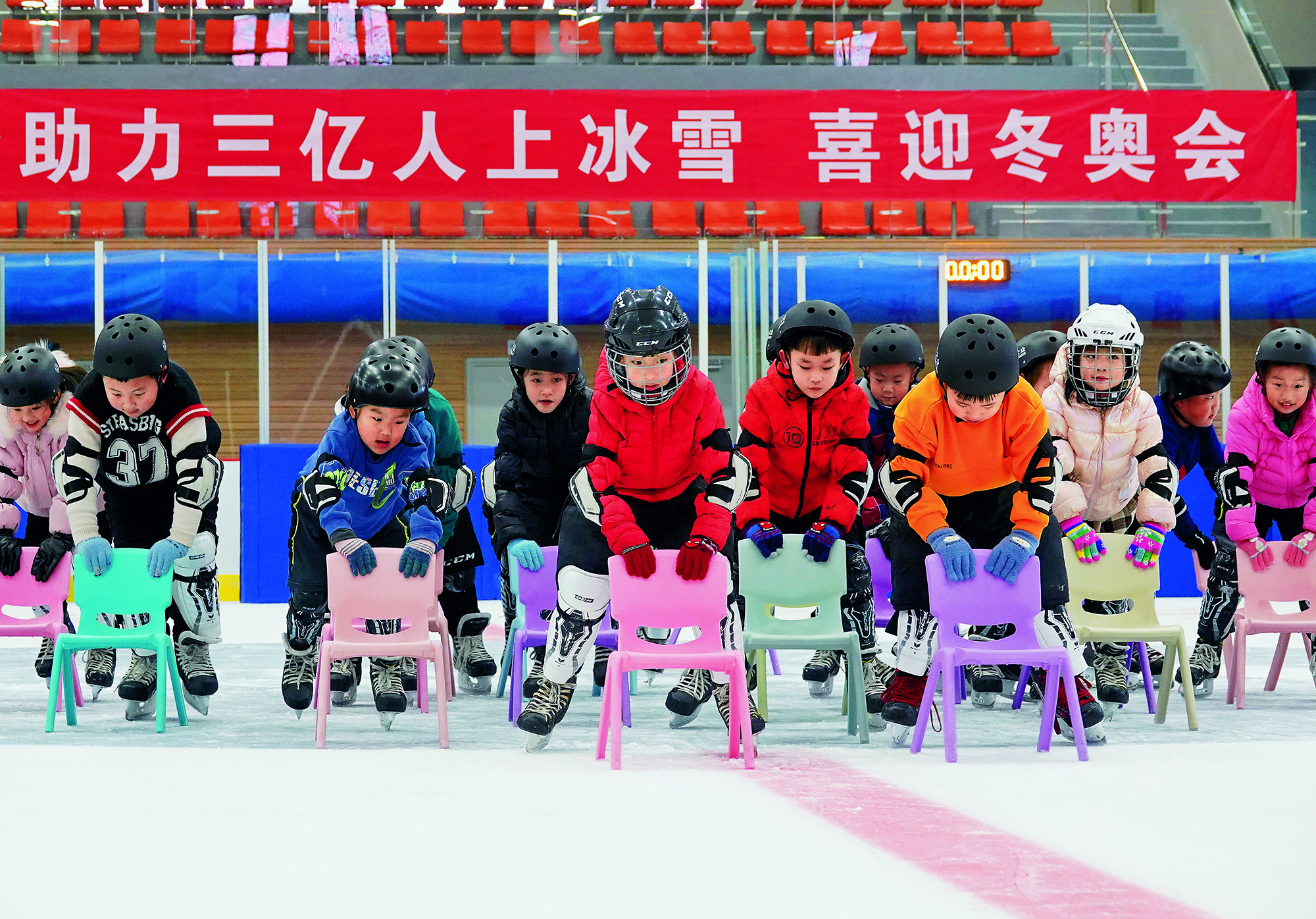 2022年2月20日,北京,由2022北京新闻中心主办的“双奥之城新气象——2022中外媒体北京行 ”城市形象特色采访活动走进南宫国际冰上运动中心,小学员在冰球比赛前望向看台