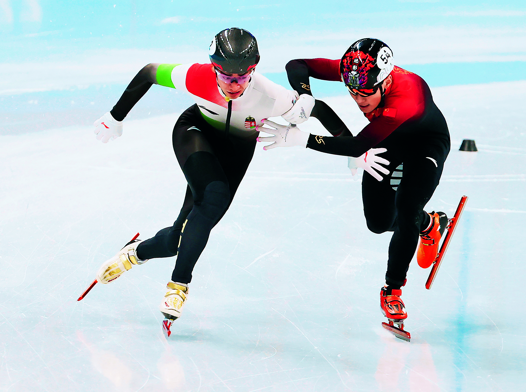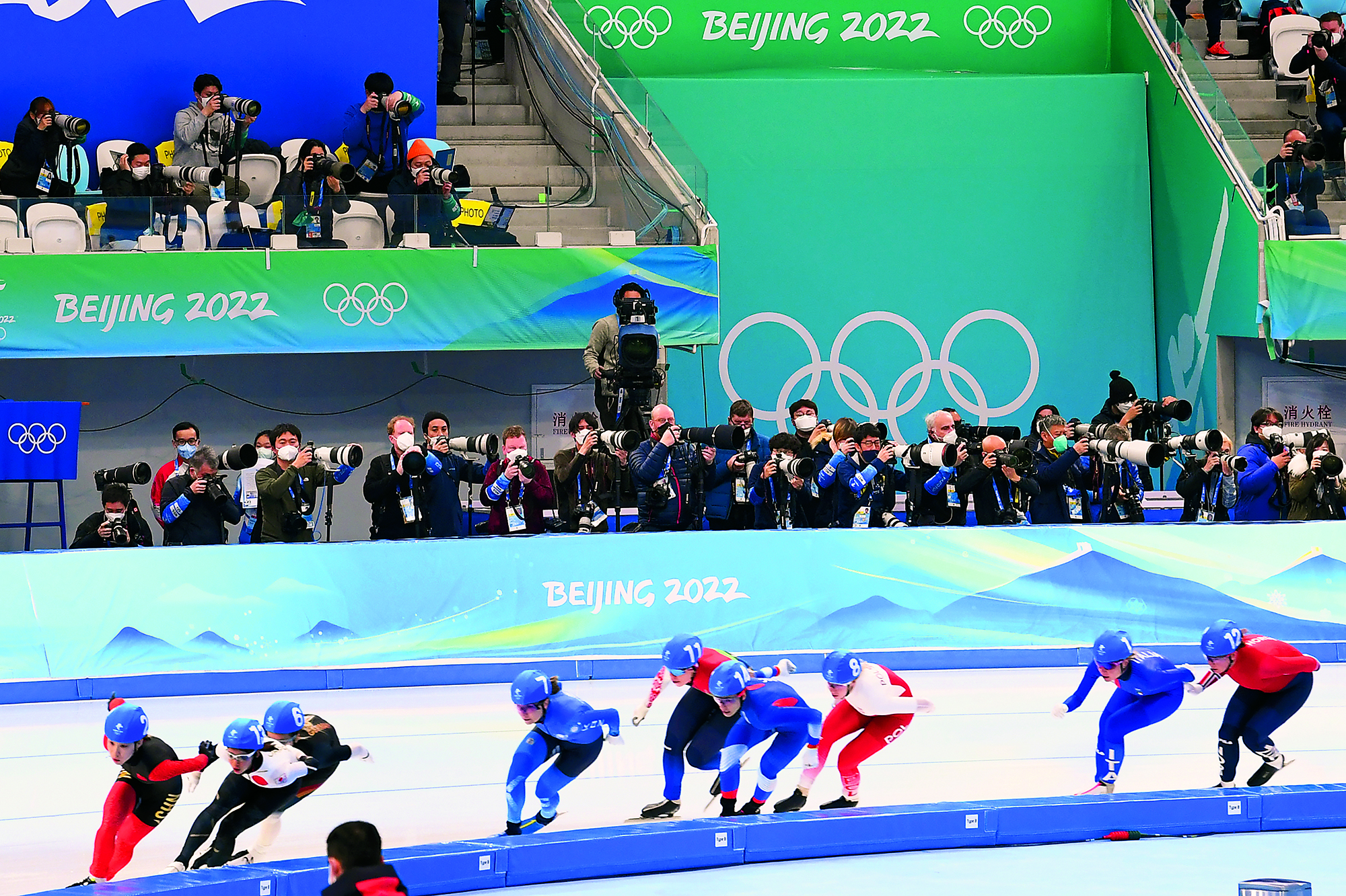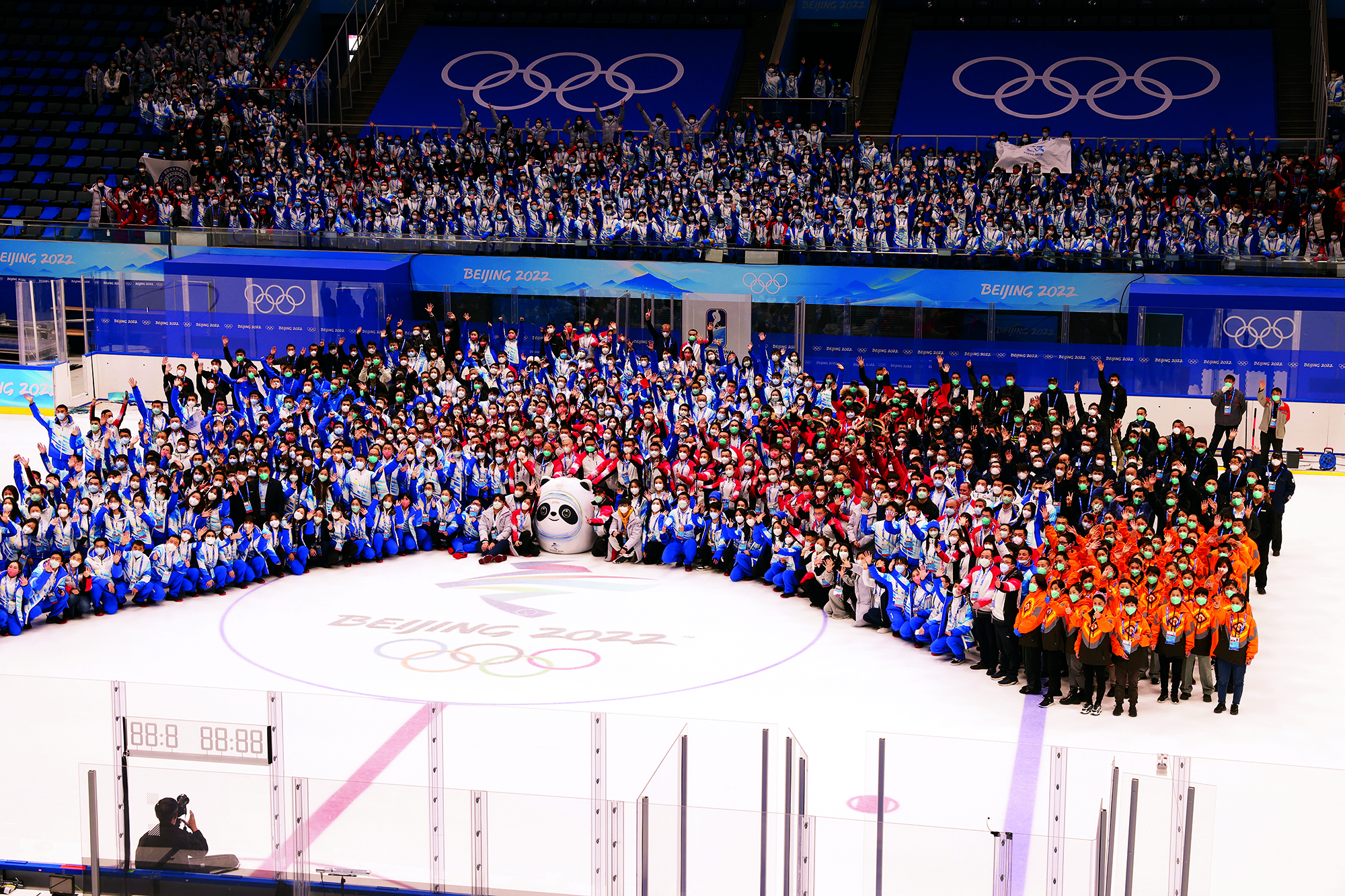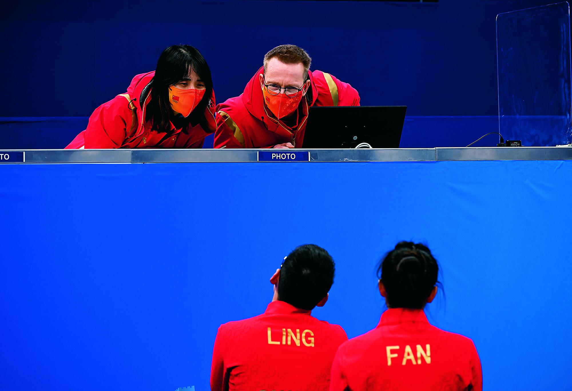 2022年2月20日,北京,由2022北京新闻中心主办的“双奥之城新气象——2022中外媒体北京行 ”城市形象特色采访活动走进南宫国际冰上运动中心,小学员在冰球比赛前望向看台