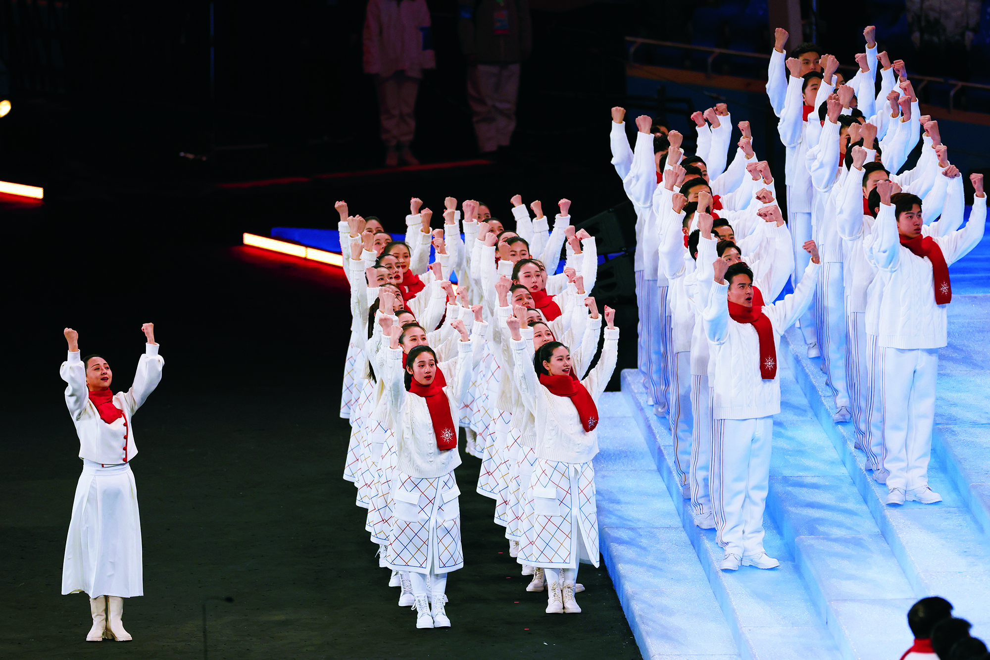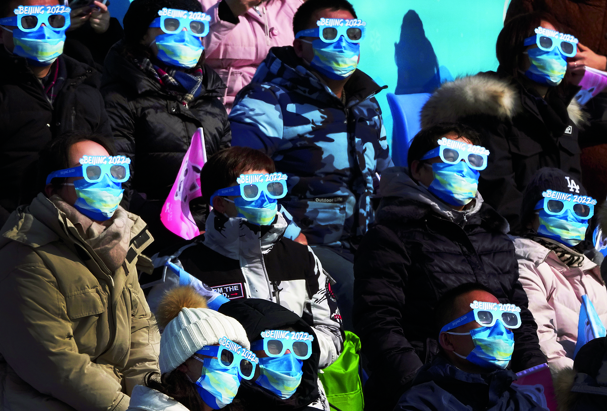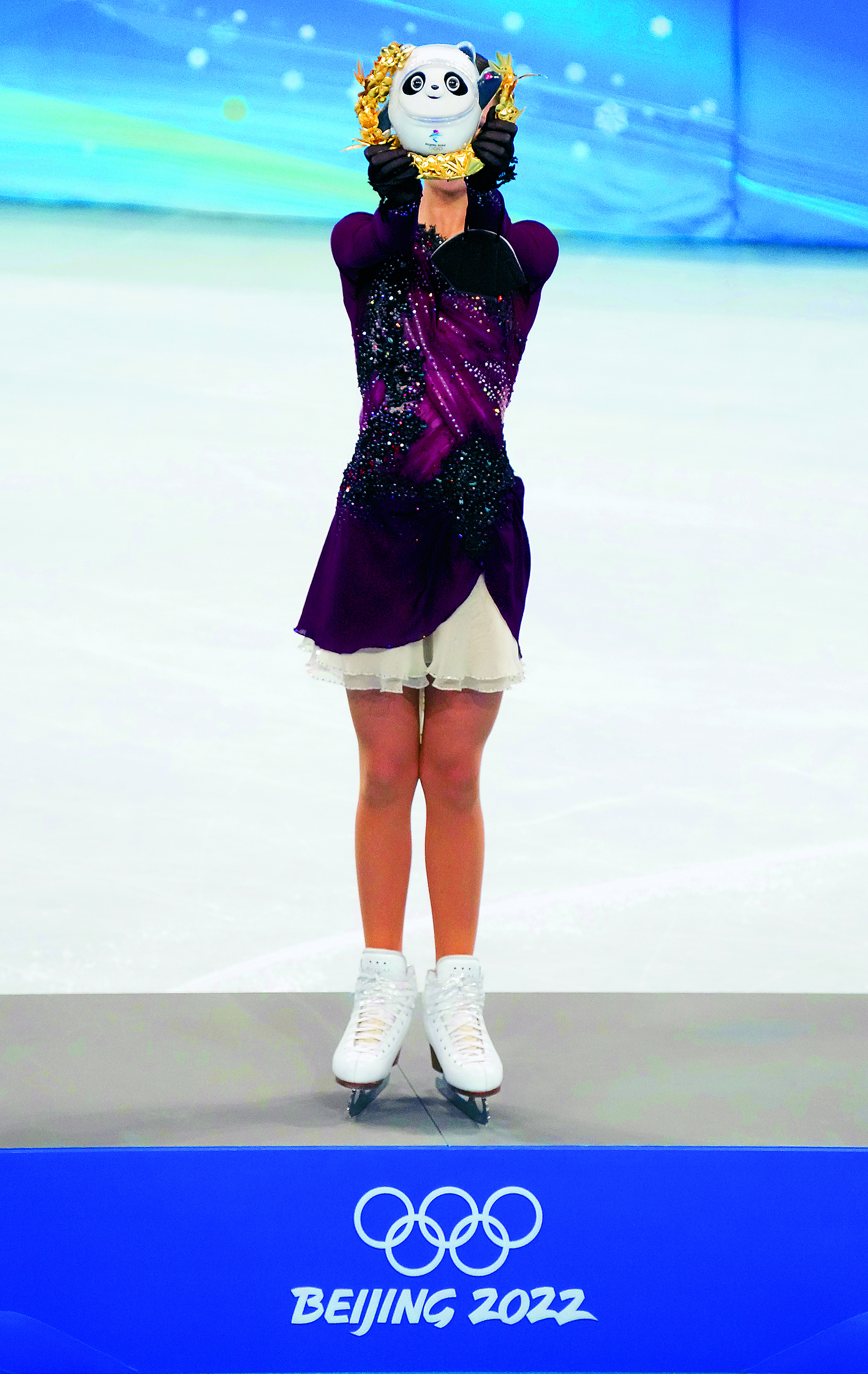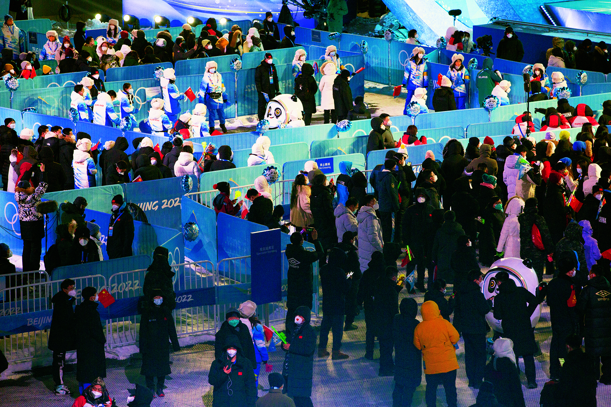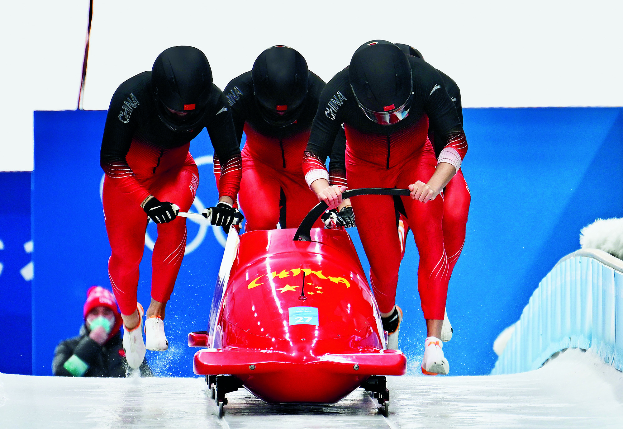 2022年2月20日,北京,由2022北京新闻中心主办的“双奥之城新气象——2022中外媒体北京行 ”城市形象特色采访活动走进南宫国际冰上运动中心,小学员在冰球比赛前望向看台