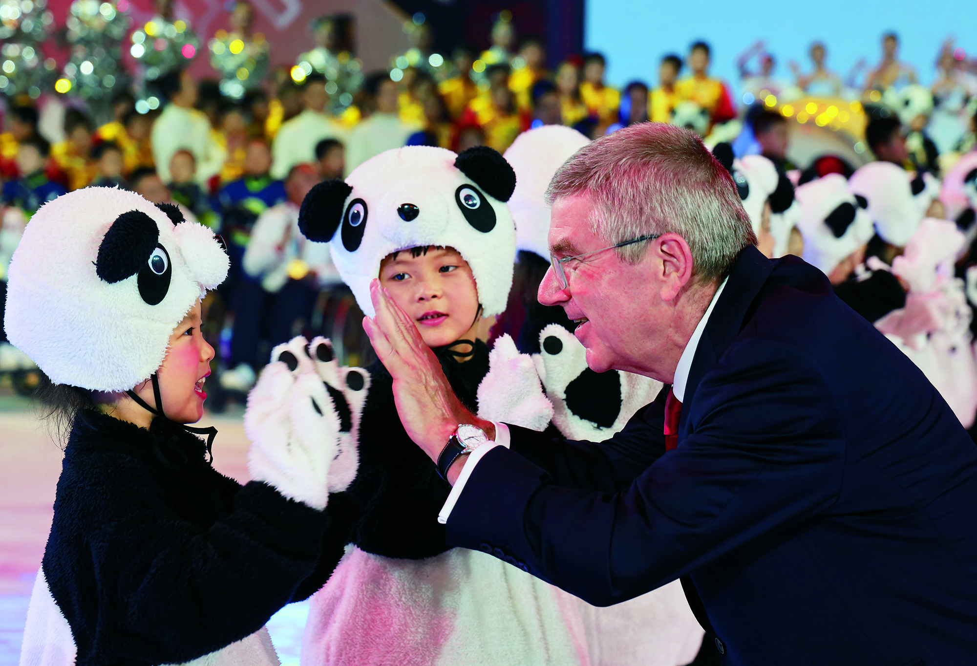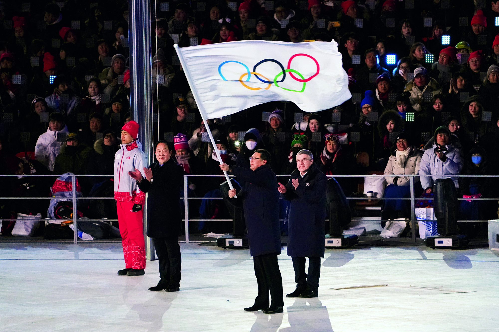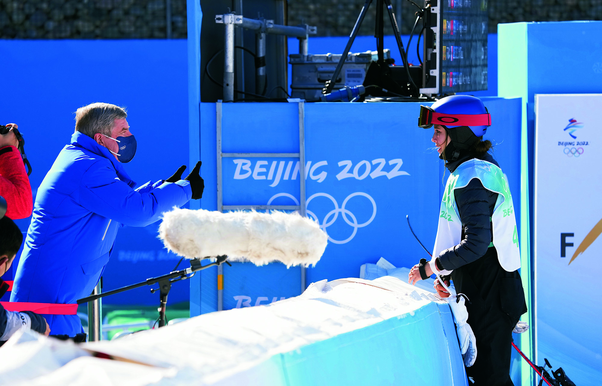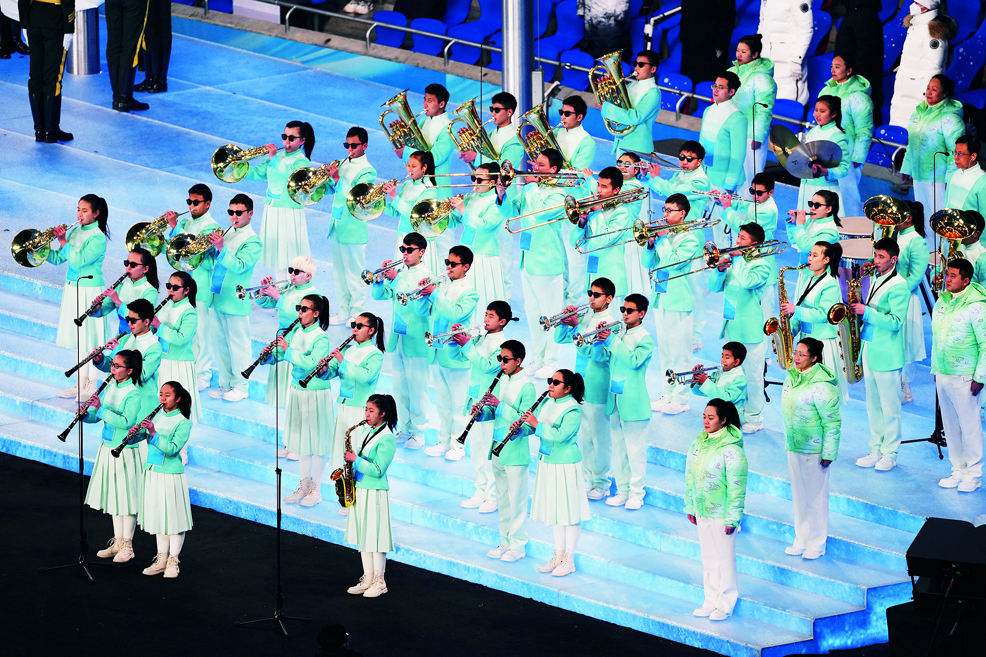 2022年2月20日,北京,由2022北京新闻中心主办的“双奥之城新气象——2022中外媒体北京行 ”城市形象特色采访活动走进南宫国际冰上运动中心,小学员在冰球比赛前望向看台