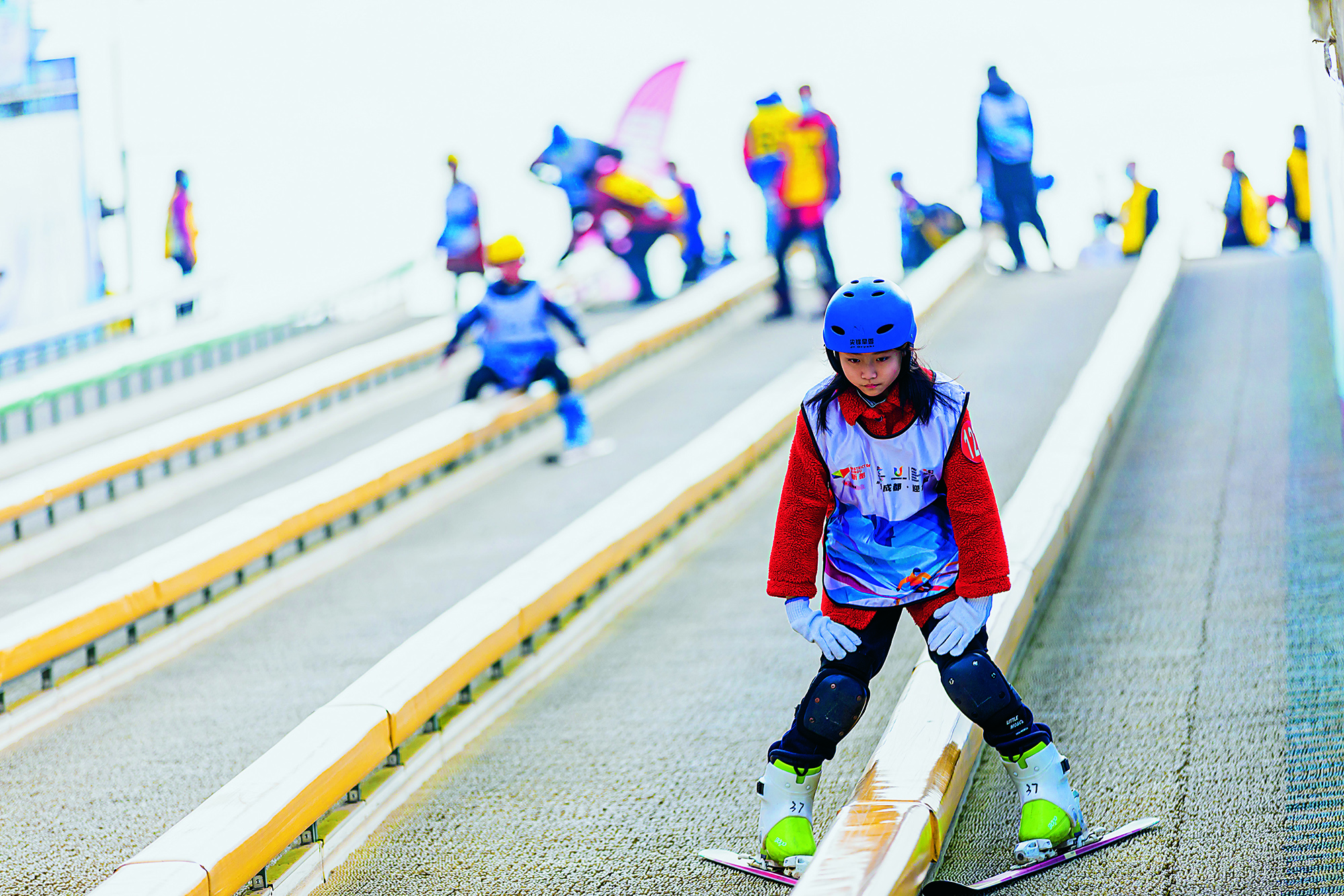 2021年12月12日,四川省成都市,初次参与旱地滑雪的小朋友在新都区尖峰旱雪场小心翼翼地在赛道上滑行