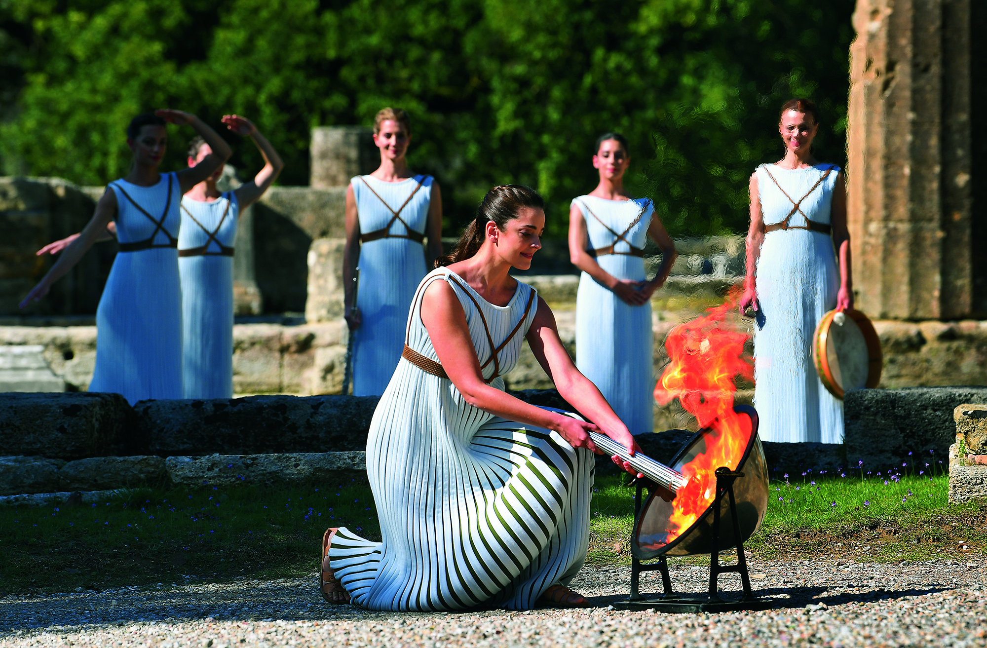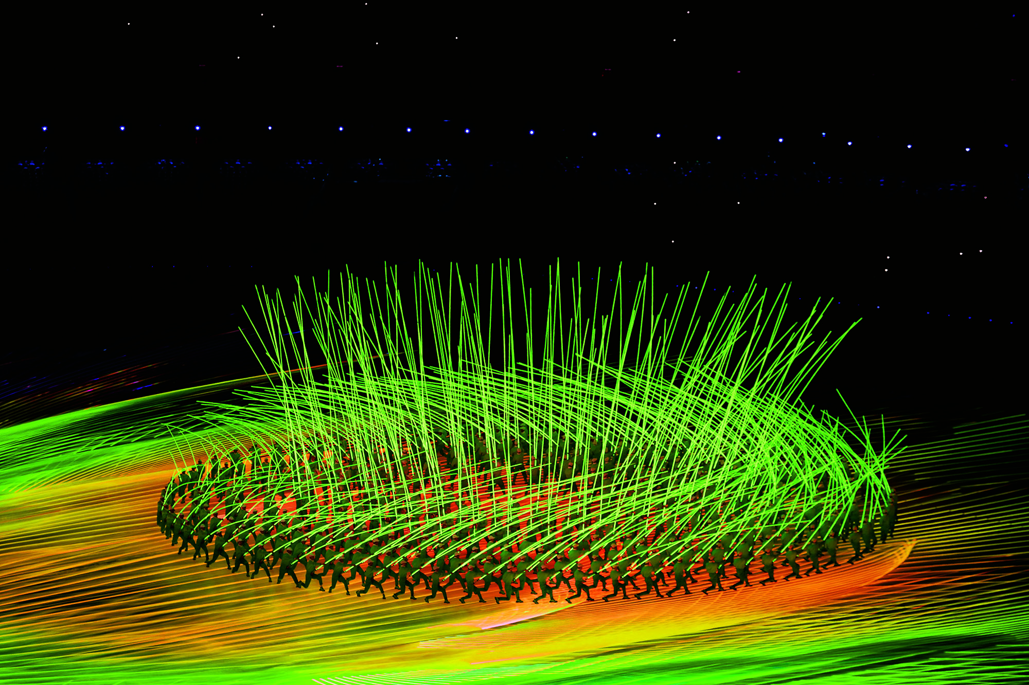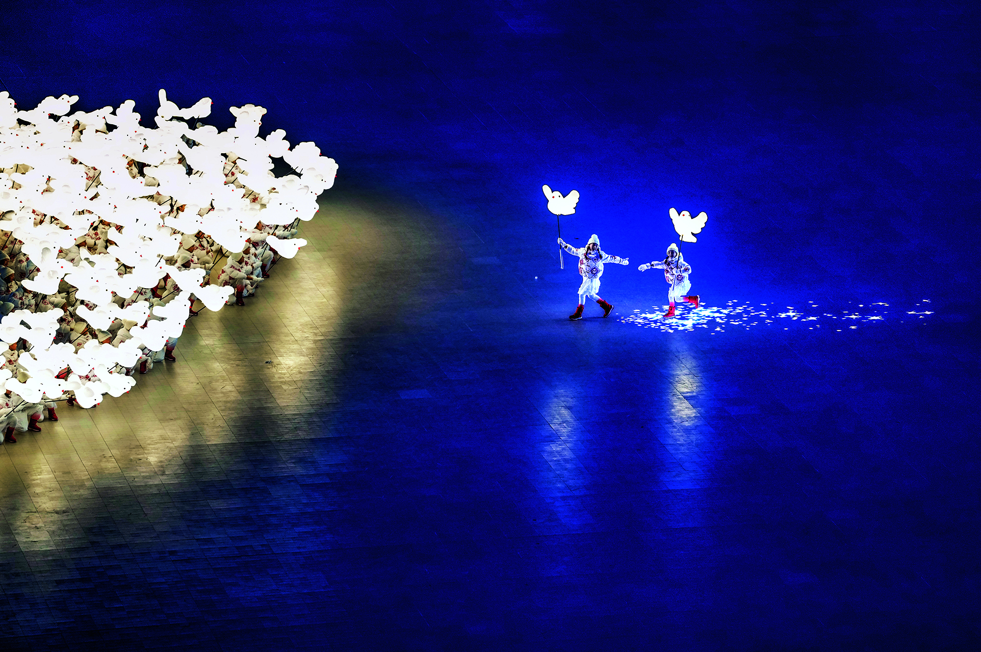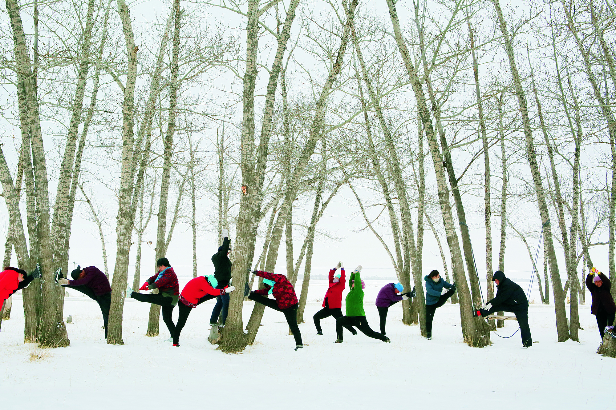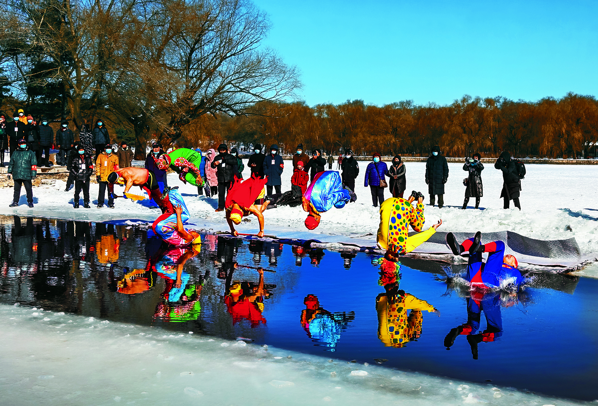 Swimmers in folk costumes dive into a lake in different positions as a special gesture to welcome the Lunar New Year amid temperatures of below minus 20 Celsius at Beiling Park in Shenyang, Liaoning Province, on January 30, 2021.