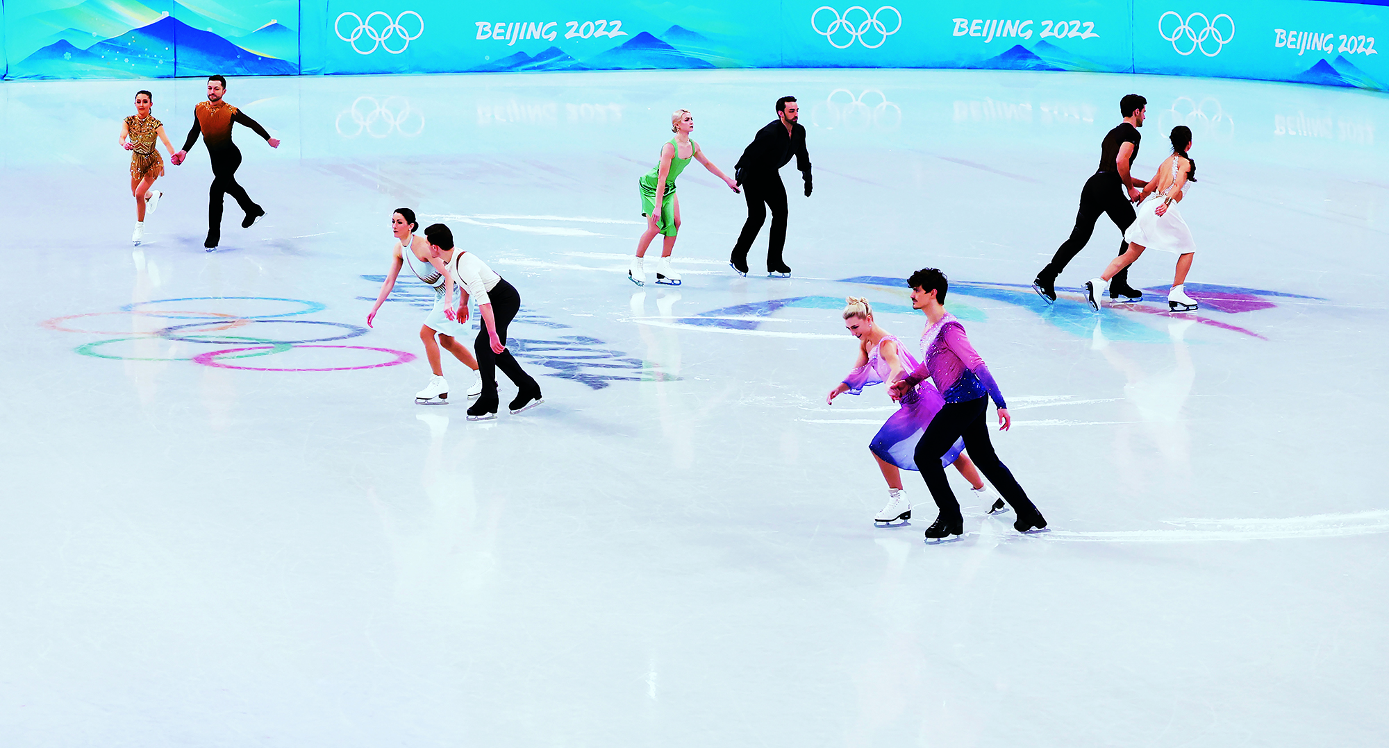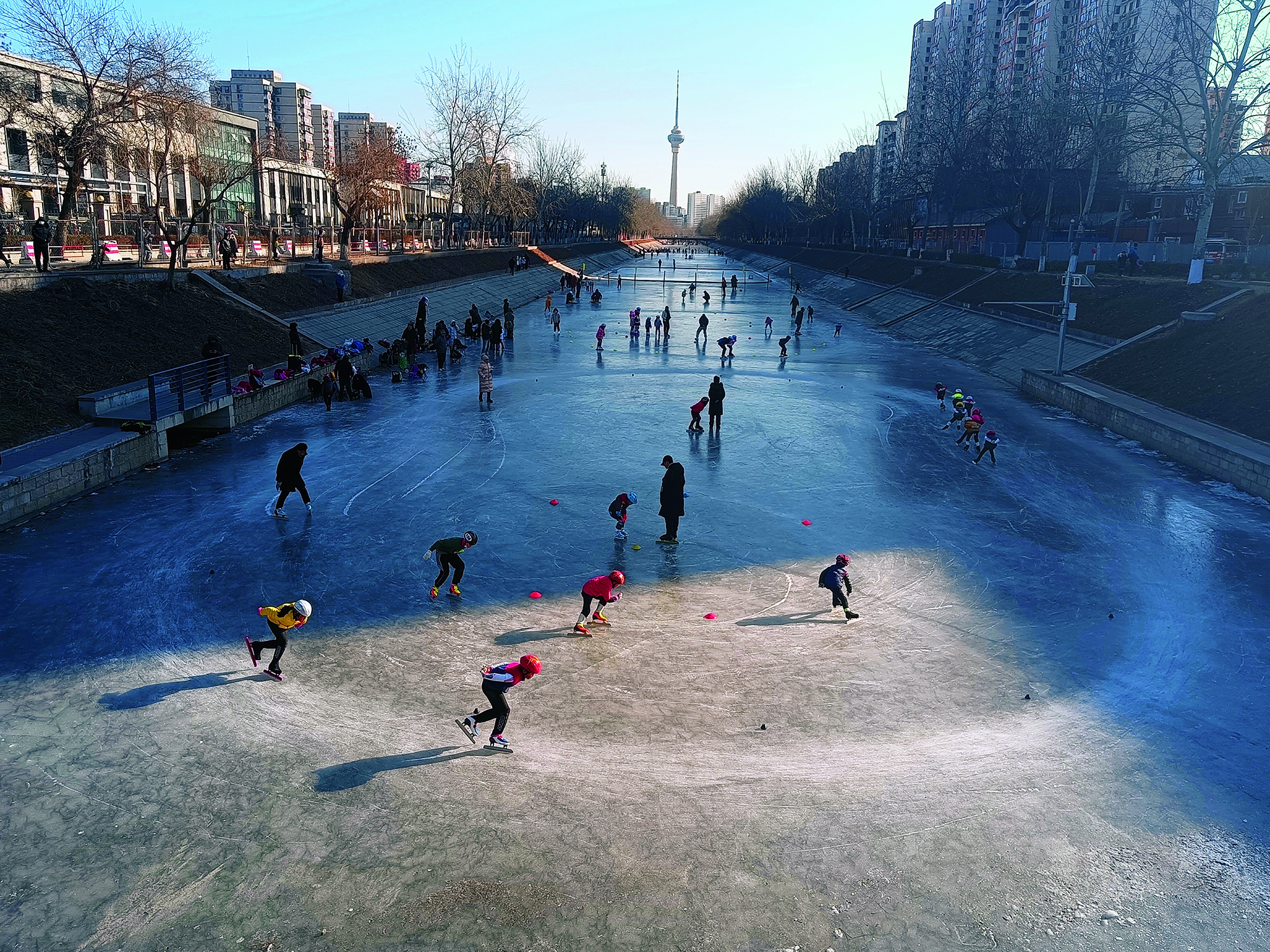 People enjoy skating on a frozen canal surface in Haidian District of Beijing on January 16, 2022.