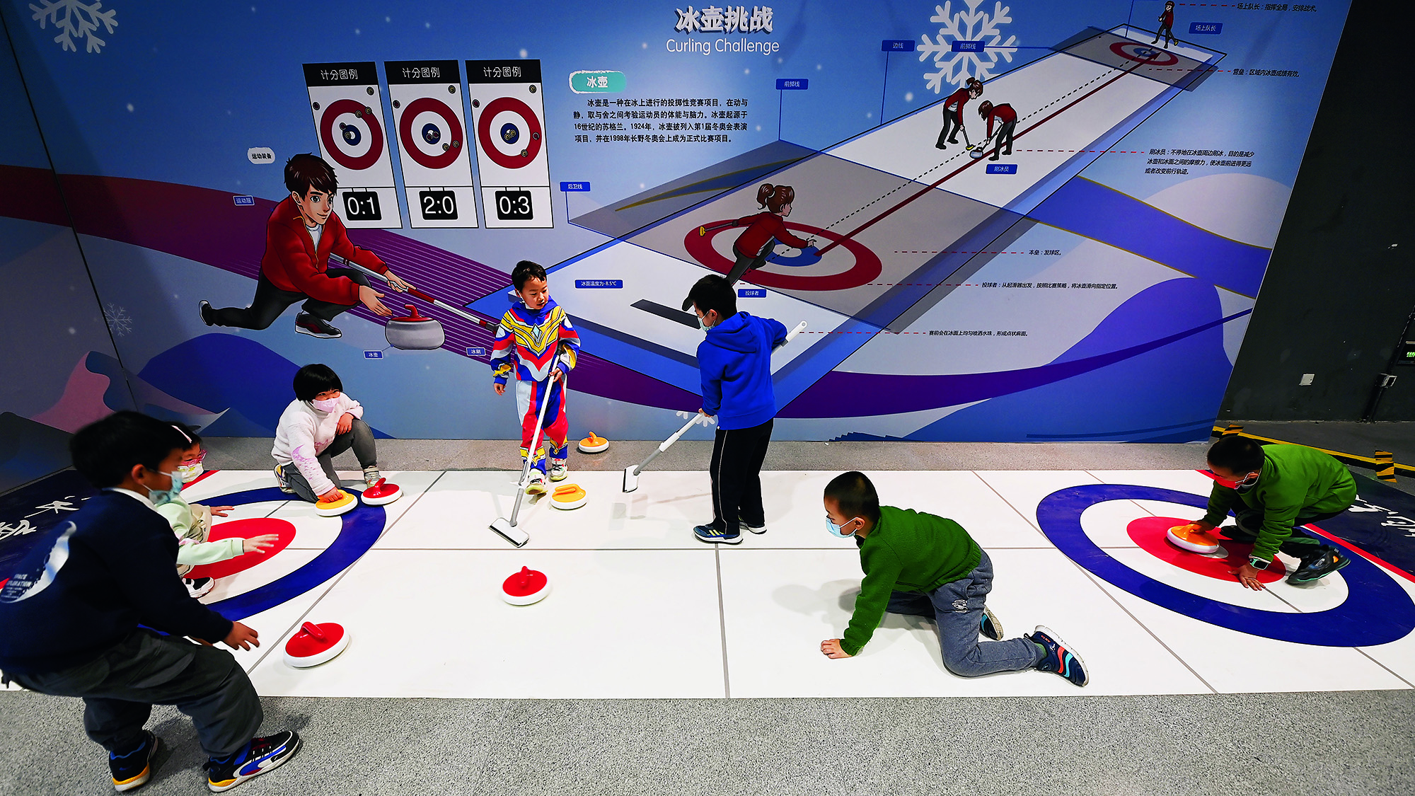 Children participate in a curling challenge activity during an exhibition to promote knowledge of the Beijing 2022 Winter Olympics and its hi-tech elements at the China Science and Technology Museum in Beijing on January 26, 2022.