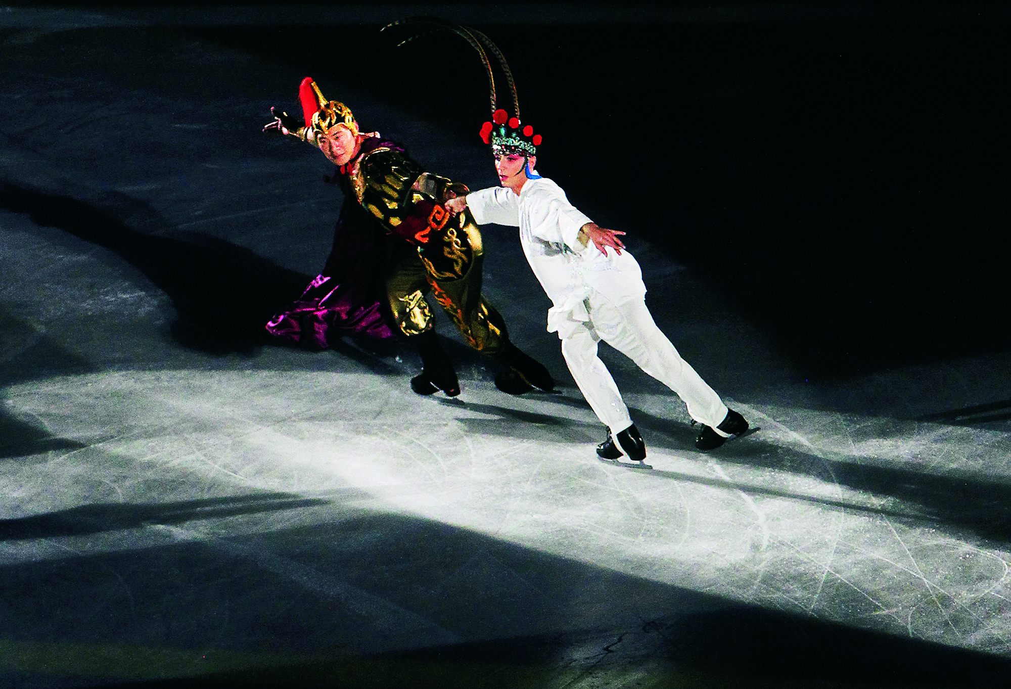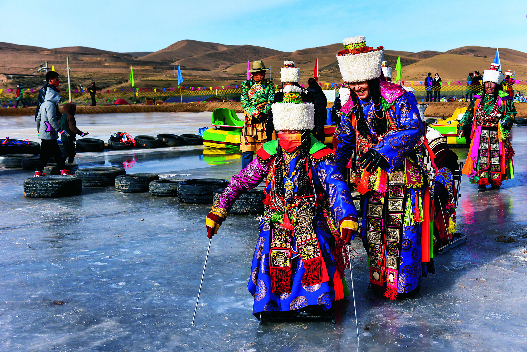 2021年12月18日,甘肃省天祝藏族自治县,身着藏族服饰的群众在松山镇冰雪场体验溜冰。 为丰富村民冬季娱乐,当地镇政府因地制宜,利用空闲地引入河水,结冰后成为各族群众体验冰雪运动的场地