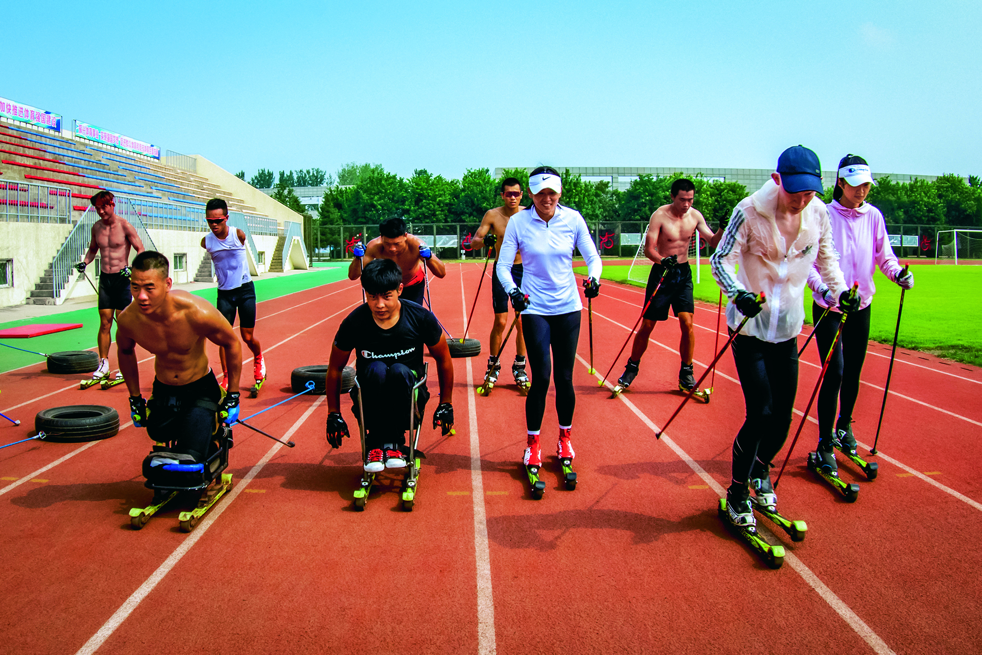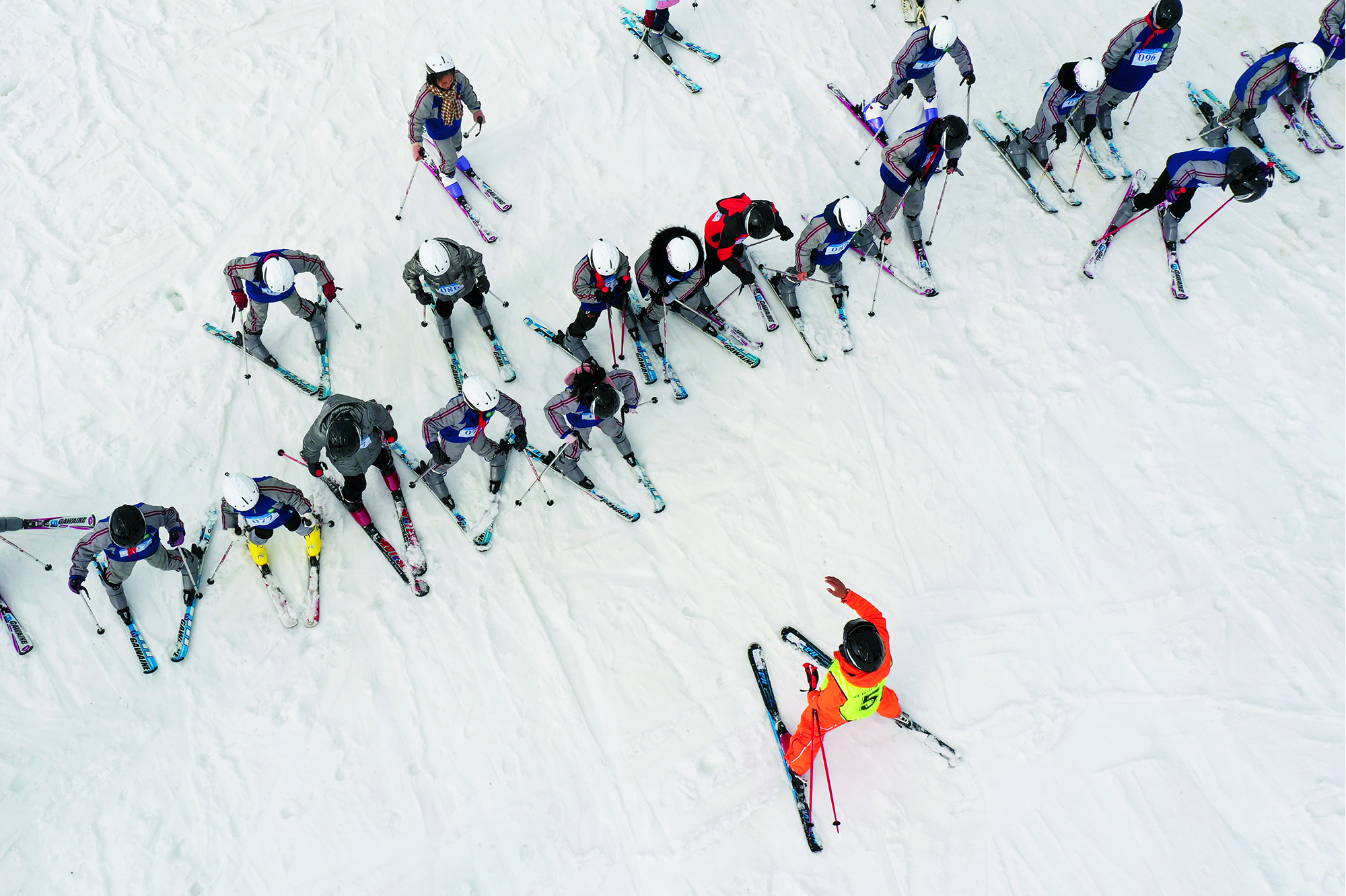 2021年12月15日,河北省张家口市,宣化二中的学生们进行雪上训练。2015年10月,河北省张家口市宣化二中 组建起全国第一所“体教结合”的冬季项目学校——张家口市青少年冬季奥林匹克运动学校。六年来,该校已为河北省队及国家队输送多名运动员,成为当地青少年铸就冬奥梦想的摇篮