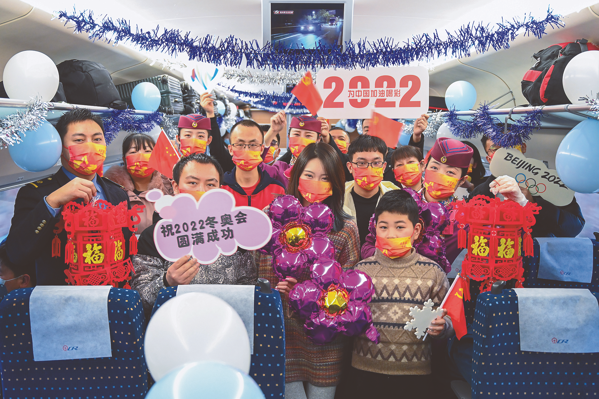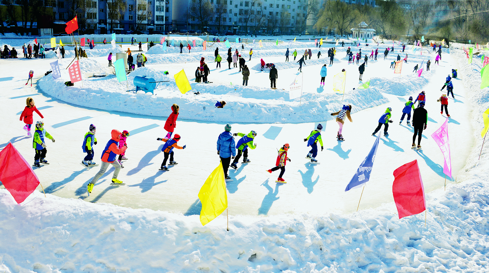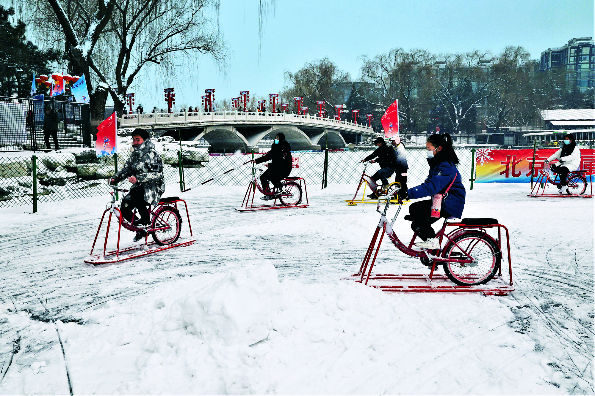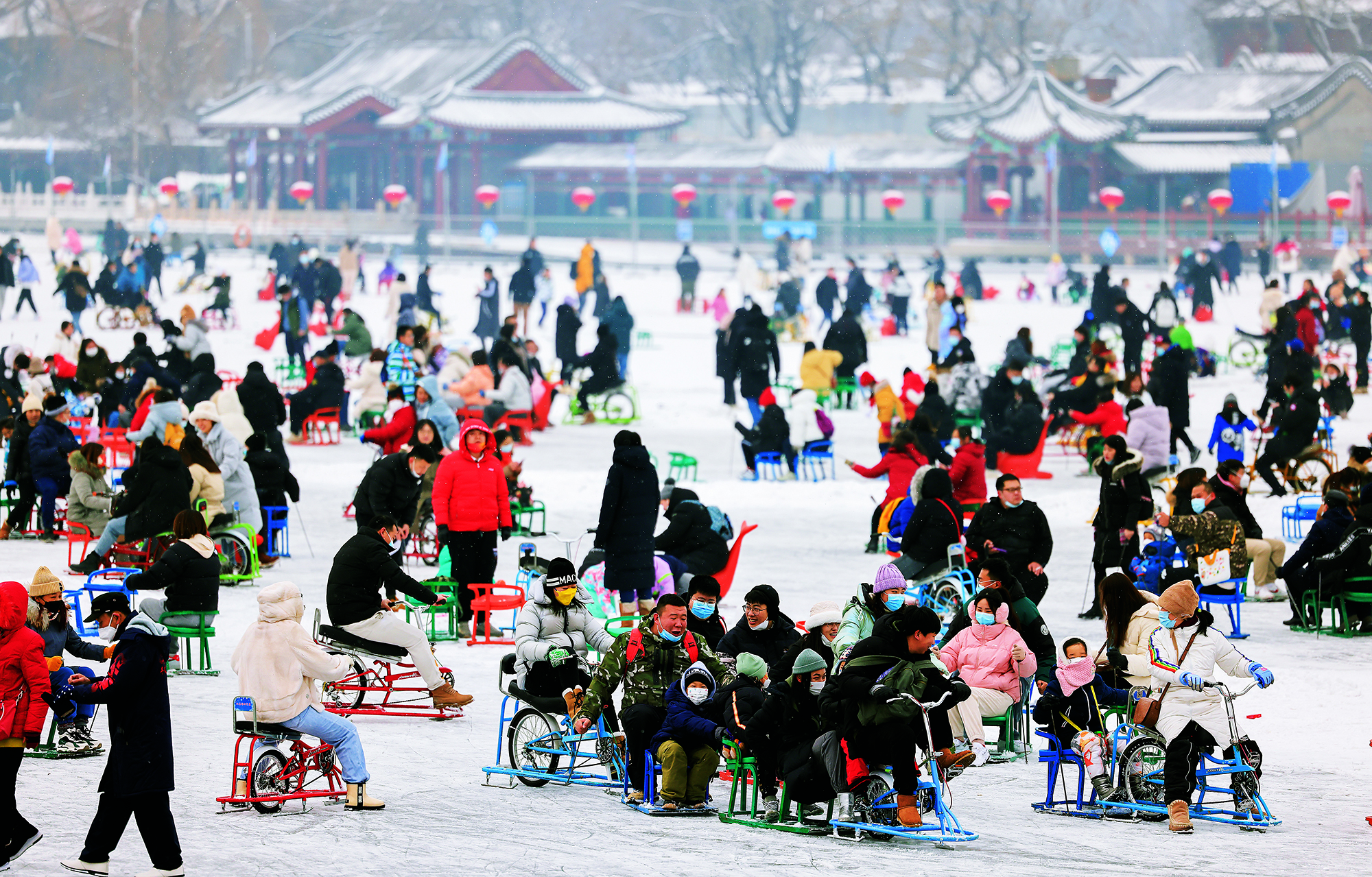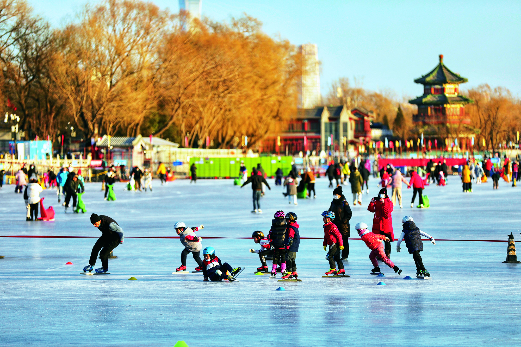 2022年1月22日,北京,市民们在什刹海冰场里体验冰上趣味项目