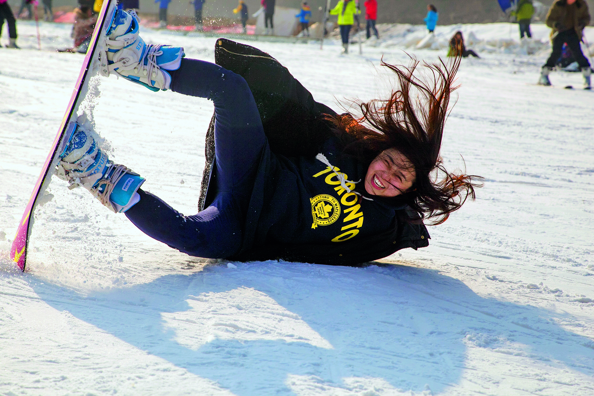 A woman falls to the ground while skiing at a resort in Xi'an, Shaanxi Province, on December 20, 2015.