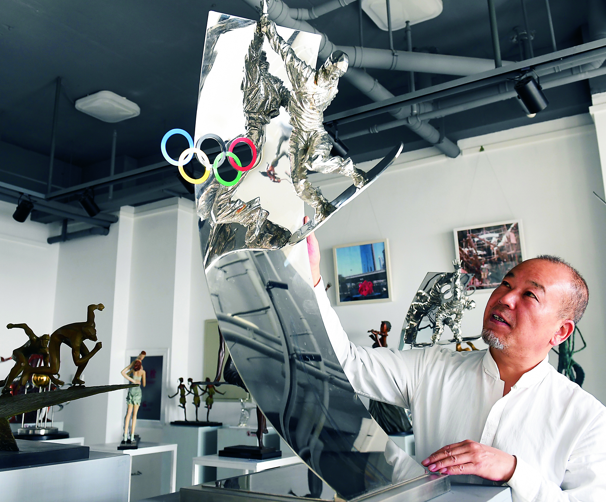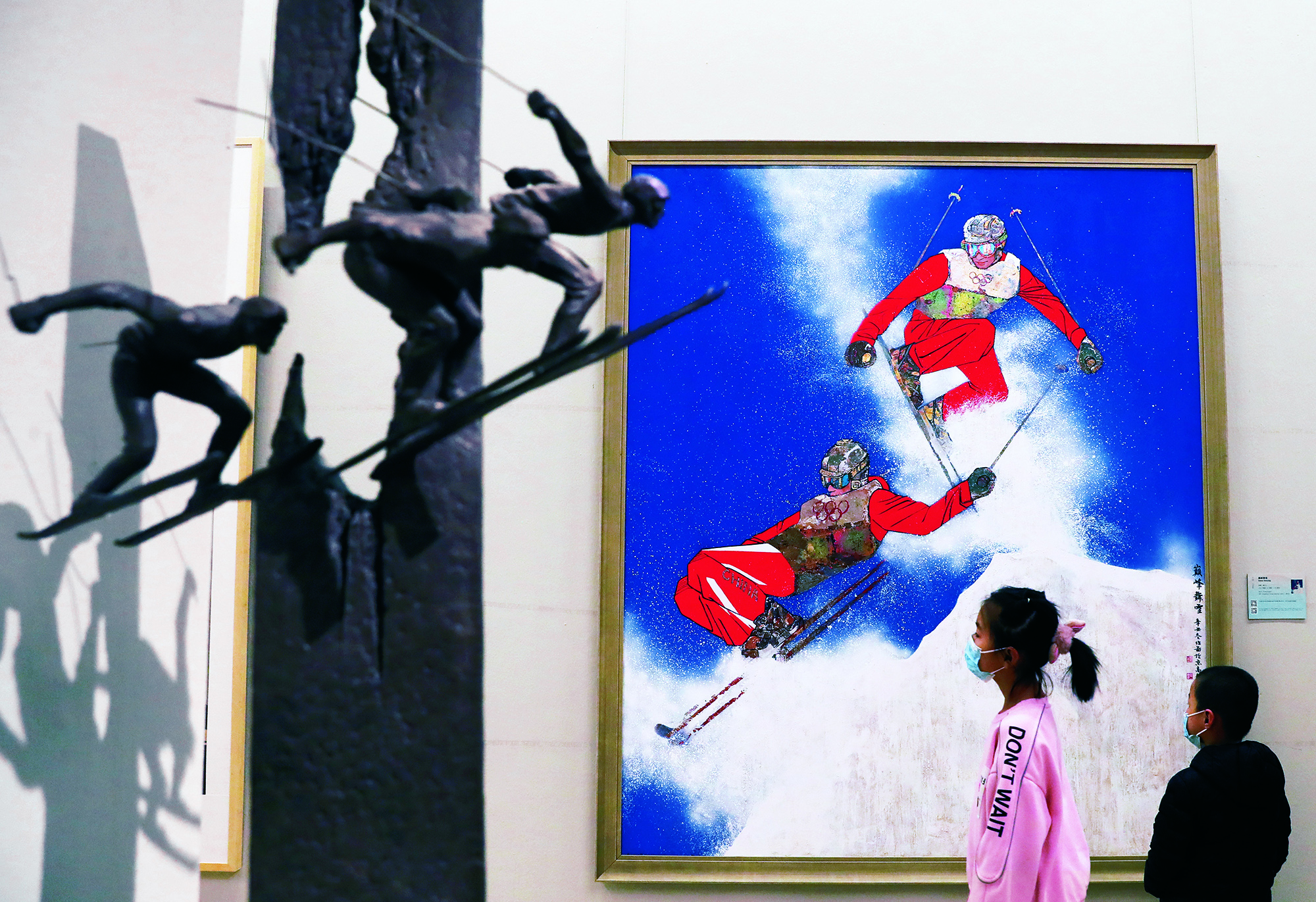 Children appreciate art works featuring the Beijing 2022 Winter Olympics during the 9th Beijing International Art Biennale held at the National Art Museum of China in Beijing on February 11, 2022.