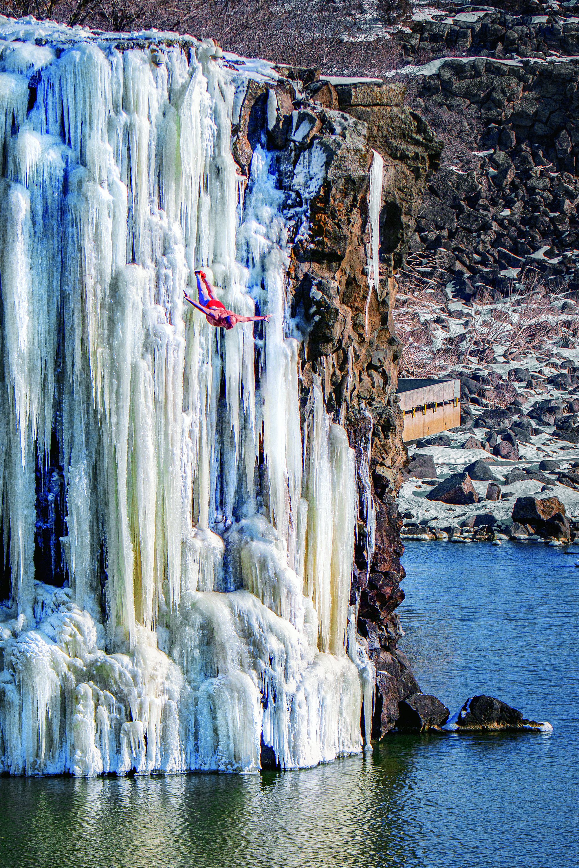 Chinese waterfall diver Di Huanran dives into the water in a cliff diving show from Diaoshuilou Chute at Jingbo Lake in the city of Mudanjiang, Heilongjiang Province, on January 11, 2021. Di has been cliff waterfall diving for 38 years.