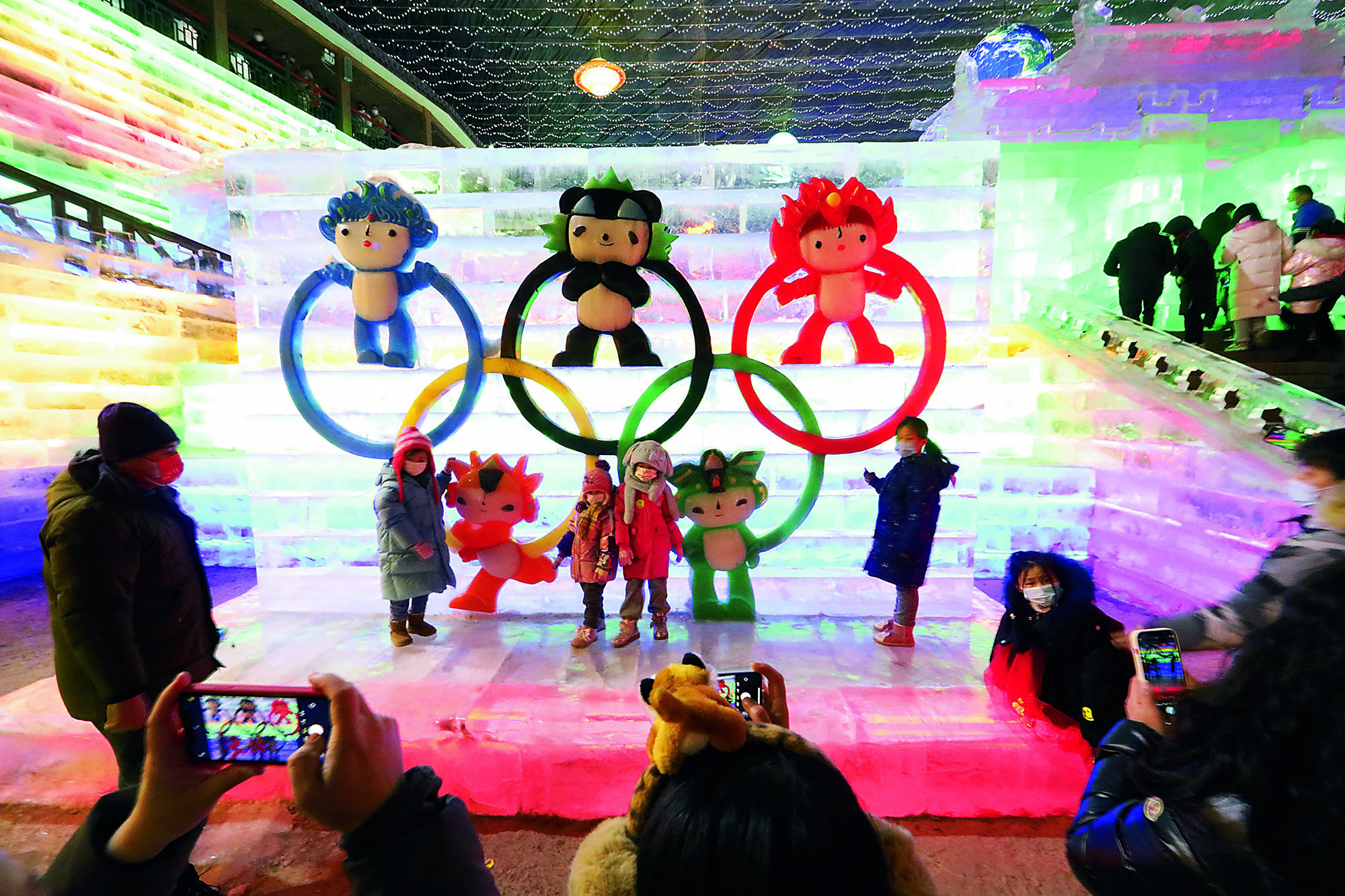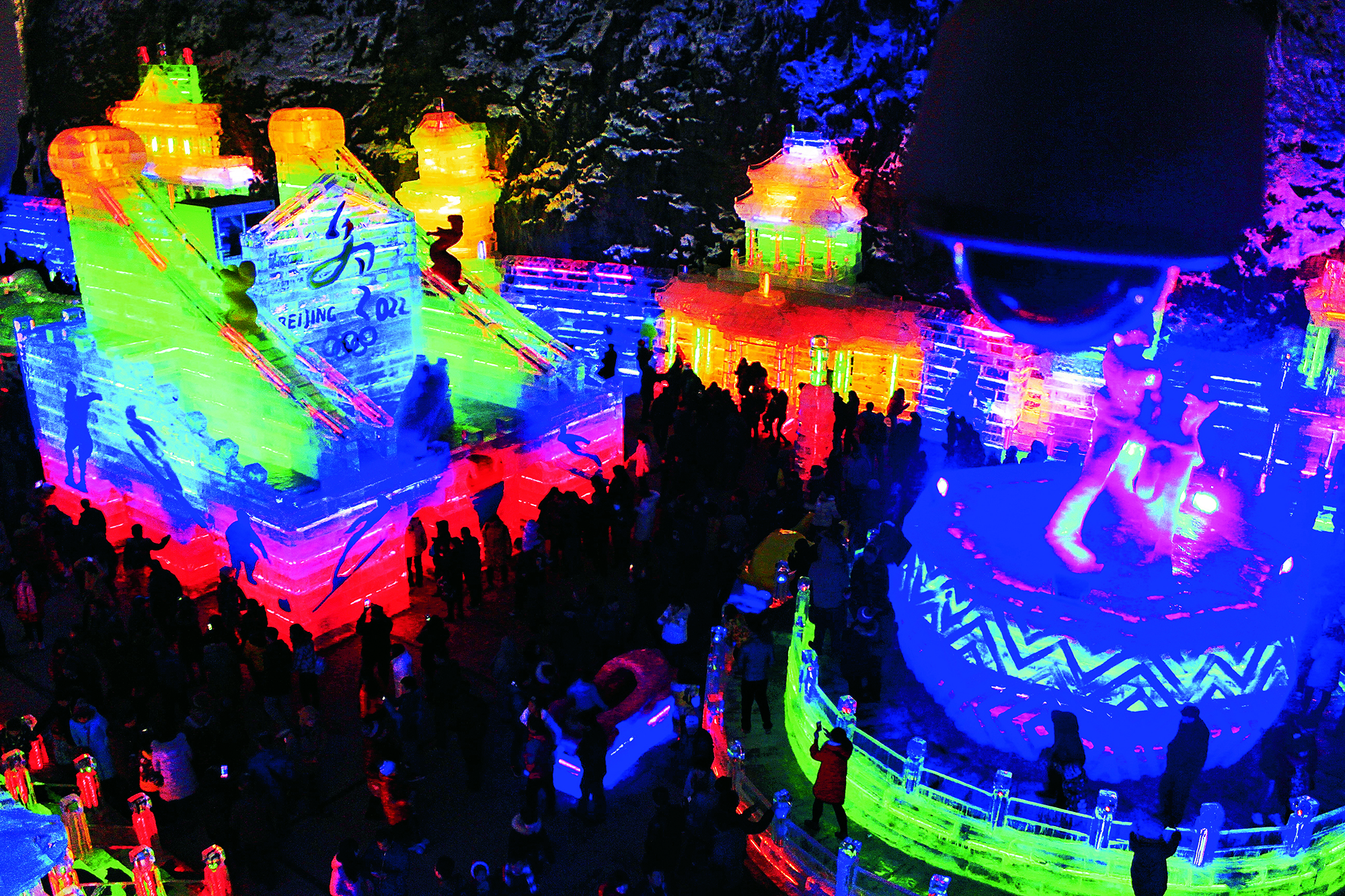 Tourists visit ice sculptures featuring the Beijing 2022 Winter Olympics at the 30th Longqing Gorge Ice Lantern Festival in Beijing on February 20, 2016.
