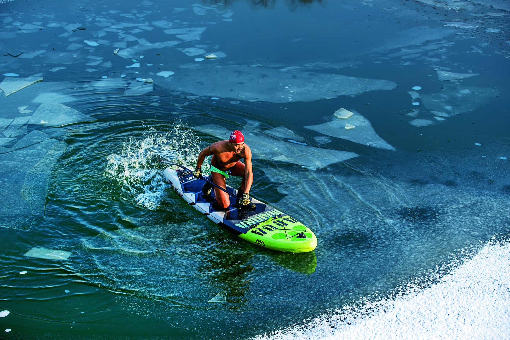 Sports enthusiast Guo Yu’nong sails on a paddle board on a winter day in Beijing on February 13, 2019.