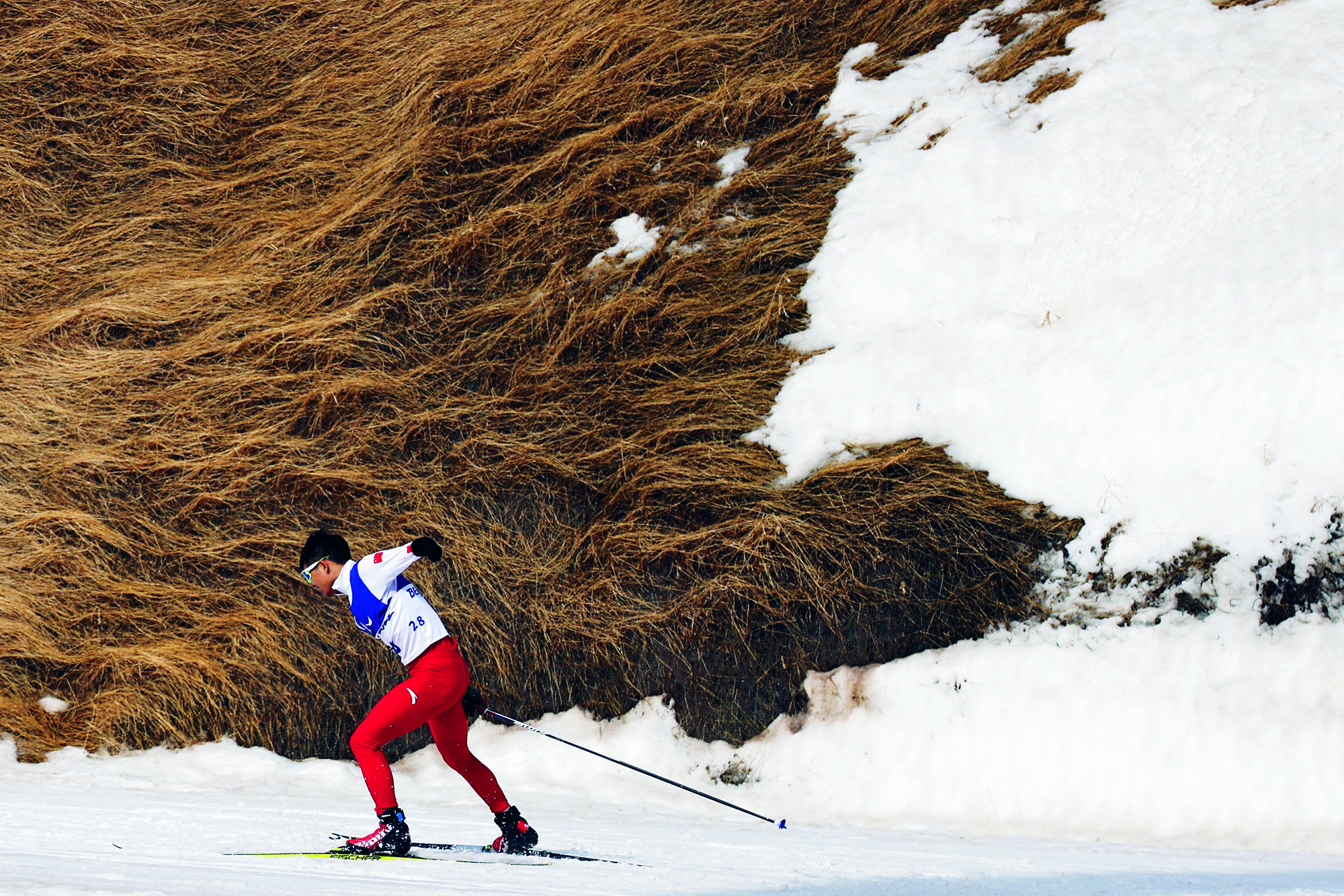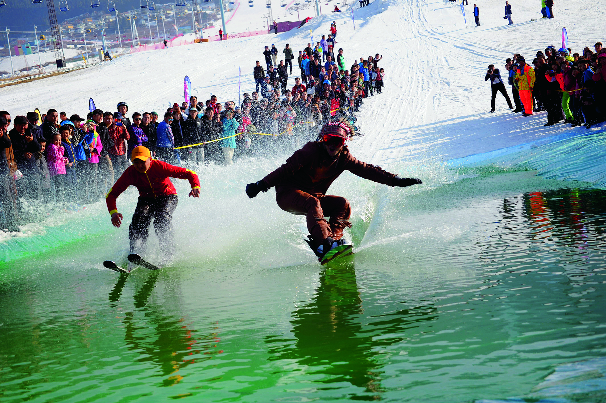 Sports enthusiasts surf on the melting area at the Silk Road International Ski Resort as a special gesture to say goodbye to the snow season and welcome spring in Urumqi, Xinjiang Uygur Autonomous Region, on March 24, 2019.