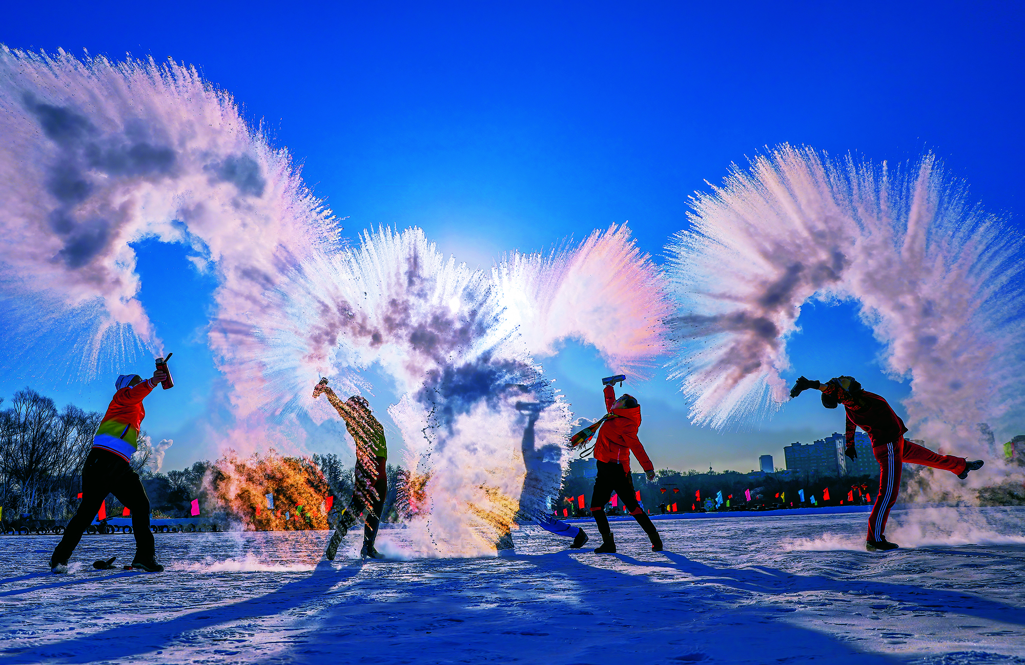 2021年1月8日,辽宁省沈阳市,当日气温低至零下22摄氏度,市民们在冰面上玩泼水成冰游戏