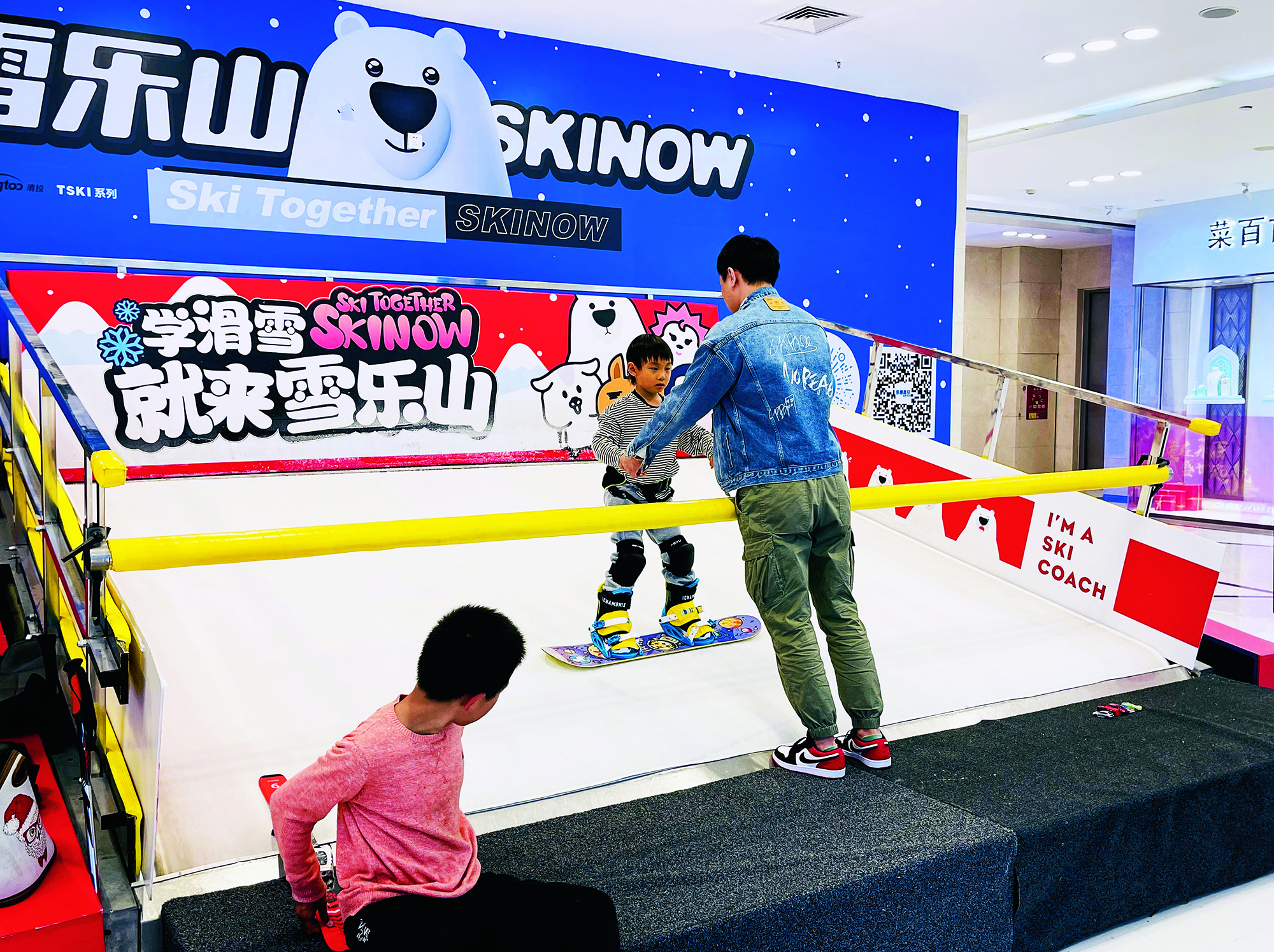 Children experience loor skiing on tracks in hengdu, Sichuan Prov-ince, on December 12, 2021.