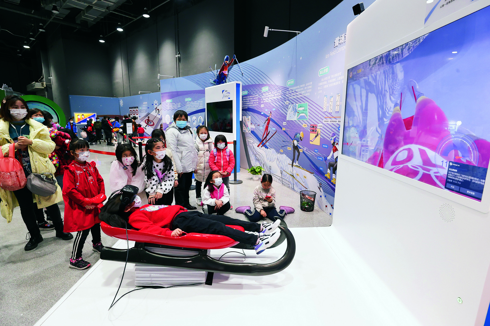 2022年2月17日,北京,小朋友们在中国科技馆举办的冬奥主题展览上利用虚拟现实技术体验雪橇运动