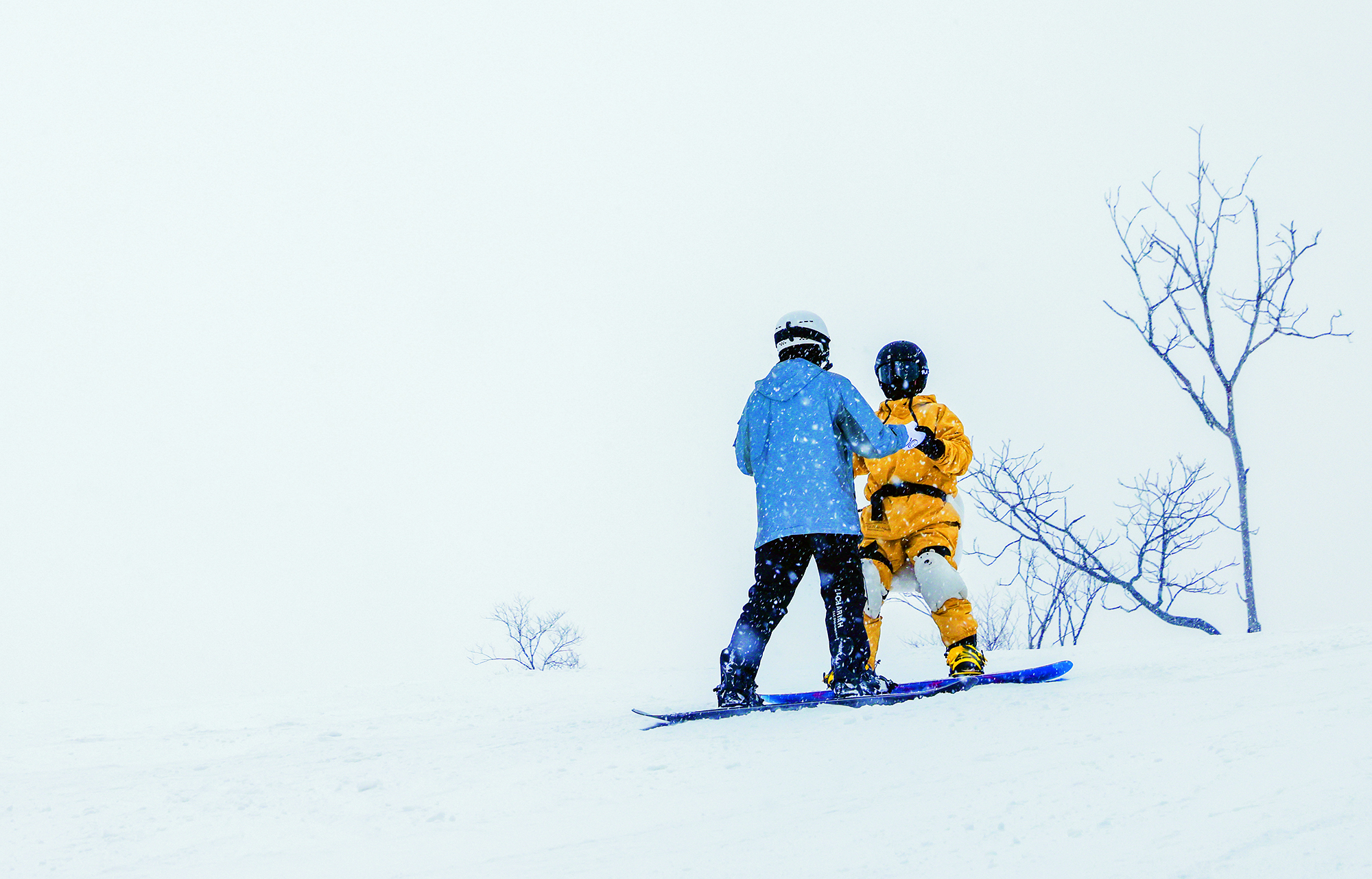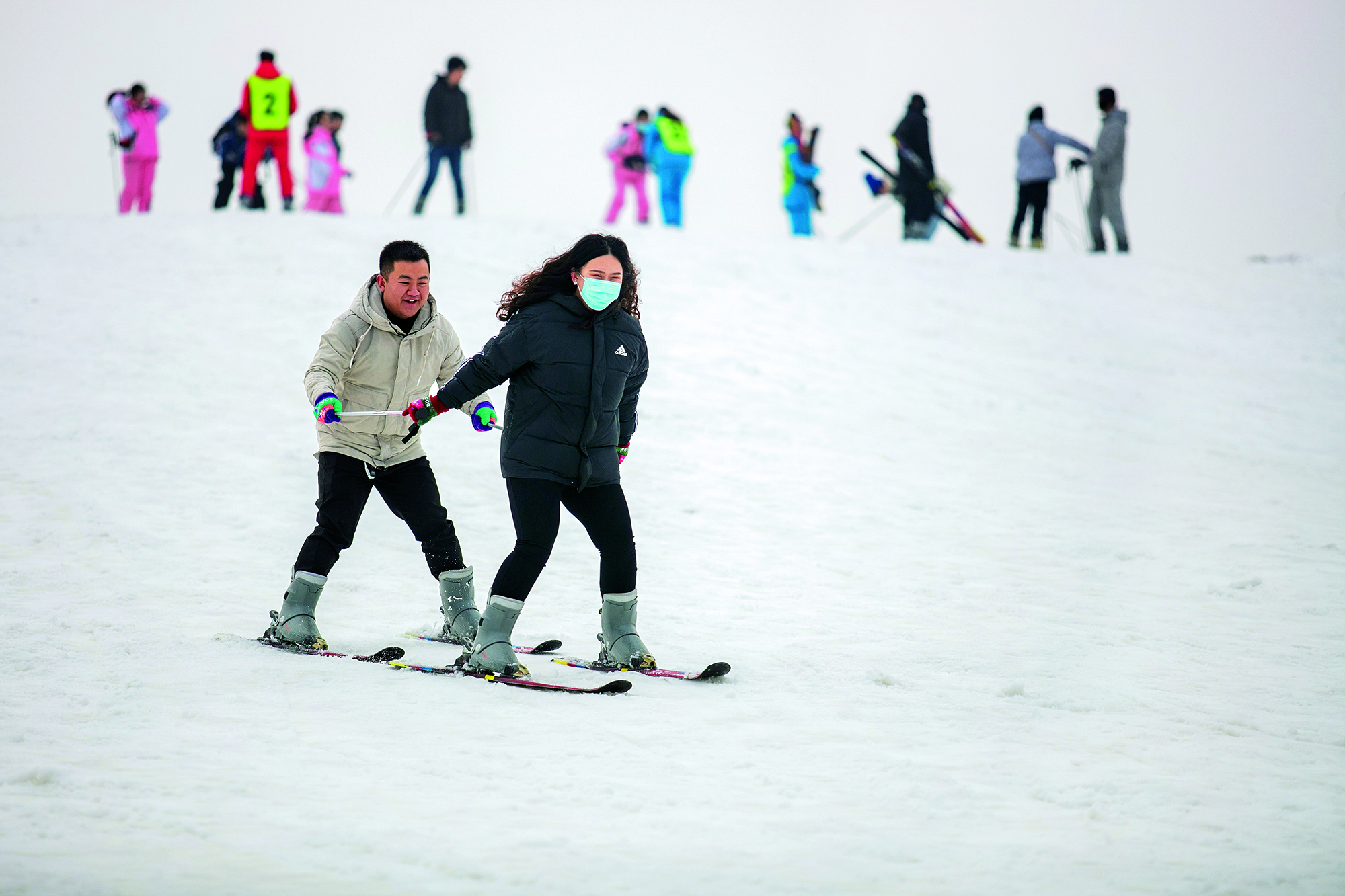 2022年1月8日,吉林省白山市,一对情侣在长白山万达国际度假区滑雪场初级雪道上练习推坡、换刃
