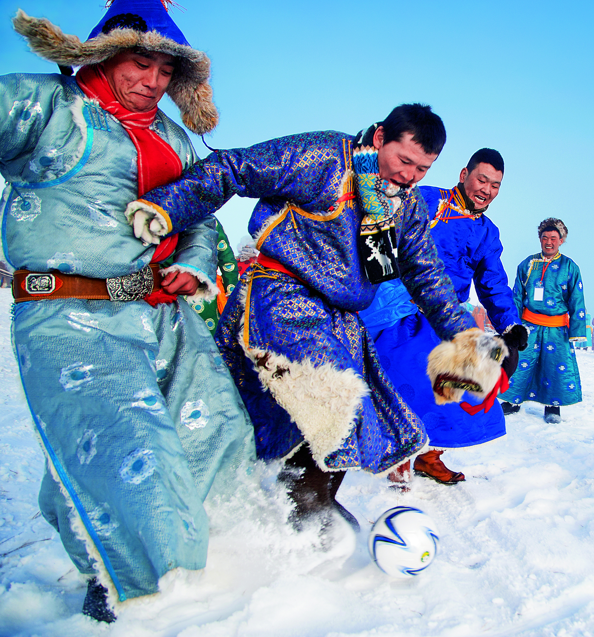 2016年12月27日,内蒙古自治区呼伦贝尔市, 冬季那达慕在陈巴尔虎旗举办,当地牧民在雪地上踢足球