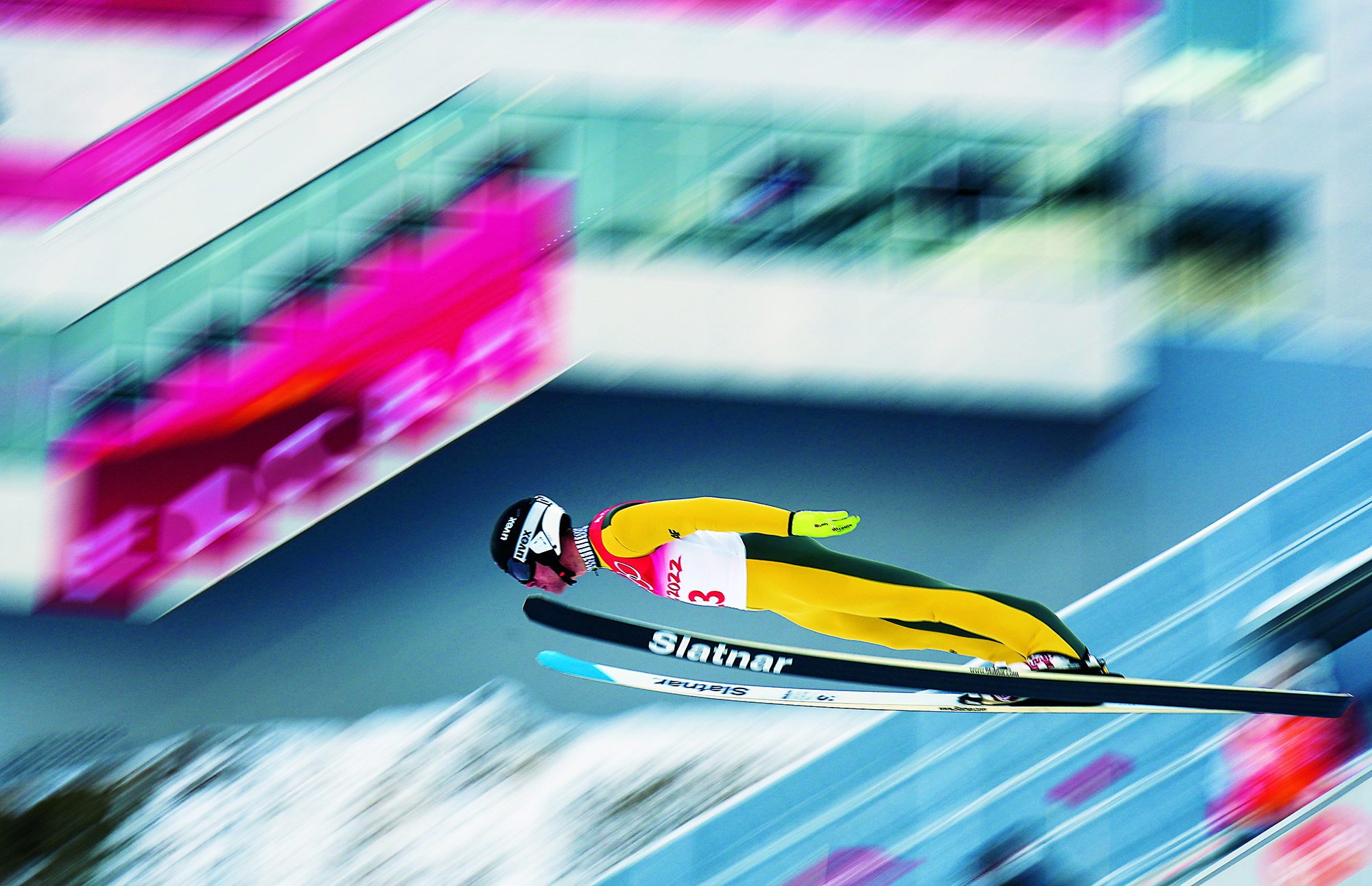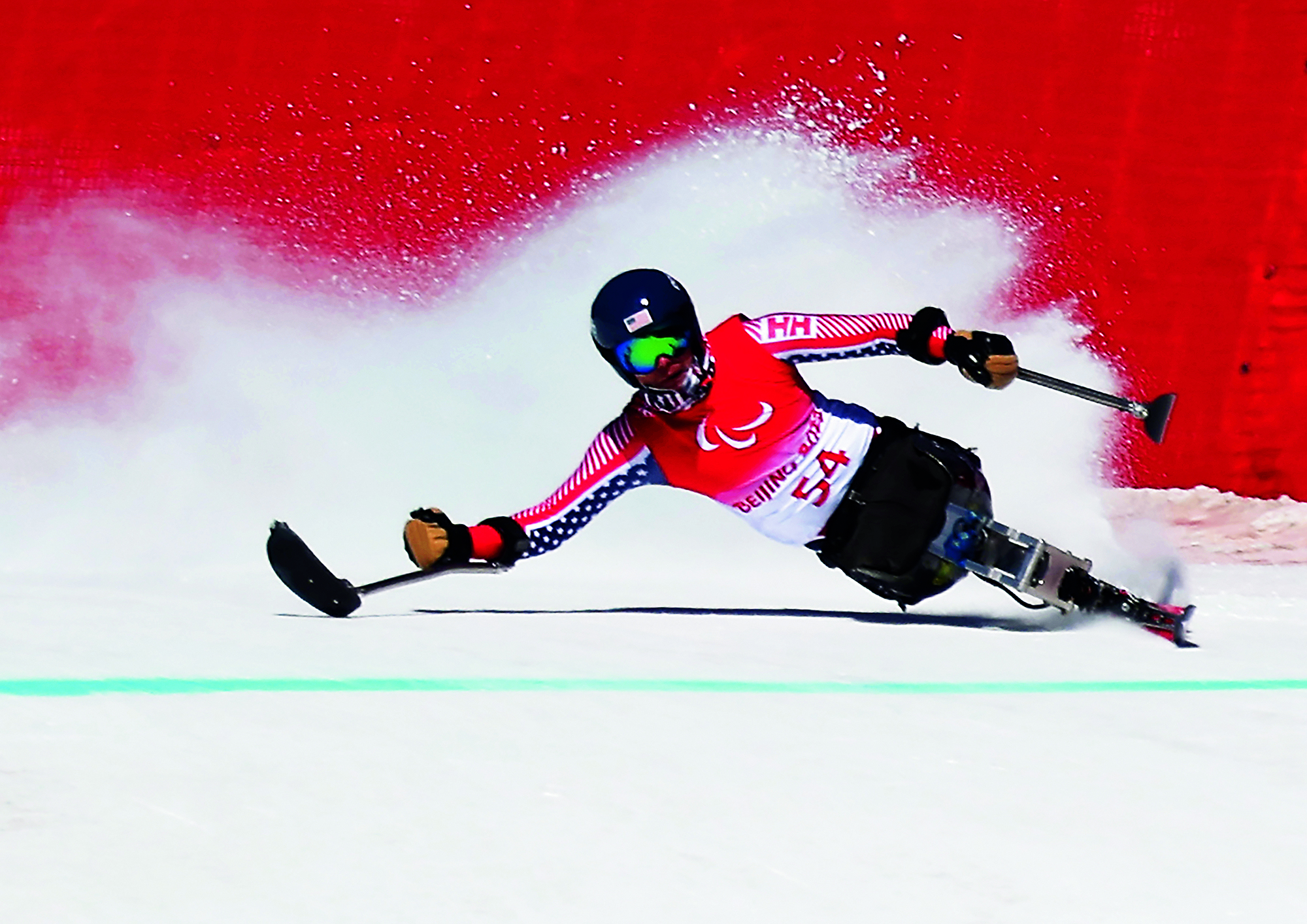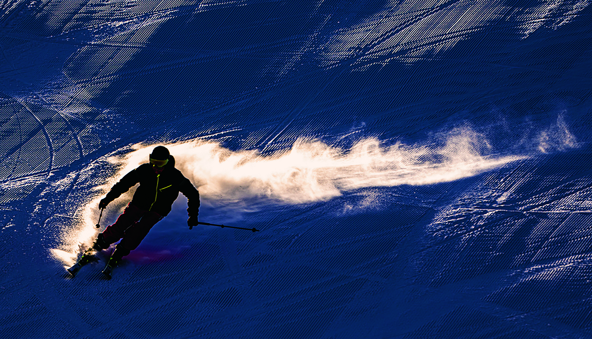 2021年12月2日,河北省张家口市,一名滑雪爱好者在崇礼万龙滑雪场高级雪道上高速滑行。