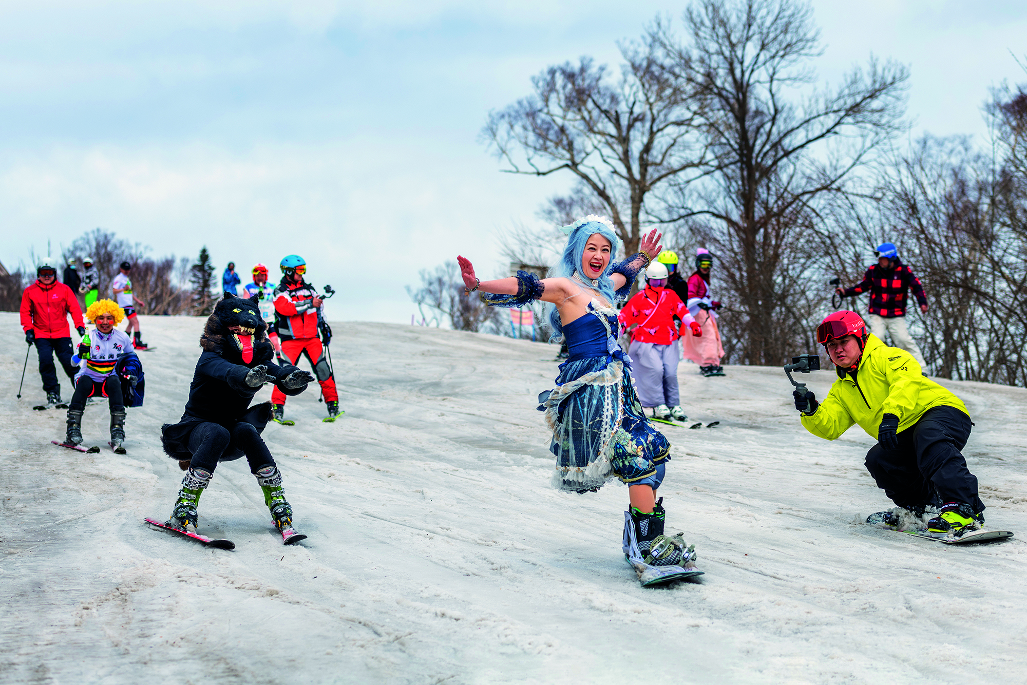 Skiers in unconventional dress enjoy a skiing event held at Yabuli Sun Mountain Ski Resort in Harbin, Heilongjiang Province, on March 28, 2021.