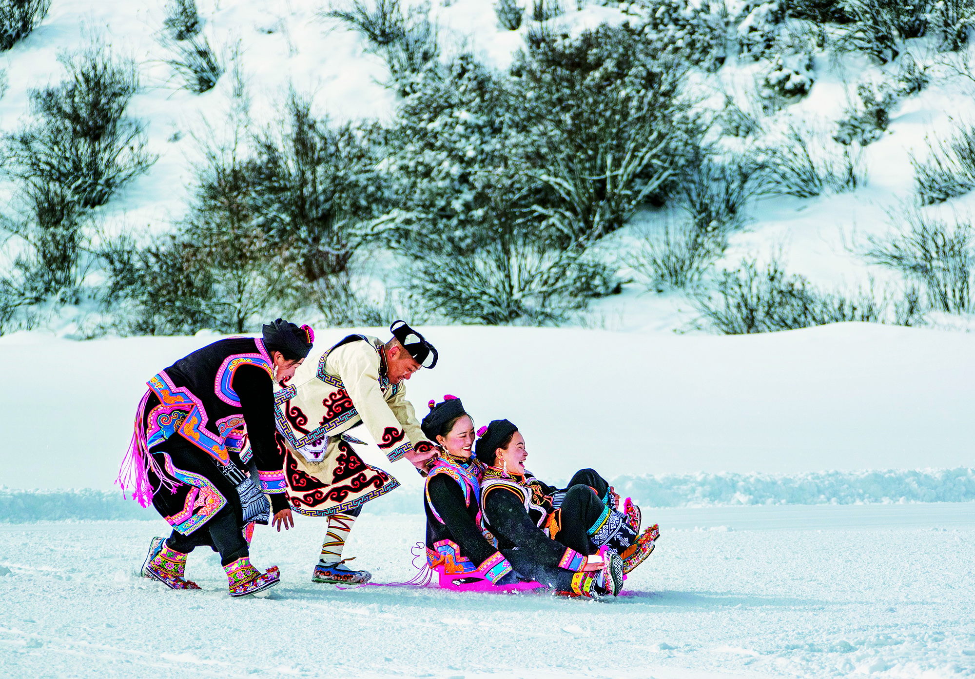 People of the Qiang ethnic group sled on snow as the 8th National Public Ice and Snow Season
