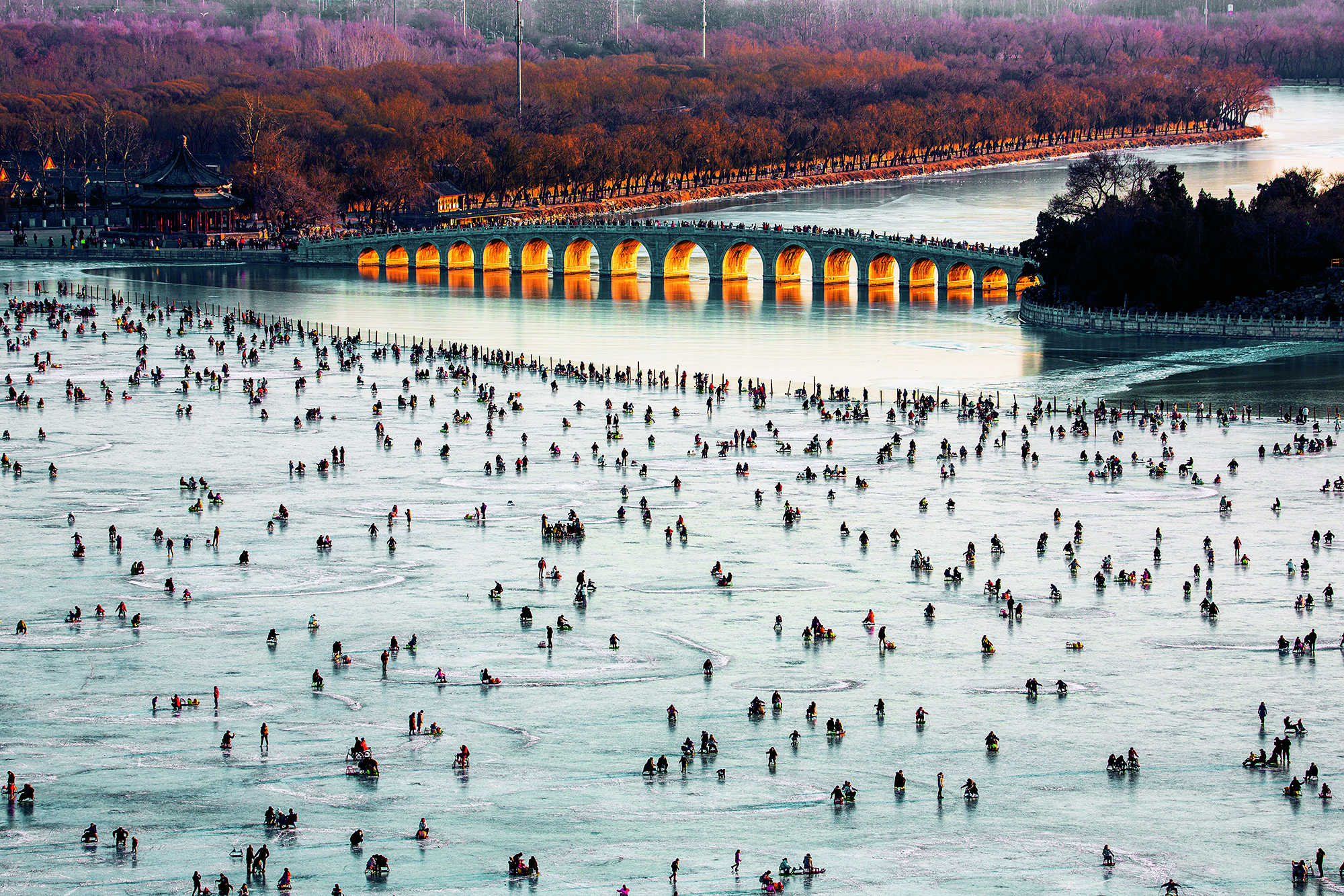 Visitors enjoy ice sports on the frozen Kunming Lake at the Summer Palace in Beijing on January 4, 2020.