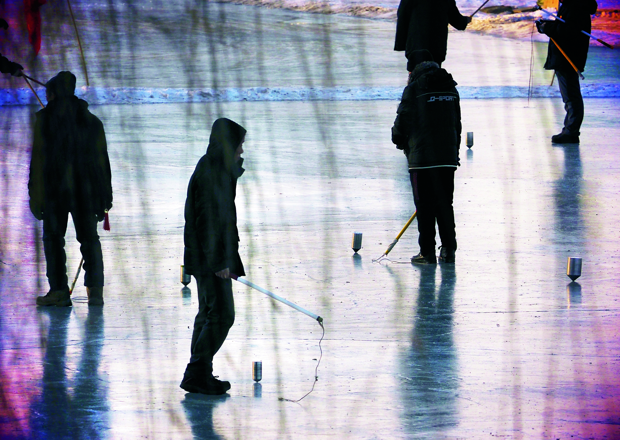People whip spinning tops on the frozen lake surface at a park in the city of Jilin, Jilin Province, on December 21, 2017.