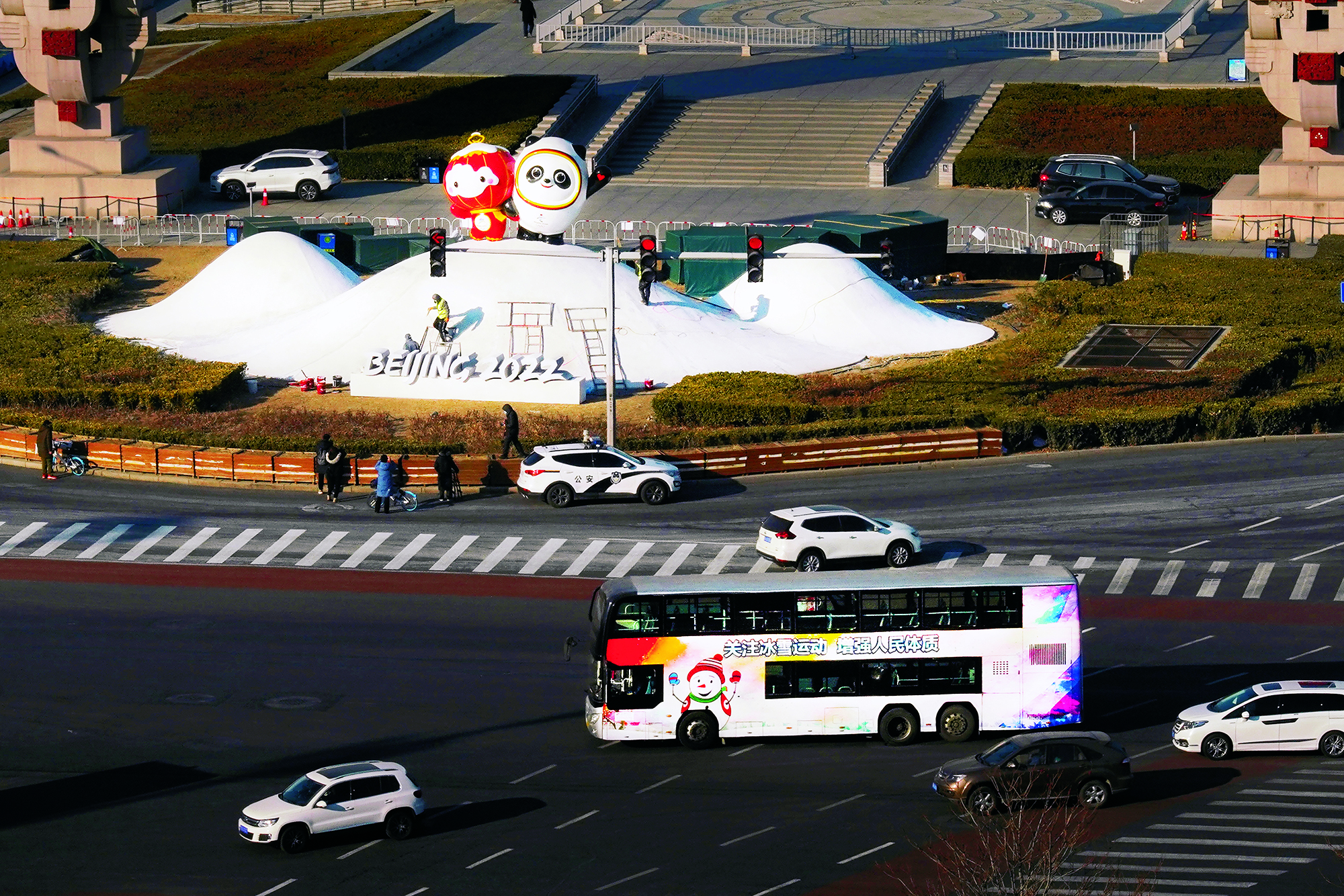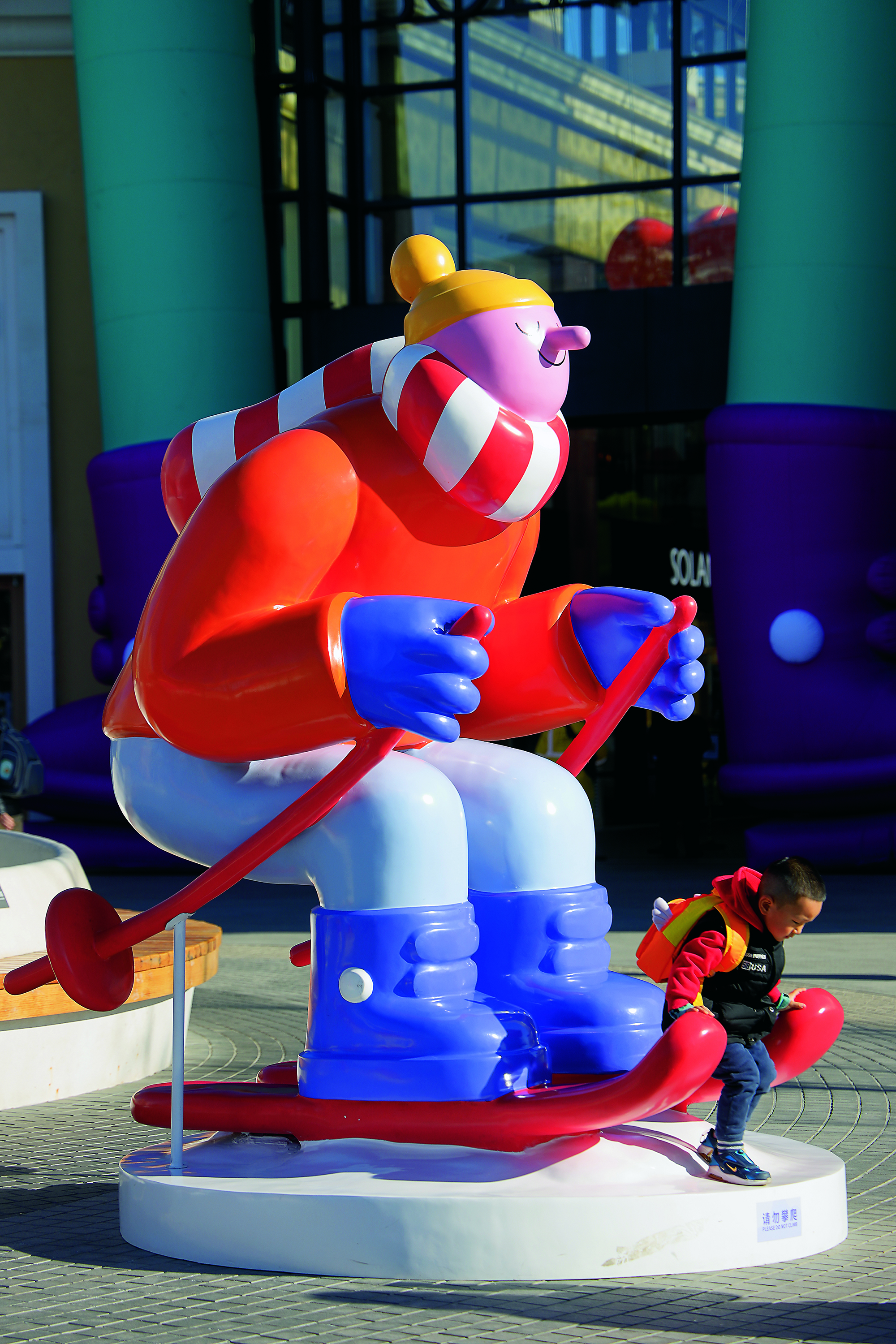 2021年12月6日,北京,一个小朋友在蓝色港湾与展出的冰雪运动主题艺术装置合影