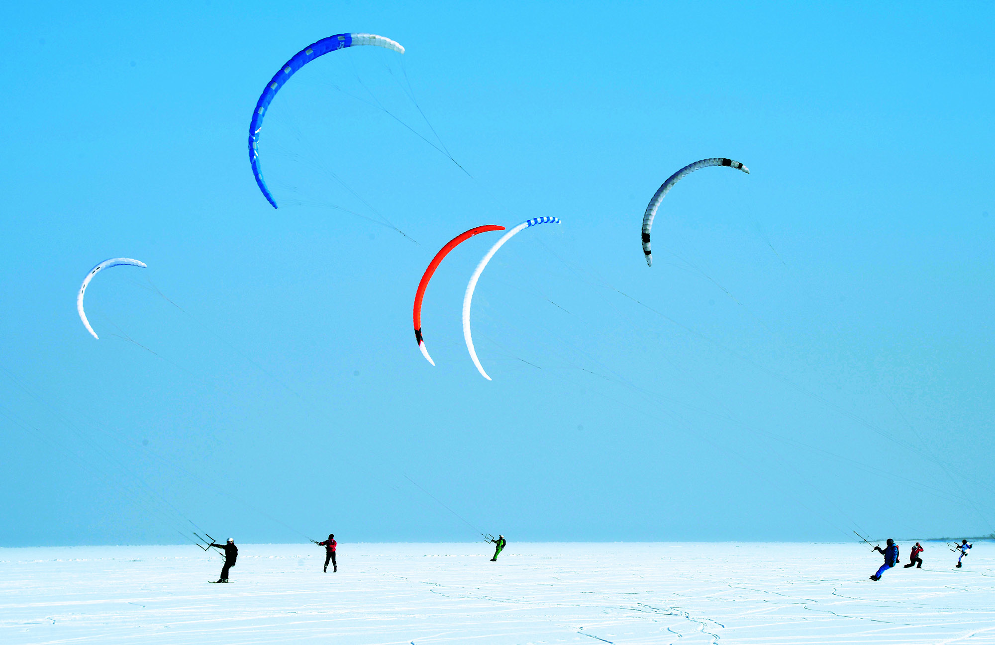2021年1月5日,黑龙江省哈尔滨市,伞翼滑雪爱好者在近零下30摄氏度的松花江冰面上 进行滑雪锻炼。伞翼滑雪运动是伞翼冲浪和滑雪相结合的一项最新雪上体育运动项目, 集速度与飞行于一体,极具观赏性和娱乐性