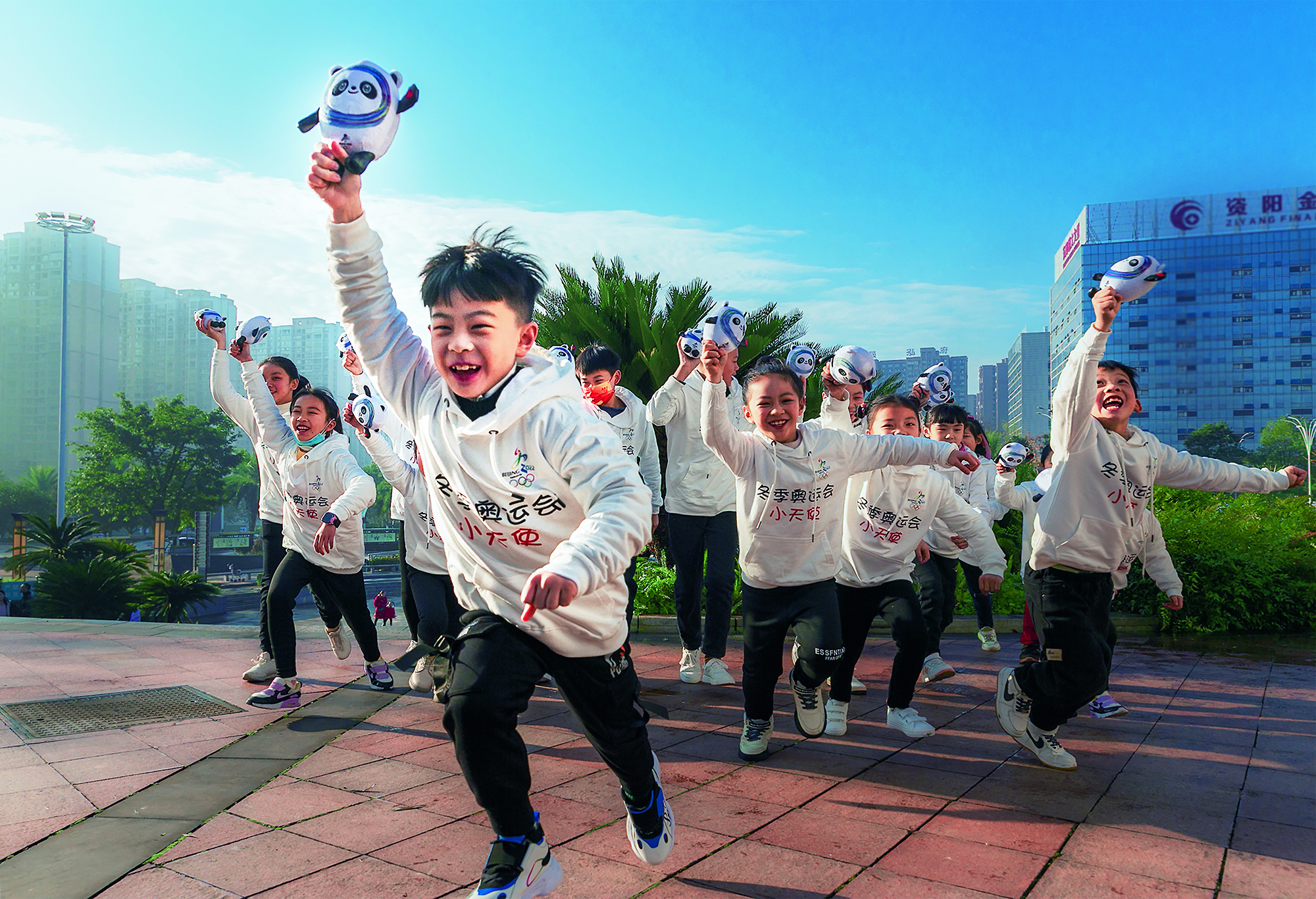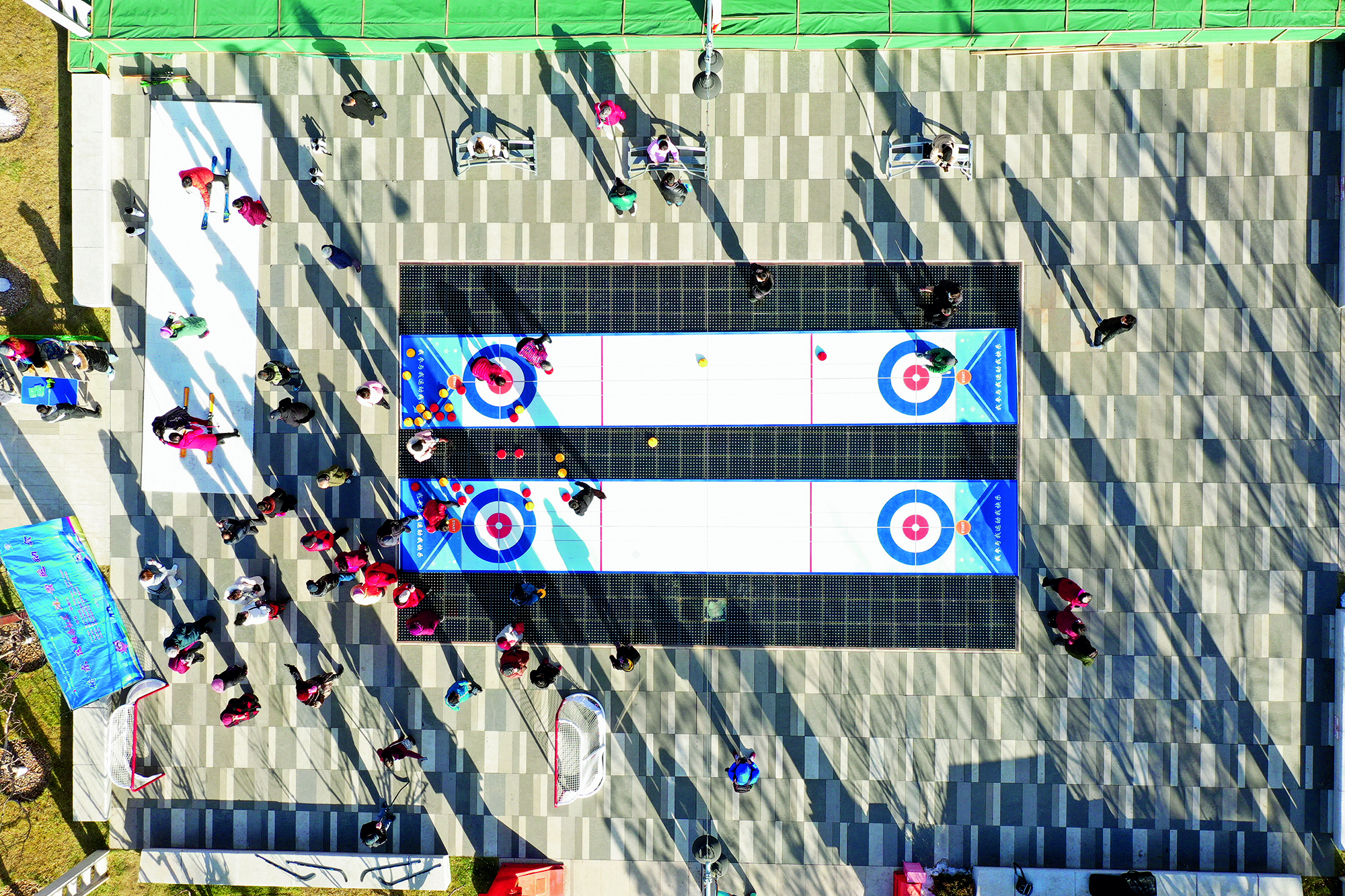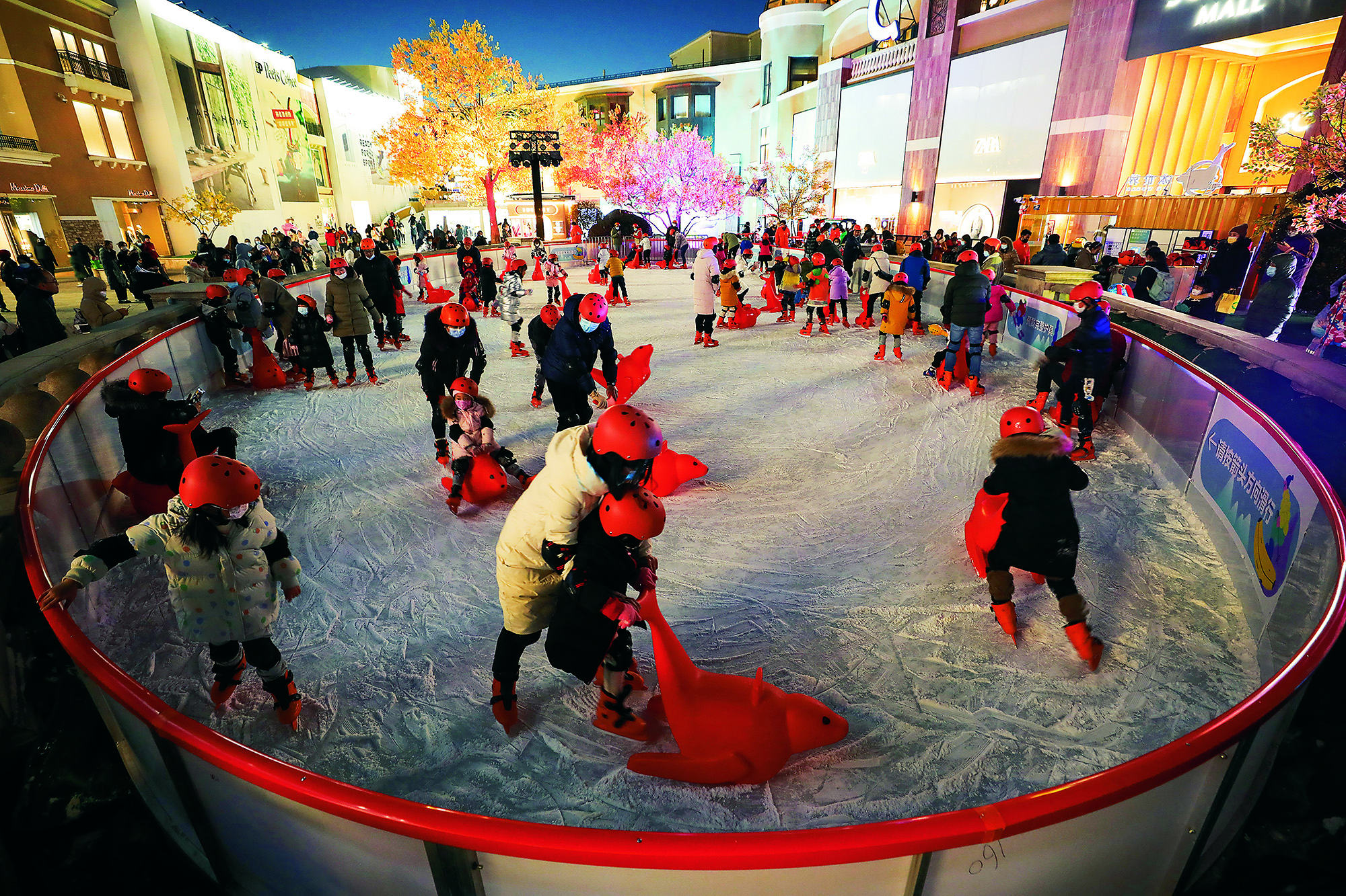 People enjoy ice sports at a square in the North Bund of Shanghai on January 12, 2021. To welcome the Beijing 2022 Winter Olympics, the Shanghai government built skating and skiing venues with public access in the city.
