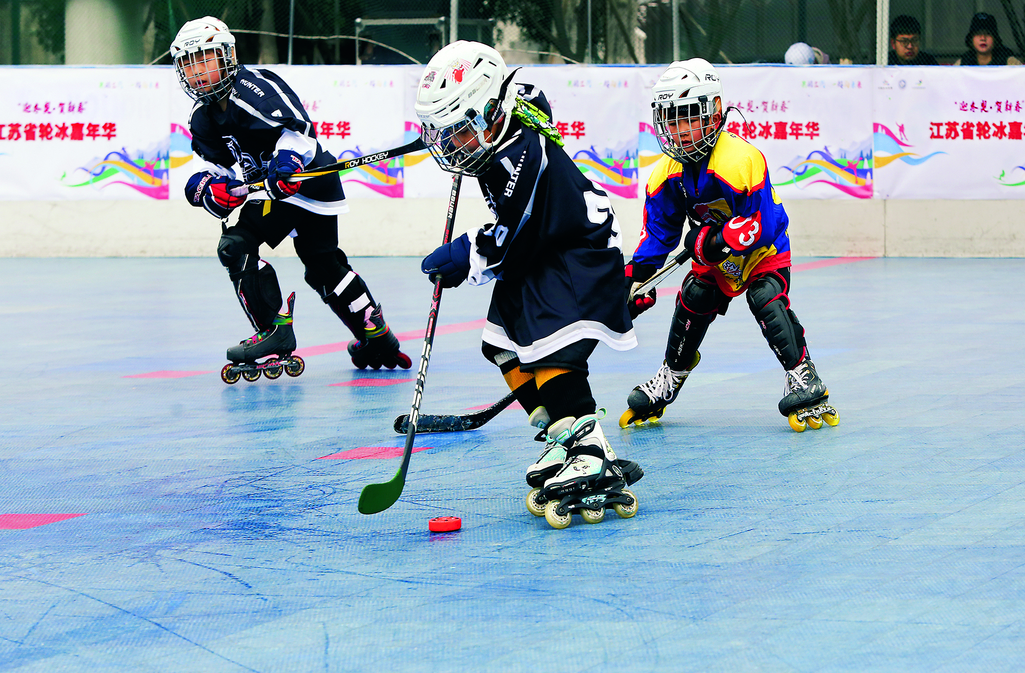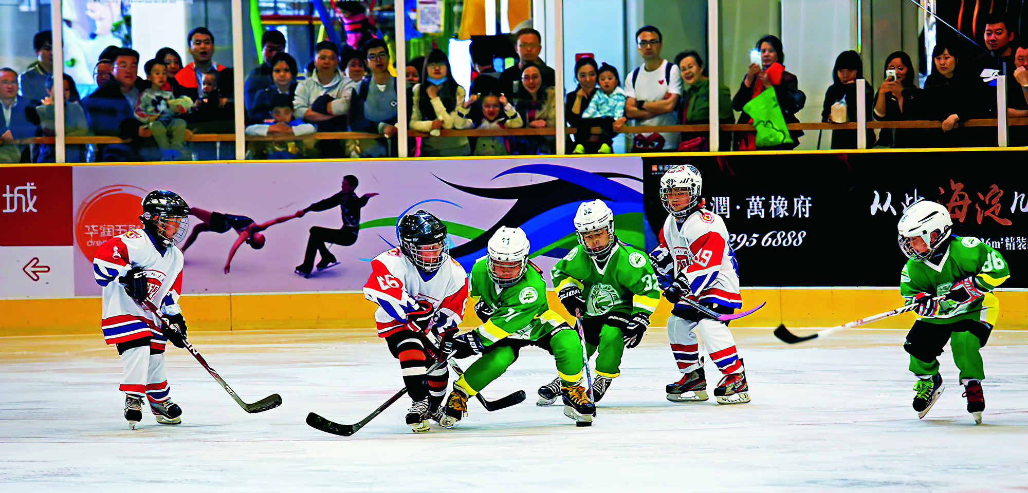 2016年4月16日,北京,小选手们在清河五彩城大厦滑冰场举行的 “ 首届海淀区中小学冰球比赛 ” 上奋力拼抢