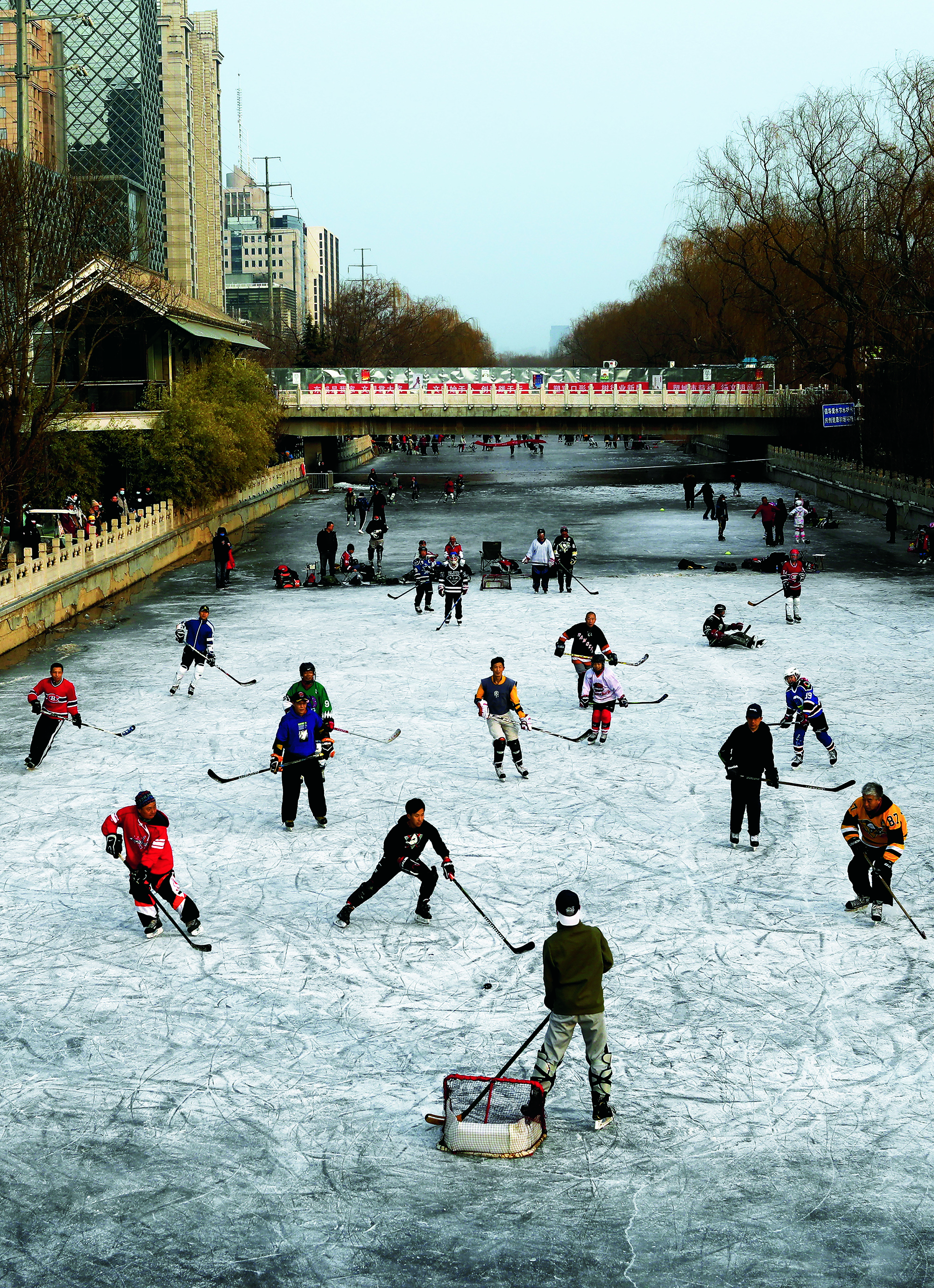 2022年1月16日,北京,市民们在海淀区金沟河冰冻的河面上享受滑冰的乐趣